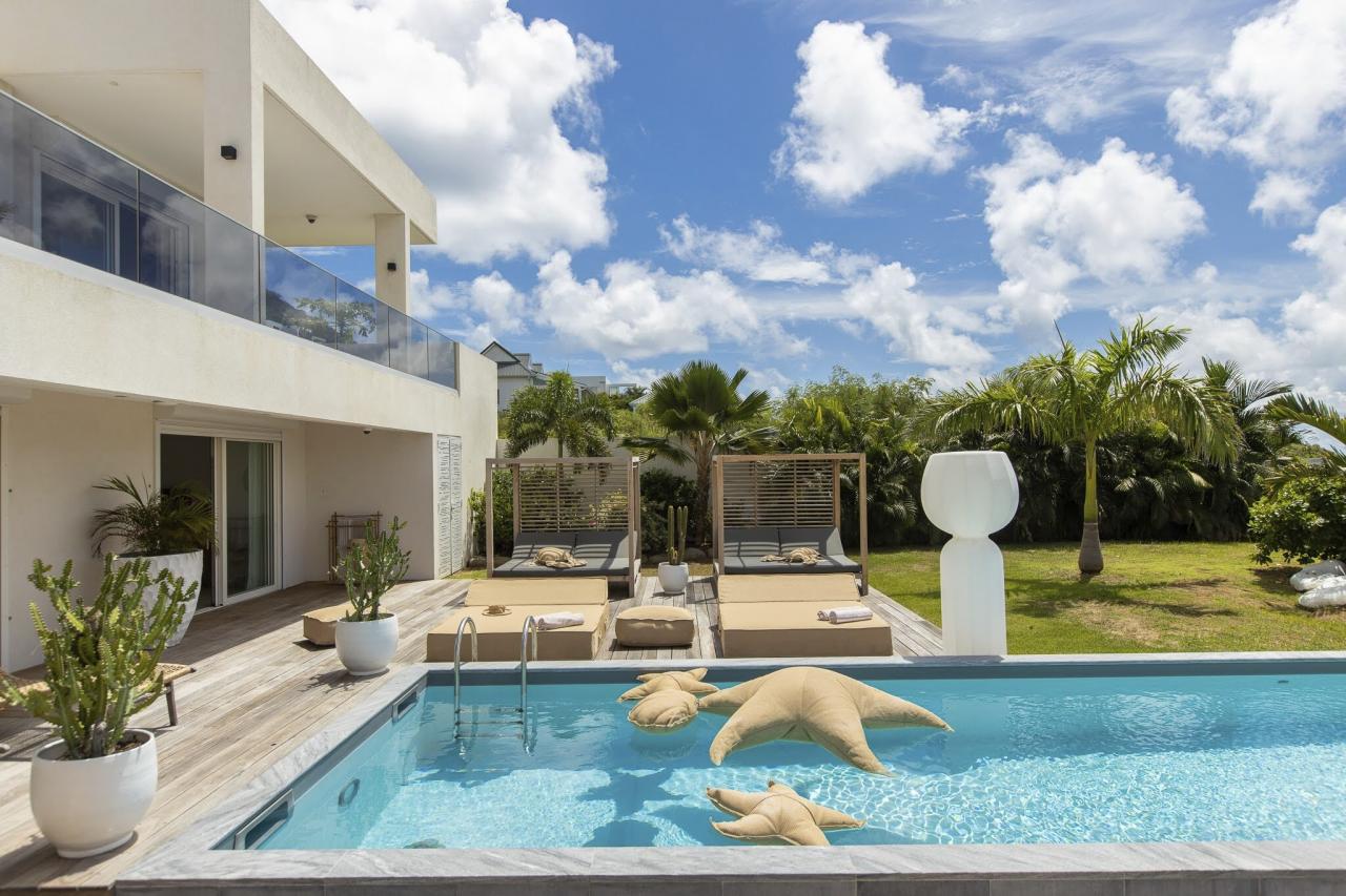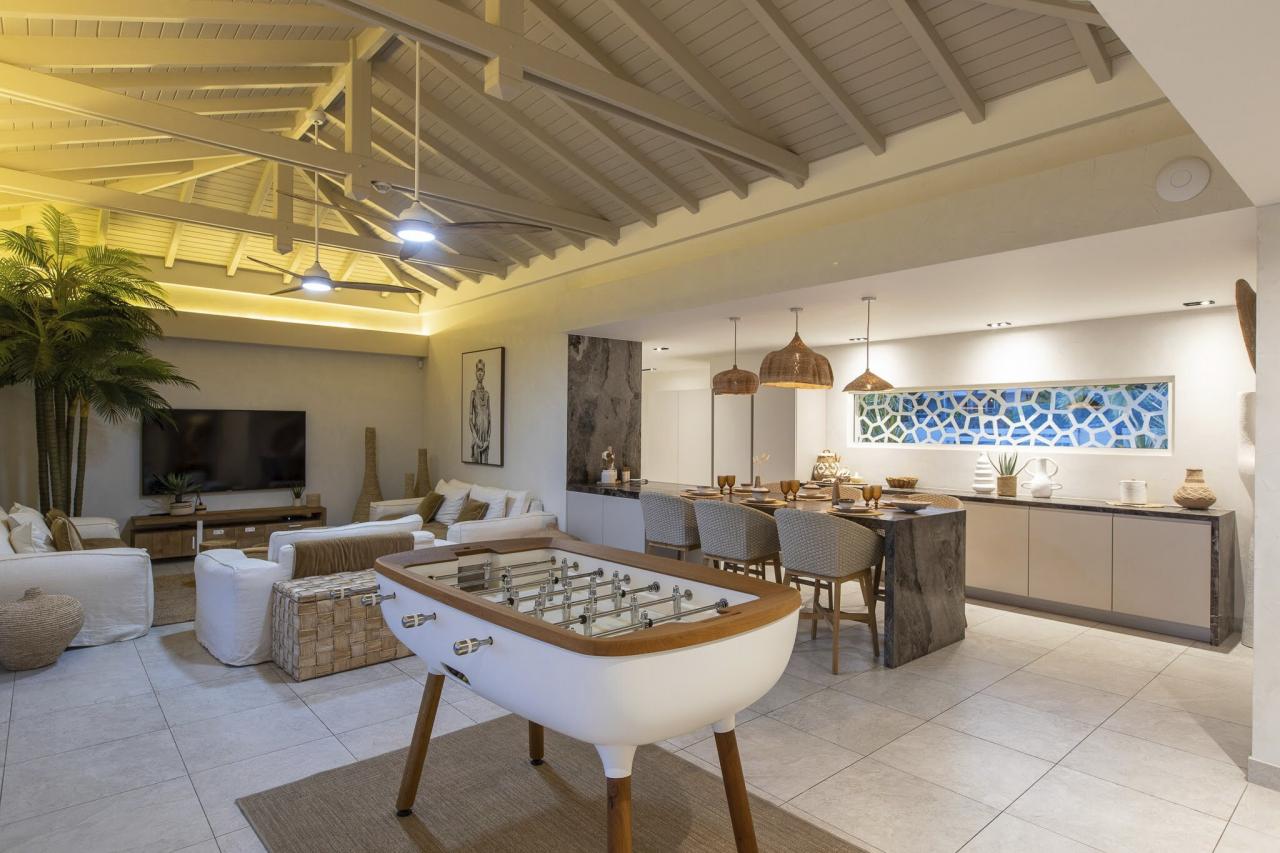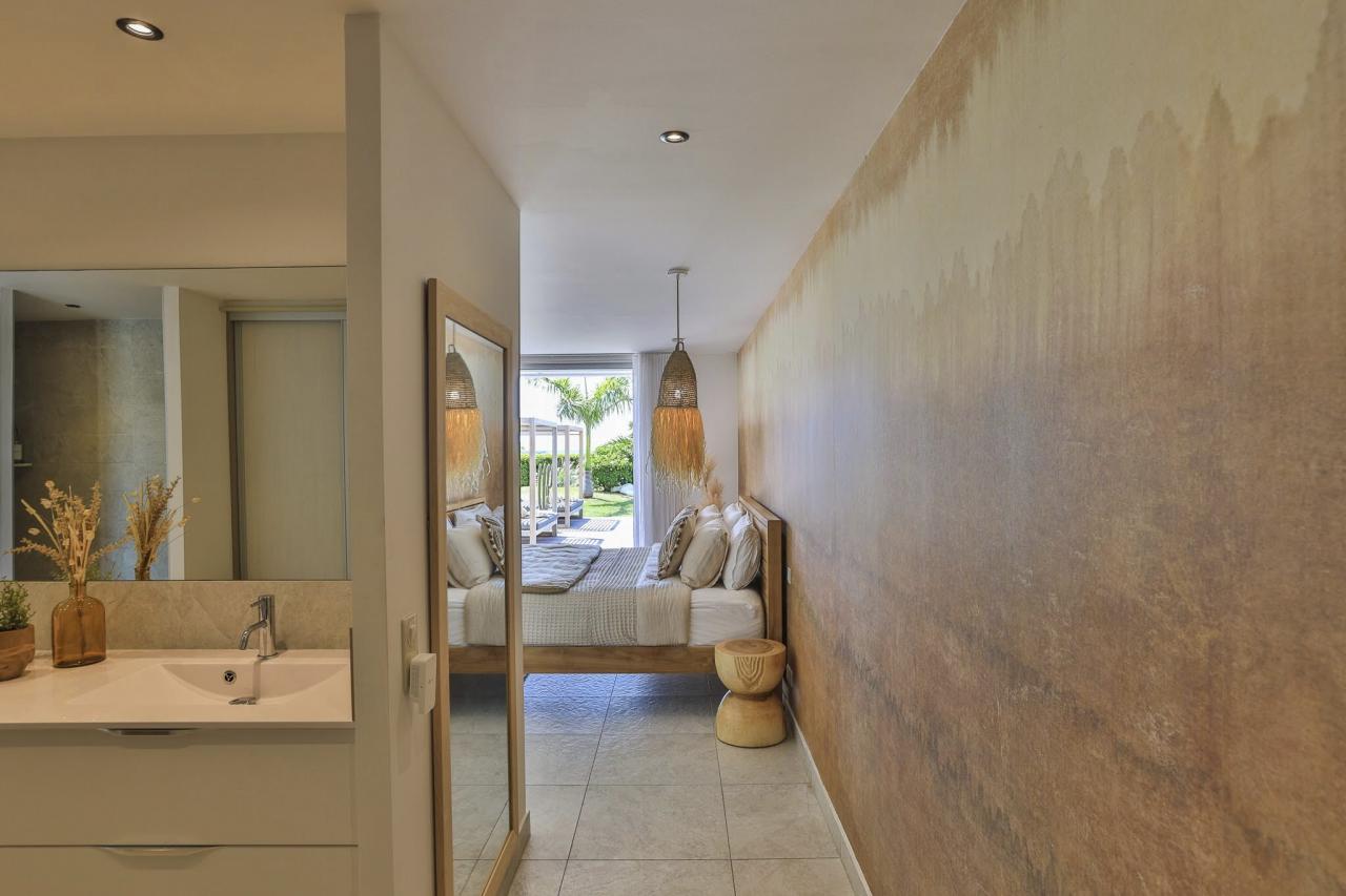 The lower level of Villa Vogue Art is a sanctuary of tranquility. This floor houses three additional bedrooms, two of which have direct access to the private pool. Each room has its ensuite bathroom, providing an intimate and peaceful retreat. The pool area is surrounded by lounge chairs and relaxing spaces, ideal for soaking up the Caribbean sun or enjoying a refreshing swim at any time of the day.