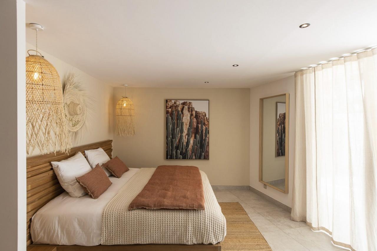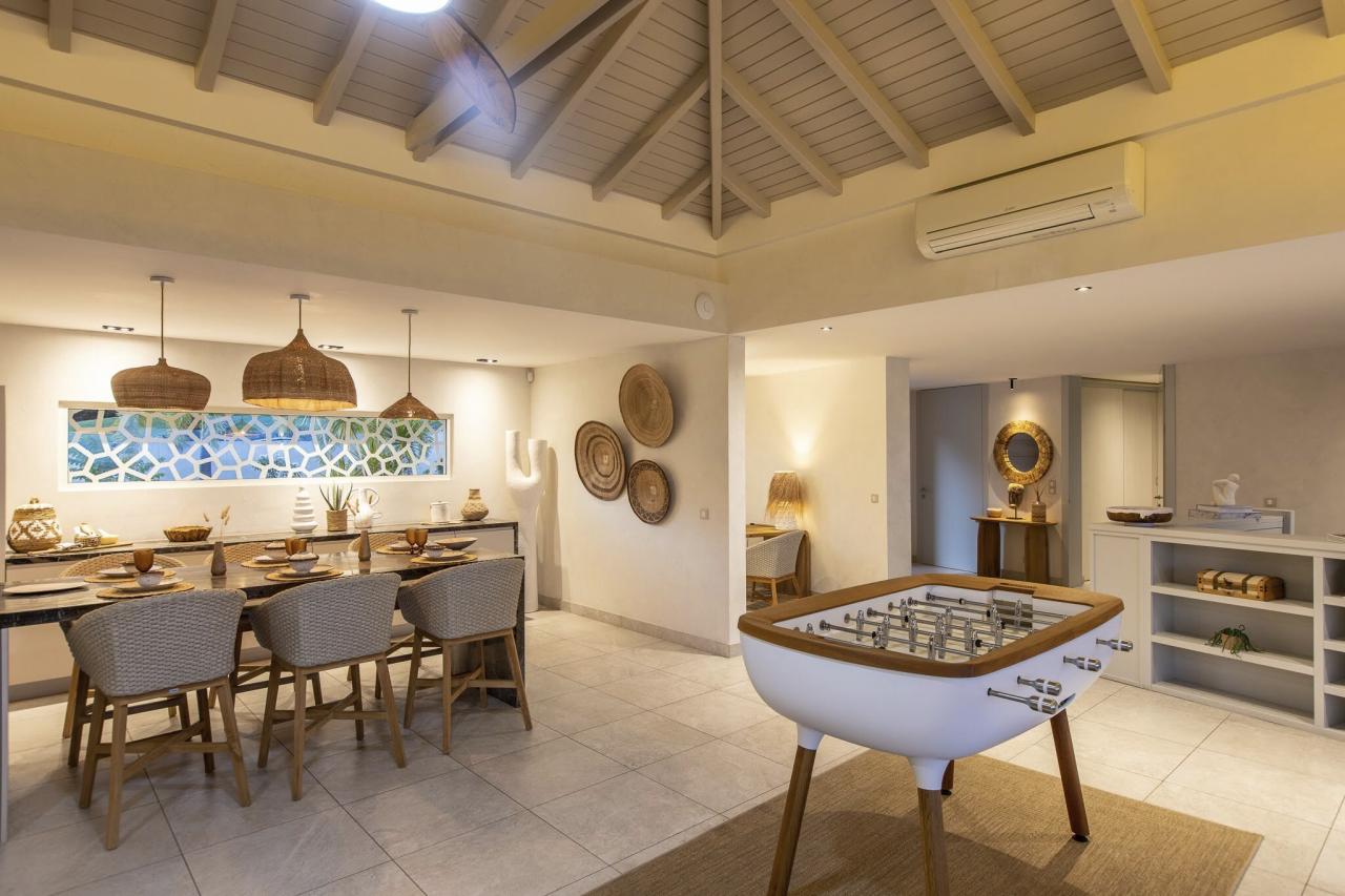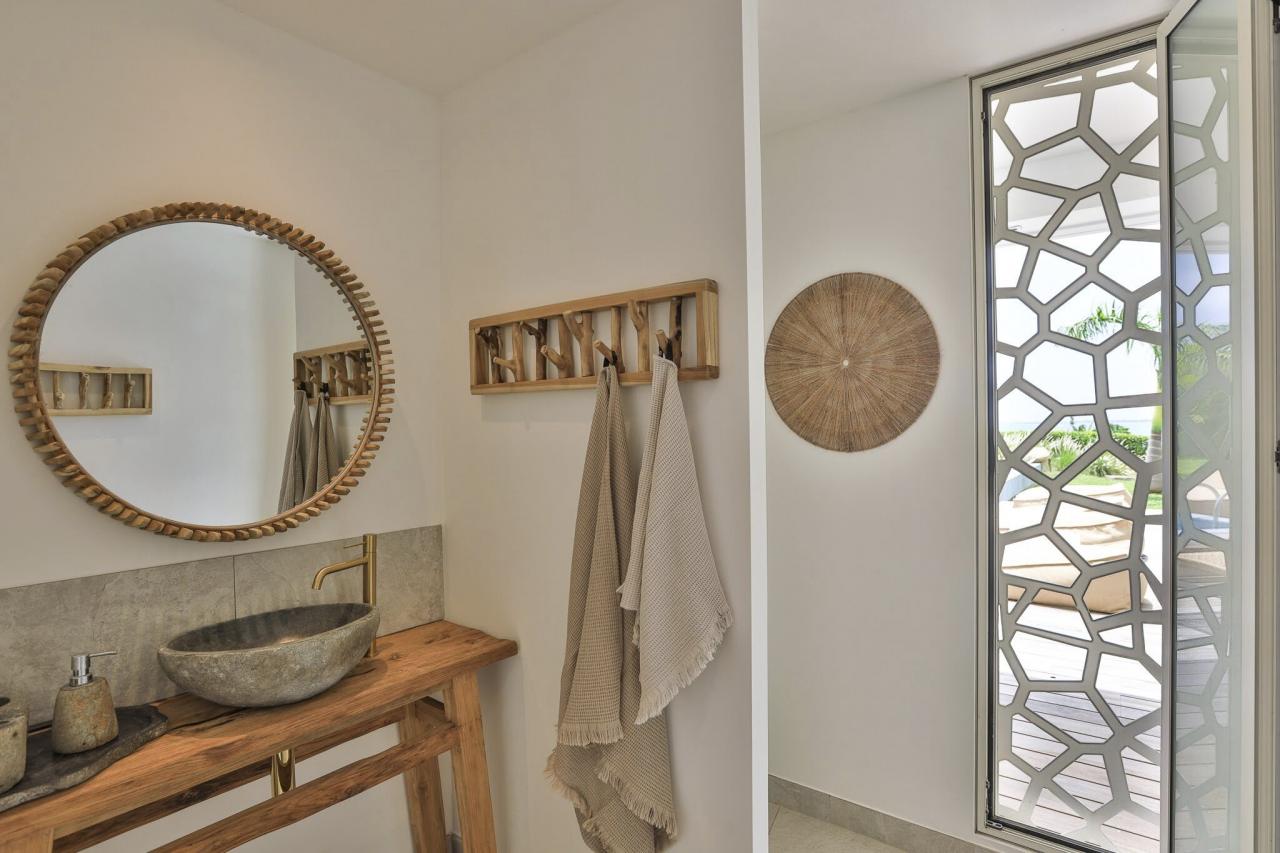 The lower level of Villa Vogue Art is a sanctuary of tranquility. This floor houses three additional bedrooms, two of which have direct access to the private pool. Each room has its ensuite bathroom, providing an intimate and peaceful retreat. The pool area is surrounded by lounge chairs and relaxing spaces, ideal for soaking up the Caribbean sun or enjoying a refreshing swim at any time of the day.