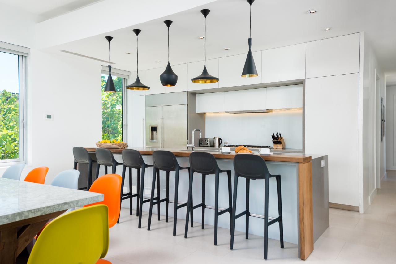 Outside, the pool deck has al-fresco seating with lounging sofas, sun chairs, a poolside day bed, and a fire pit. There is an outdoor kitchen with a wet bar and a large gas barbeque, the perfect place to create family lunches and dinners in the Caribbean sun. The pool is 15' by 45' and has a maximum depth of 5', but has an infant section that is only 1' deep. Next to the pool deck, there is a mini turf soccer patch that has two soccer goals.