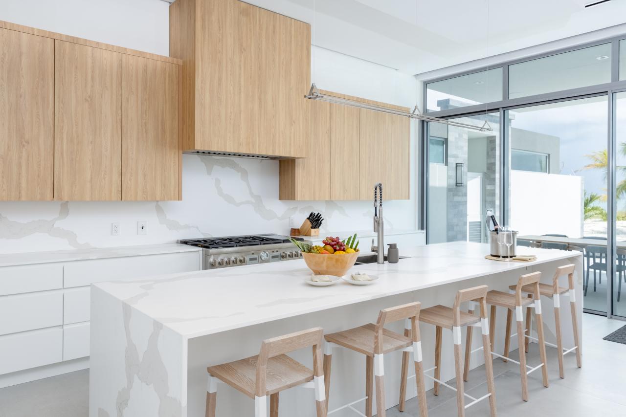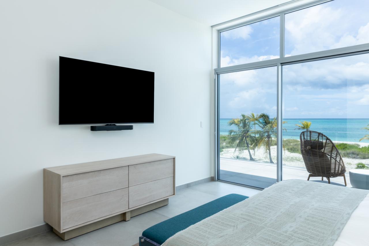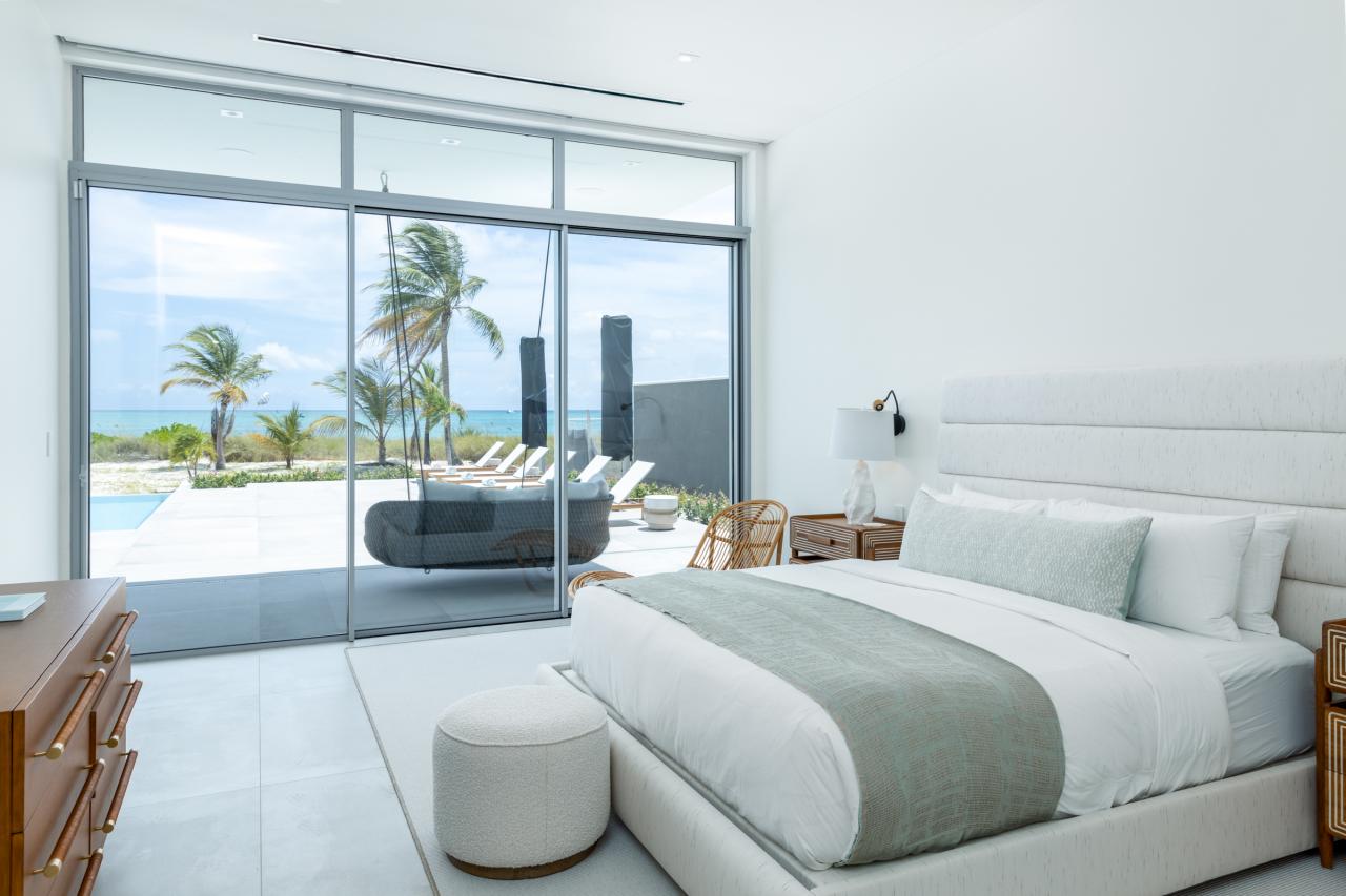 Built to the highest standards, this Turks and Caicos rental offers open-plan living with contemporary designs, warm lighting, natural stone, granite, and quartz finishes. High ceilings and floor-to-ceiling windows fill the space with natural light, while a glass balcony and poolside terrace provide breathtaking views of the beach and turquoise sea.