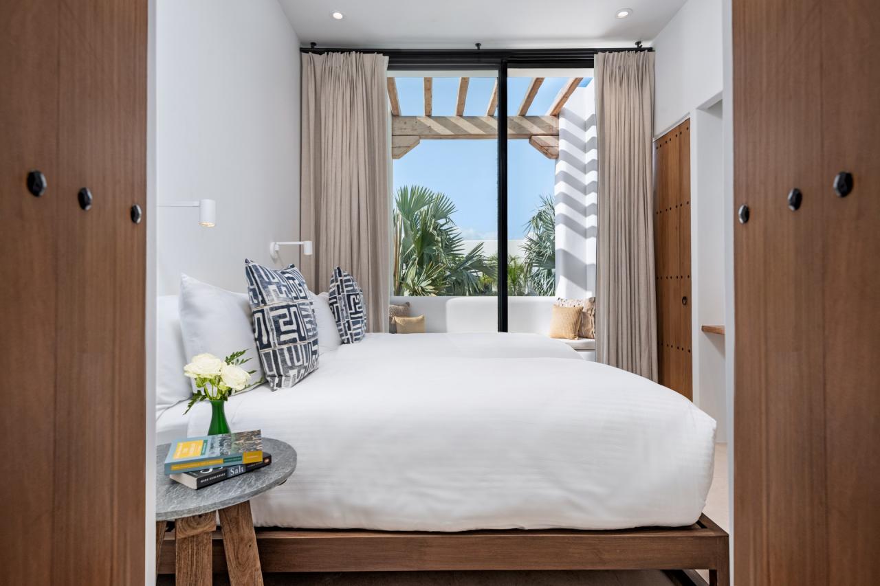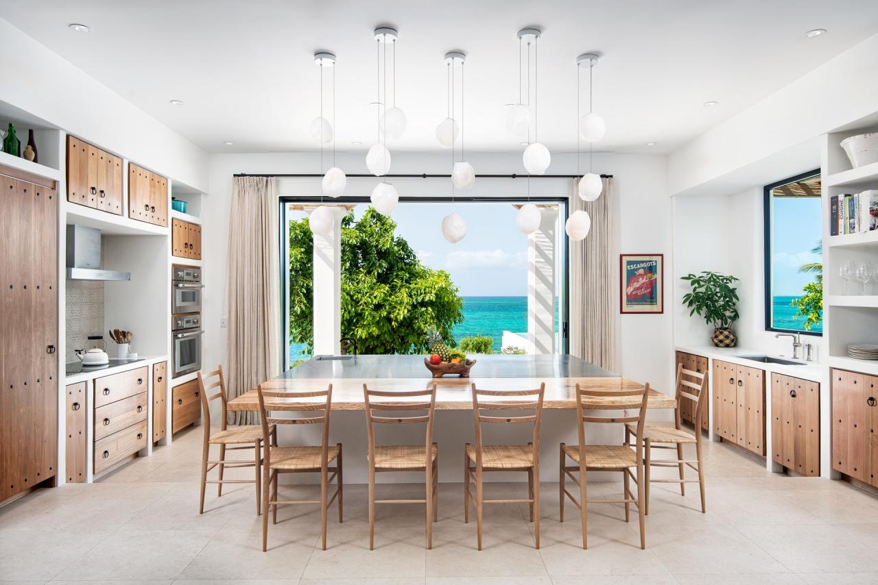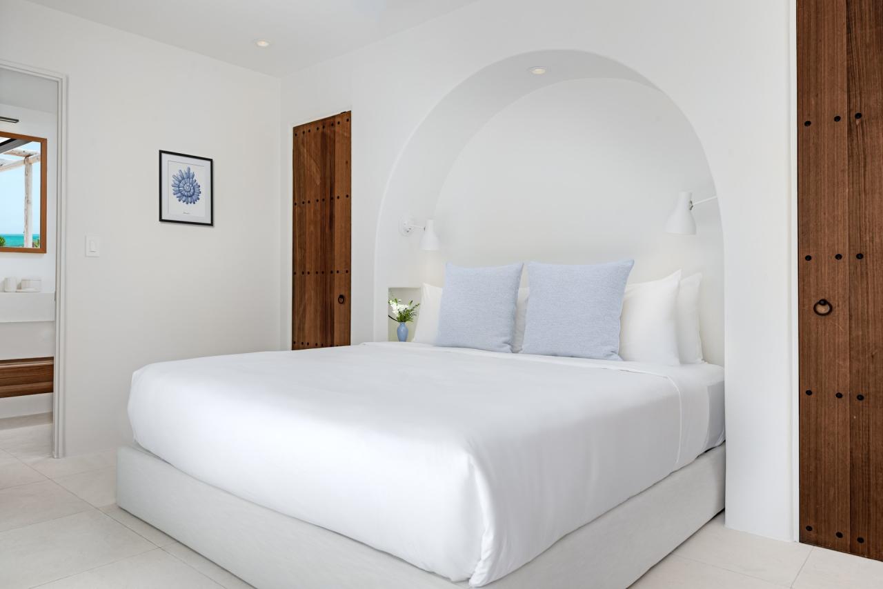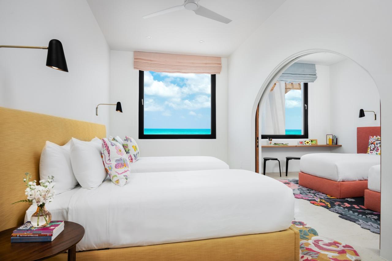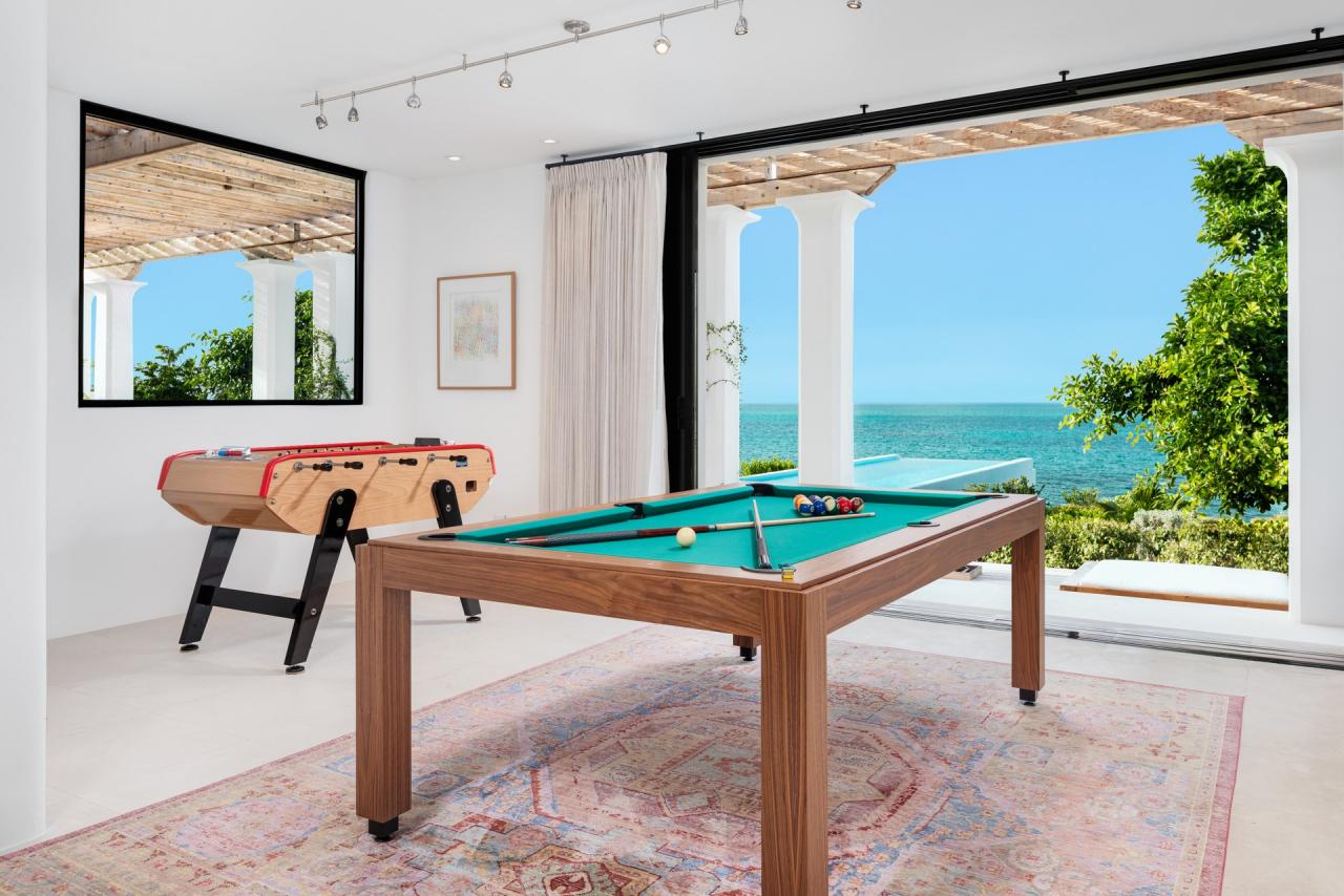 The interiors of CA'55 reflect a Mediterranean Finca style, with timbered beams, intricate cabinetry, and a Murano glass chandelier that serves as a centerpiece. The décor is thoughtfully curated to promote relaxation, combining eclectic Mediterranean patterns and artwork. This Turks and Caicos rental also includes a two-bedroom guest annex with a dining pavilion, yoga deck, fire pit, and a range of amenities such as a games room, media center, and gym, making it a unique and vibrant island getaway.
