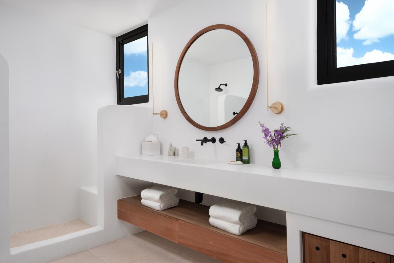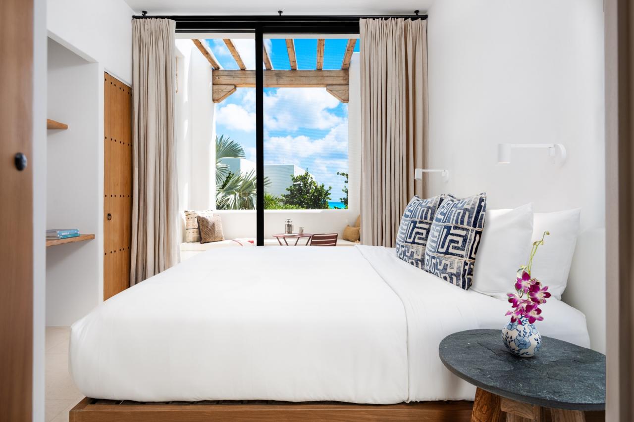 CA'55 is a stunning Turks and Caicos villa retreat inspired by Balearic design, set on the Blue Mountain hillside with breathtaking views of the Princess Alexandra National Park. The property features terraces and whitewashed architecture that blend naturally with the lush surroundings of green foliage and colorful blossoms. Tropical fruit trees and vibrant marine life add to its charm. The outdoor spaces, including a lounging area and infinity pool, are designed to harmonize with the natural landscape, making for a relaxing Turks and Caicos vacation.