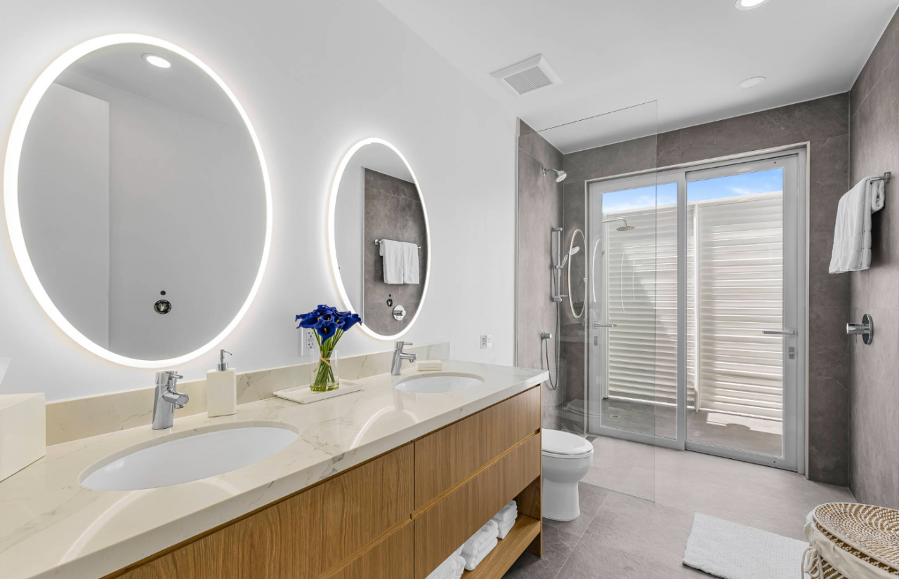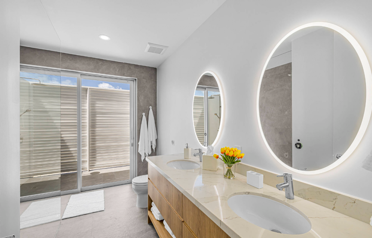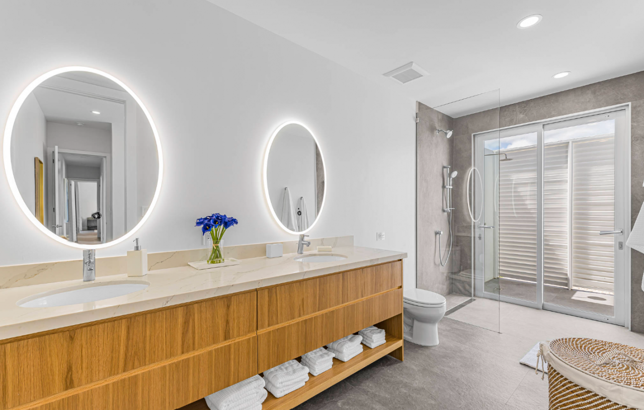 Bedroom 1: Primary, king bed, pool area access, ensuite bath, double vanity, indoor and outdoor showers.