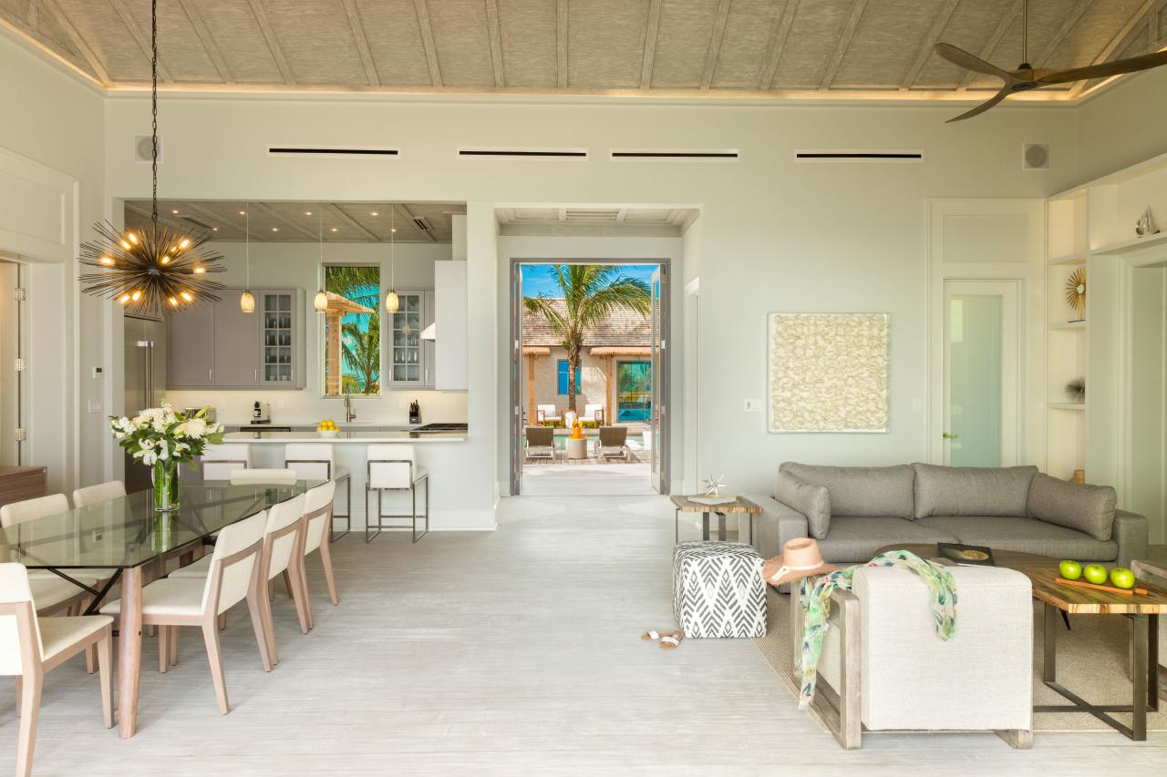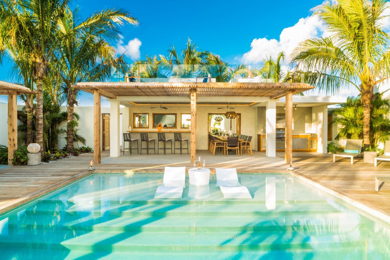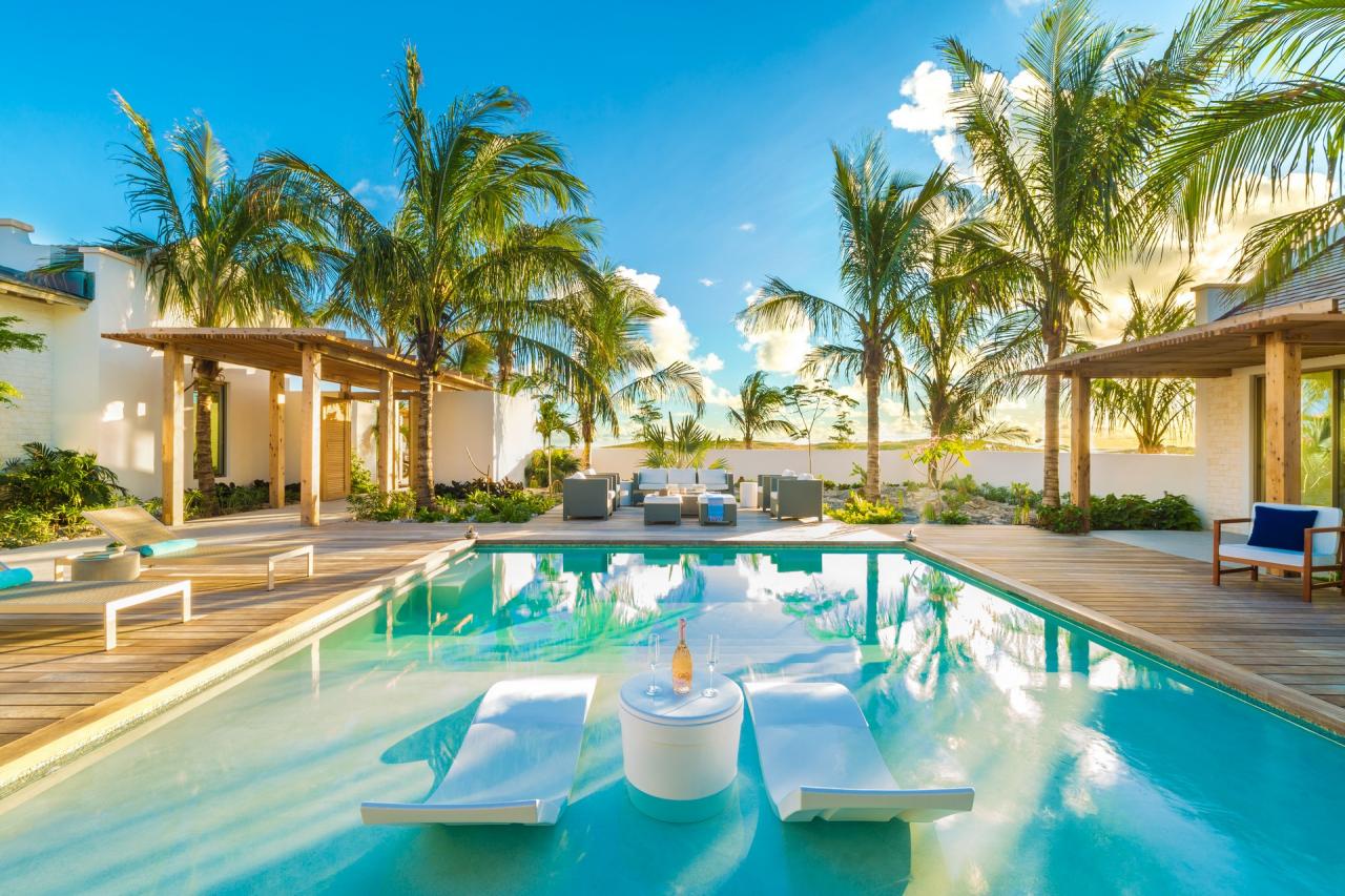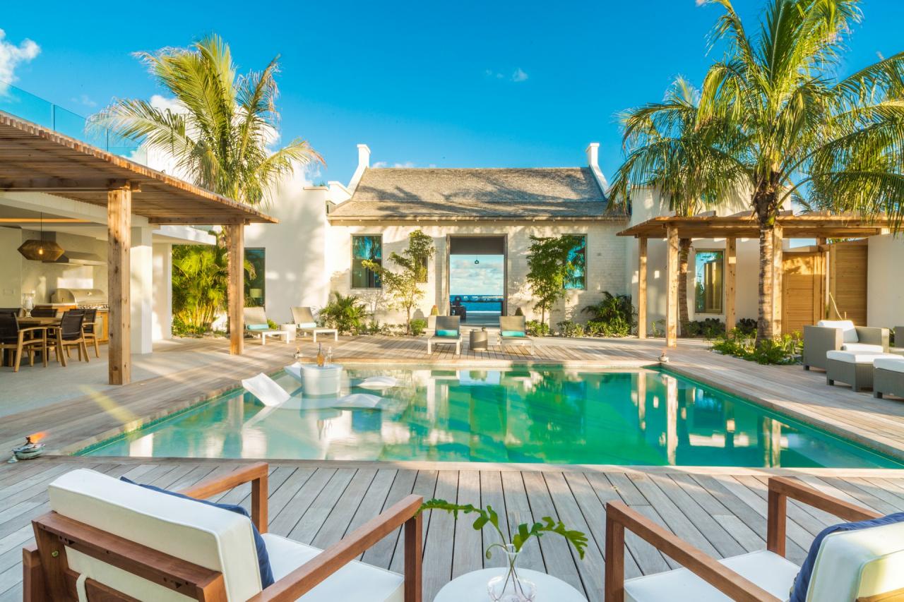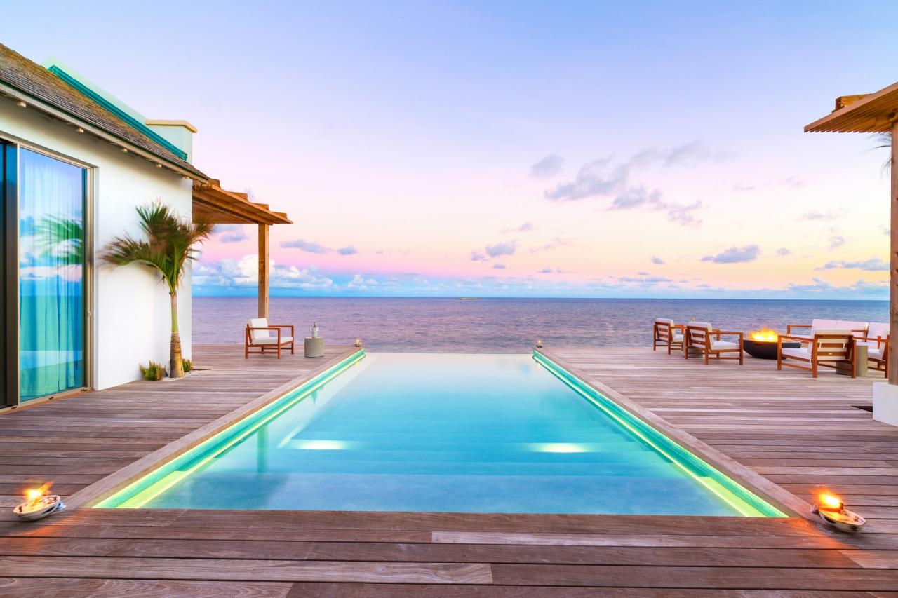 Dream Pavilion is an unbelievably picturesque villa with its own private beach in Ambergris Cay in Turks and Caicos. Dream Pavilion is a six-bedroom and six-bathroom villa. This remarkable villa offers lush tropical landscaping, three firepits, two heated pools, enclosed outdoor showers for the oceanfront master bedrooms, and personal electric golf carts for local transportation. This Turks and Caicos rental also features a full kitchen and dining area, eight large screen smart TVs, and stunning views of the surrounding nature.