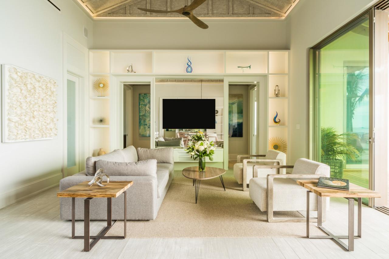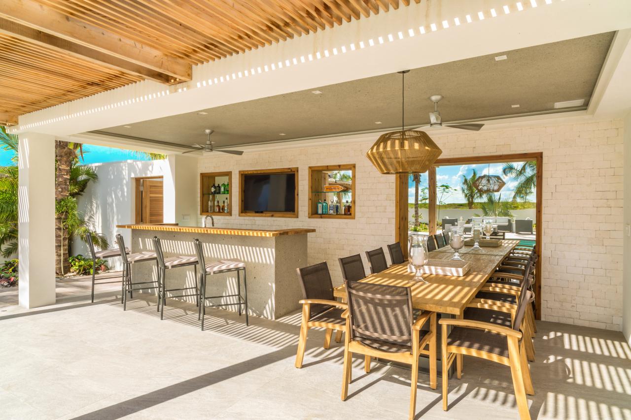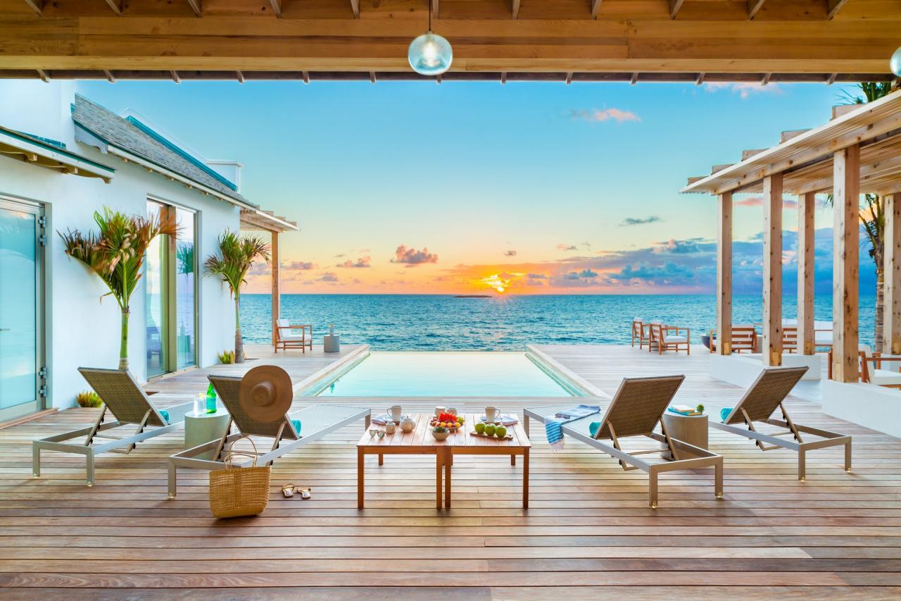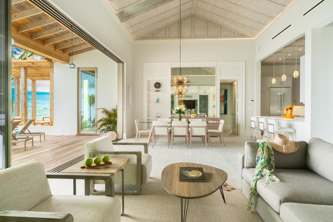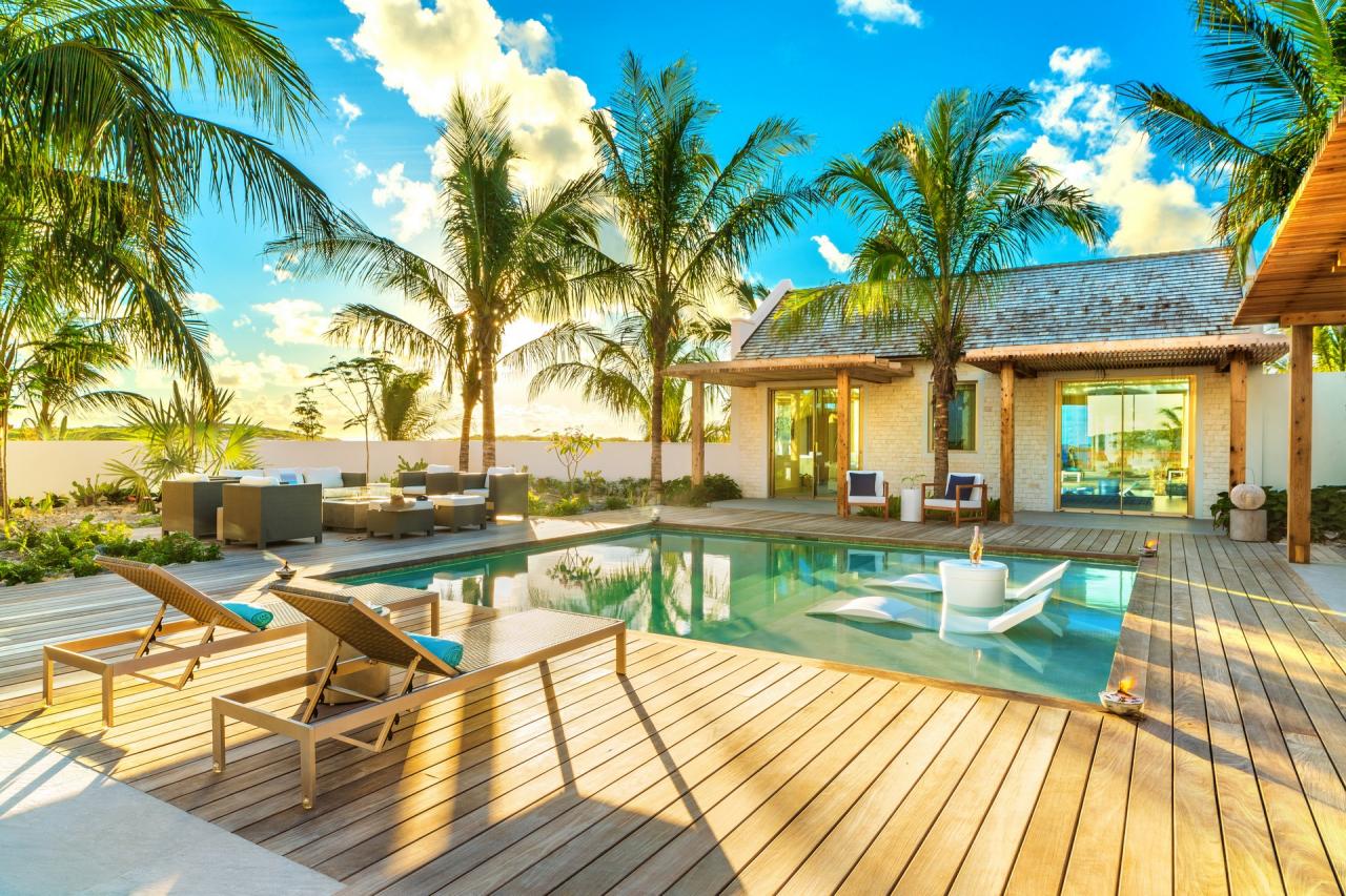 Dream Pavilion is an unbelievably picturesque villa with its own private beach in Ambergris Cay in Turks and Caicos. Dream Pavilion is a six-bedroom and six-bathroom villa. This remarkable villa offers lush tropical landscaping, three firepits, two heated pools, enclosed outdoor showers for the oceanfront master bedrooms, and personal electric golf carts for local transportation. This Turks and Caicos rental also features a full kitchen and dining area, eight large screen smart TVs, and stunning views of the surrounding nature.