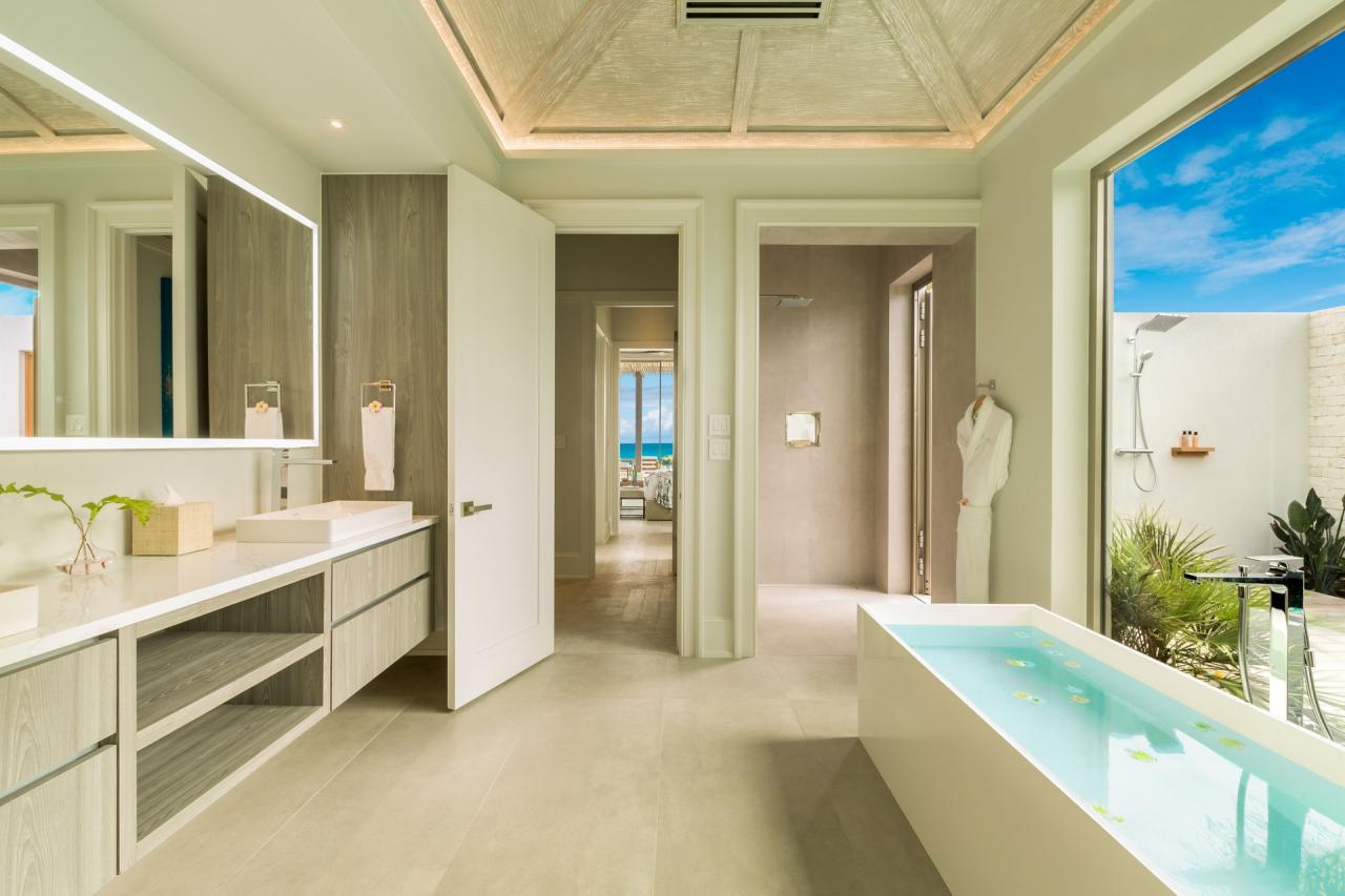 Principal Suite 1: This room has a king-sized bed, ensuite bathroom with tub, double vanity, indoor and outdoor shower, and an ocean view.