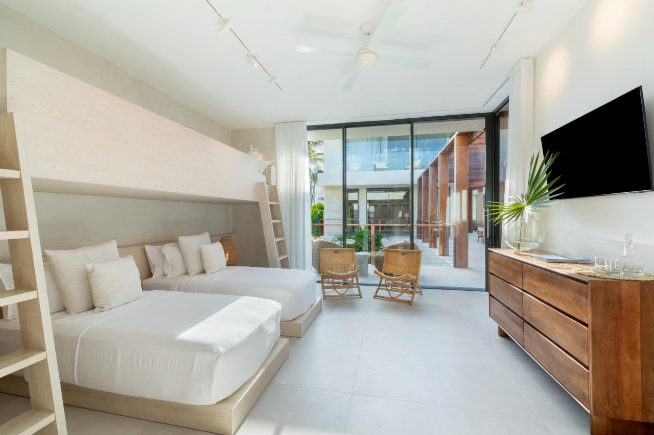 Main House: The main house has three bedrooms upstairs; all rooms have king-sized beds, a balcony, a TV, an open-concept closet with a safe, and an ensuite bathroom with double sinks.