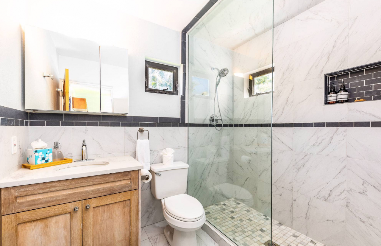 Bedroom 1: King bed, AC, en suite bathroom with shower