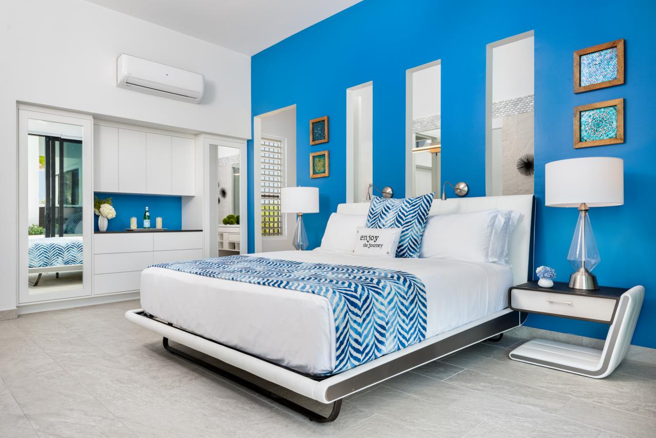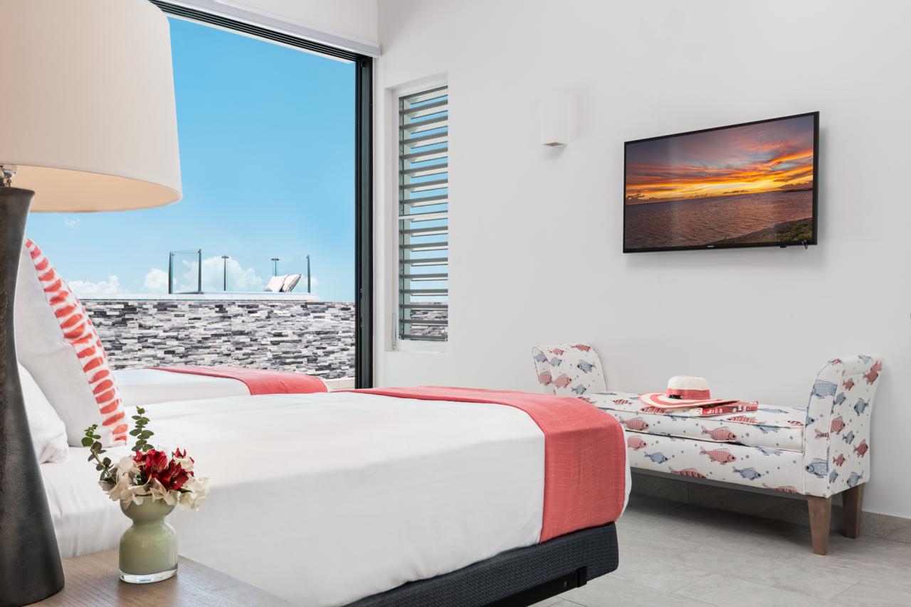 Bedroom 4: The room has a king-sized bed, a TV, air conditioning, a patio/balcony with ocean views, and an ensuite bathroom.