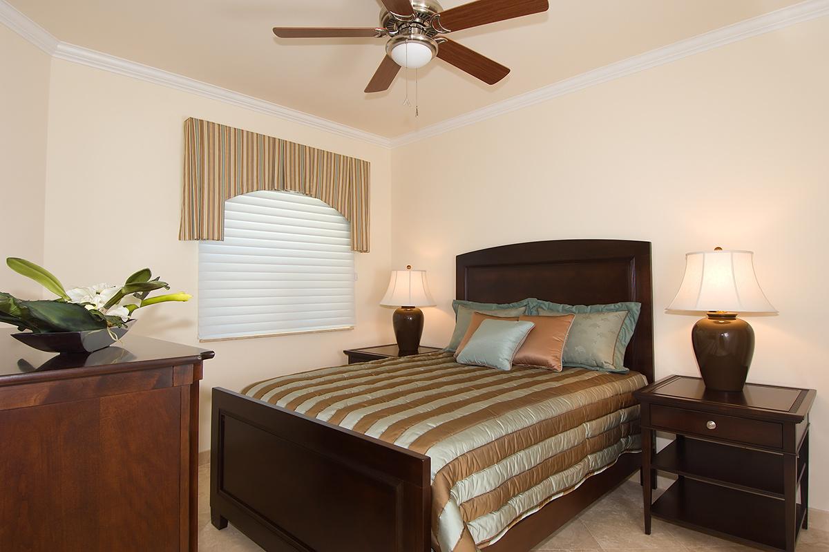 The villa’s master bedroom has a king bed, en-suite bathroom with glass-enclosed shower and soaking tub, and a balcony with ocean views. The other two bedrooms each have queen beds and en-suite bathrooms. Neutral walls and upholstery paired with dark wood furniture creates a restful, comfortable atmosphere.