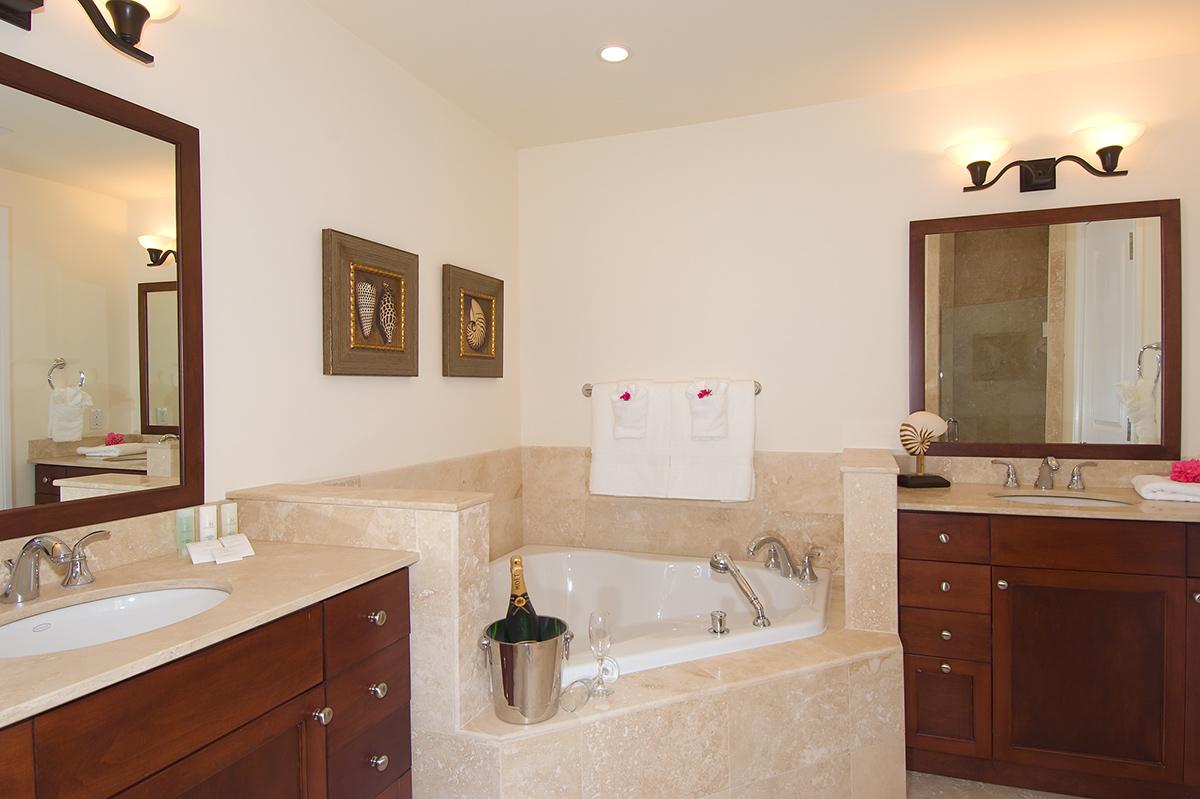 • Bedroom 1: Primary with king bed, en suite bathroom with contoured soaking tub and glass enclosed shower, TV, balcony