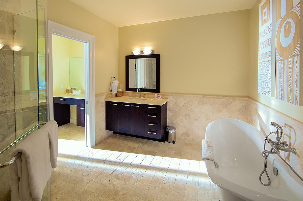 The villa’s three bedrooms offer hotel-worthy accommodations, with en-suite bathrooms, TVs and iPod docks. The master bedroom has a king bed and access to the terrace, a second bedroom has a queen bed and the third bedroom has two twin beds. For larger parties, there’s also a pull-out sofa bed.