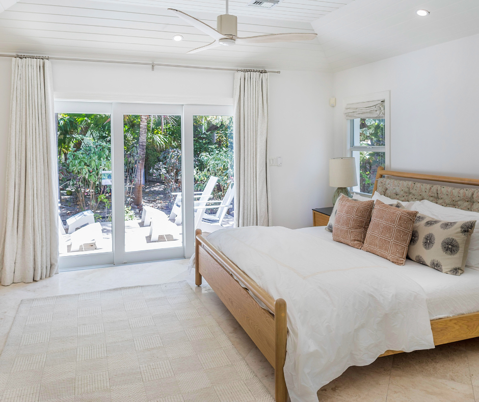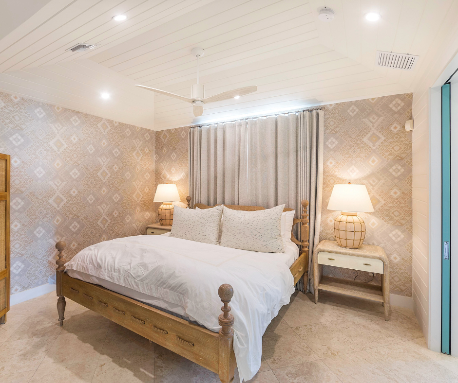 The primary bedroom at Villa Aquazure offers both poolside and beach views, boasting an ensuite bath, outdoor shower, private deck space, and a flat-screen television. The other three bedrooms provide the same amenities but with a garden view. Additionally, a one-bedroom guest house, complete with its own kitchenette, adds extra sleeping space for guests.