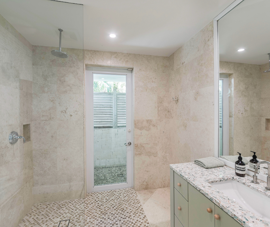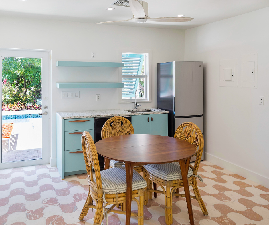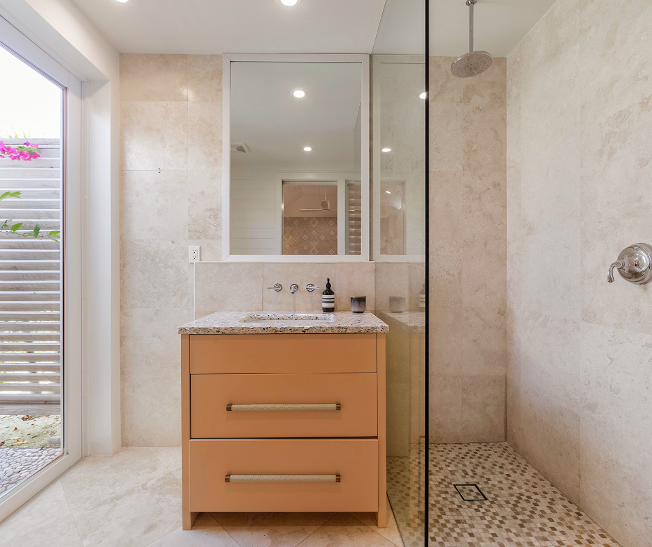 Bedroom 5 (Guest House): King bed with garden view, kitchnette, central AC, ceiling fan, ensuite bathroom with outdoor shower
