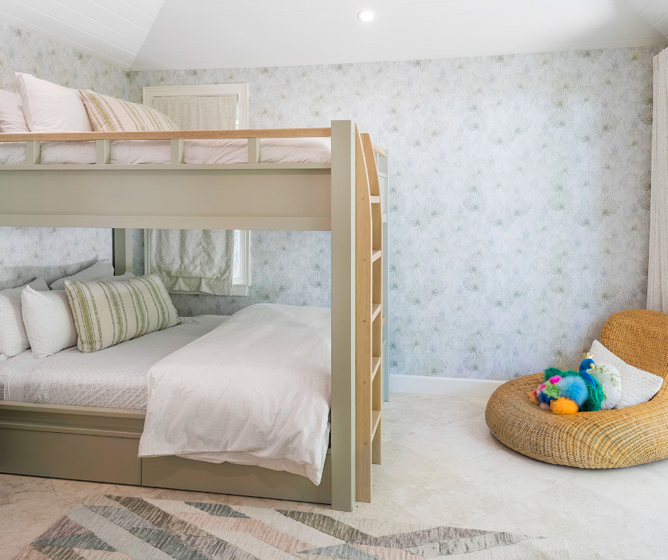 Bedroom 2: Kid's bunk room with garden view, central AC, ceiling fan, ensuite bathroom with outdoor shower and private patio