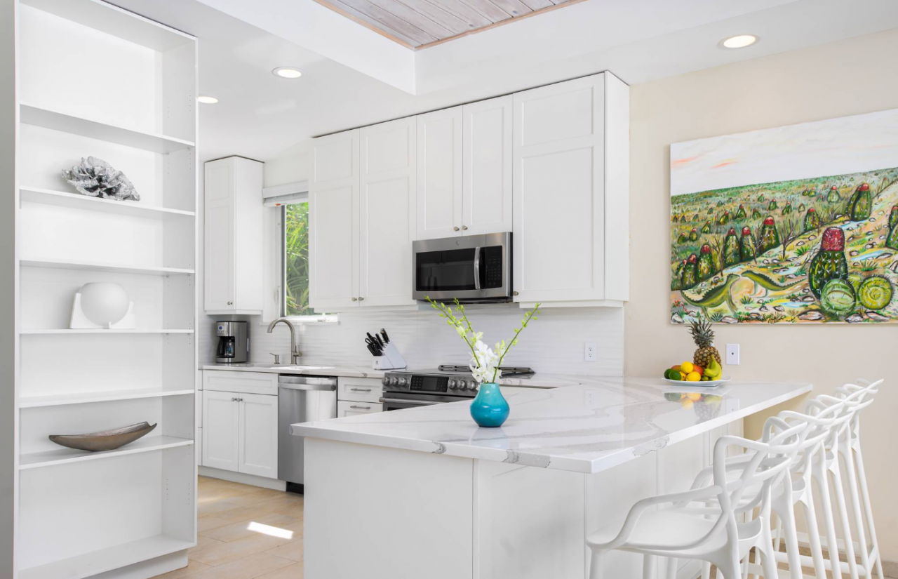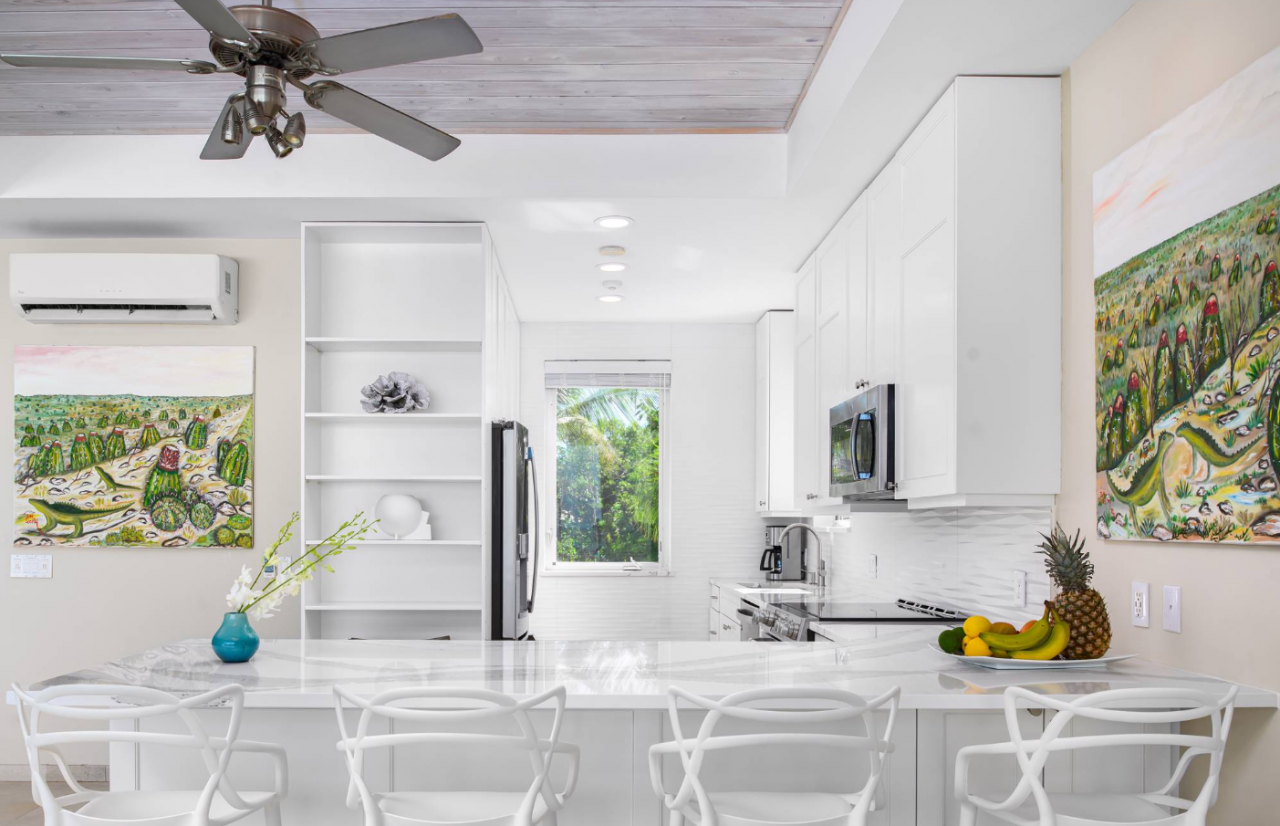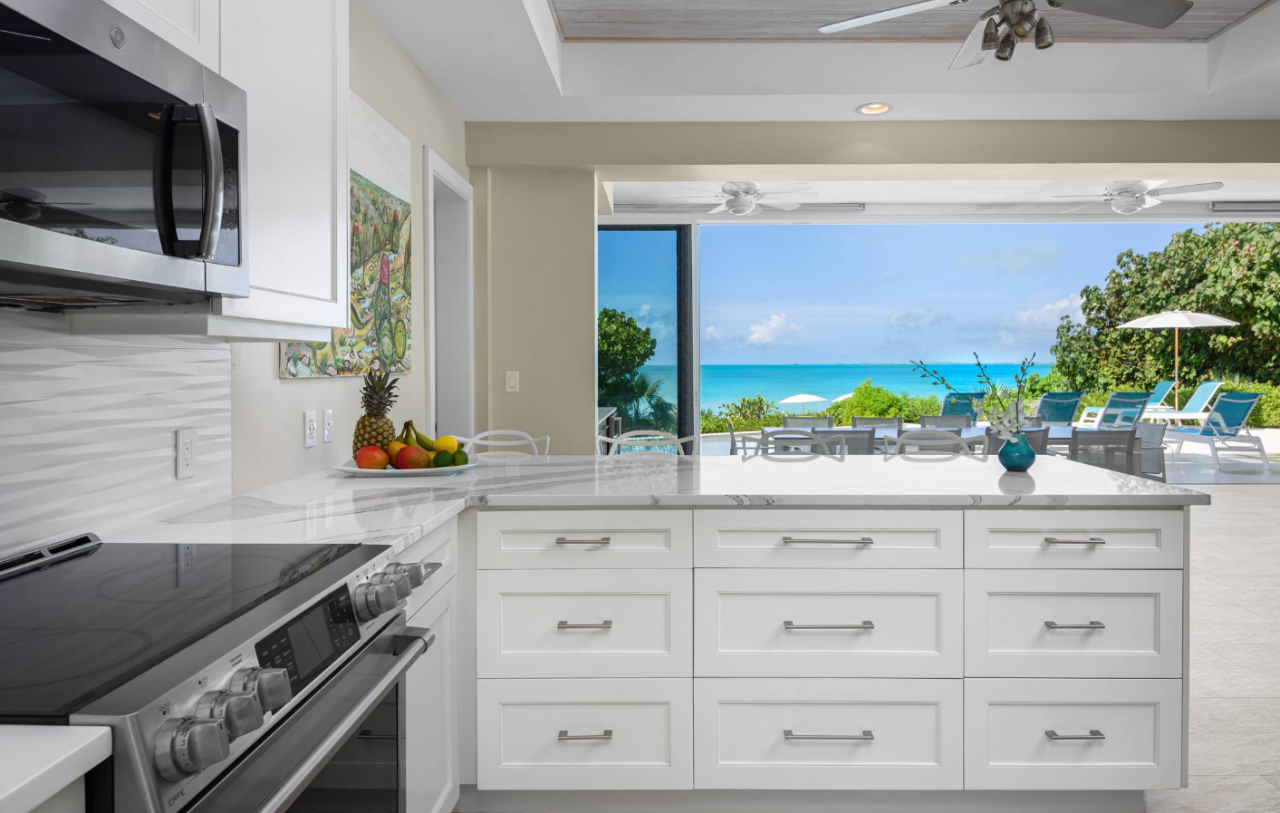 The fully equipped kitchen has everything necessary to prepare a quick breakfast, a poolside snack, or a gourmet meal. The kitchen features stainless steel appliances, granite countertops, paintings by a local Turks and Caicos artist, and as everywhere, the stunning view.