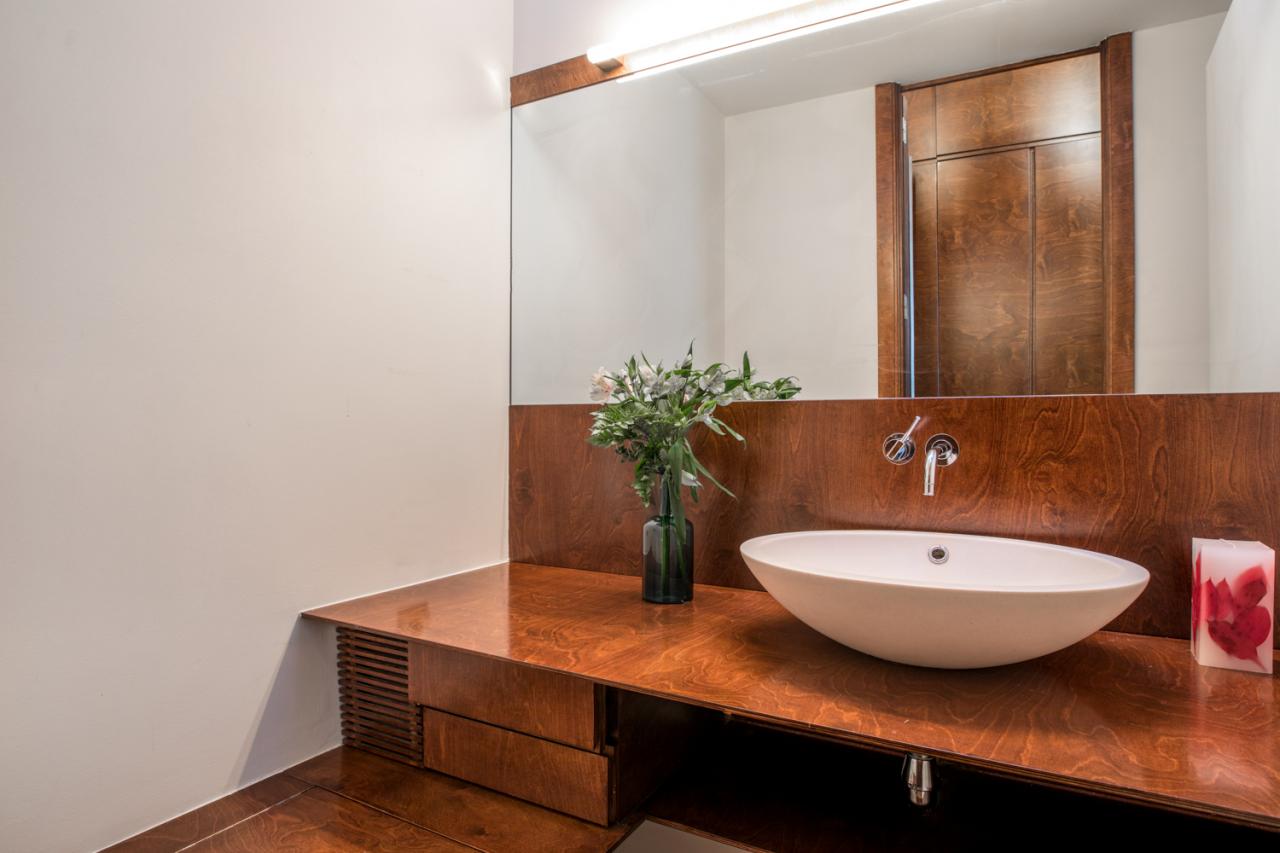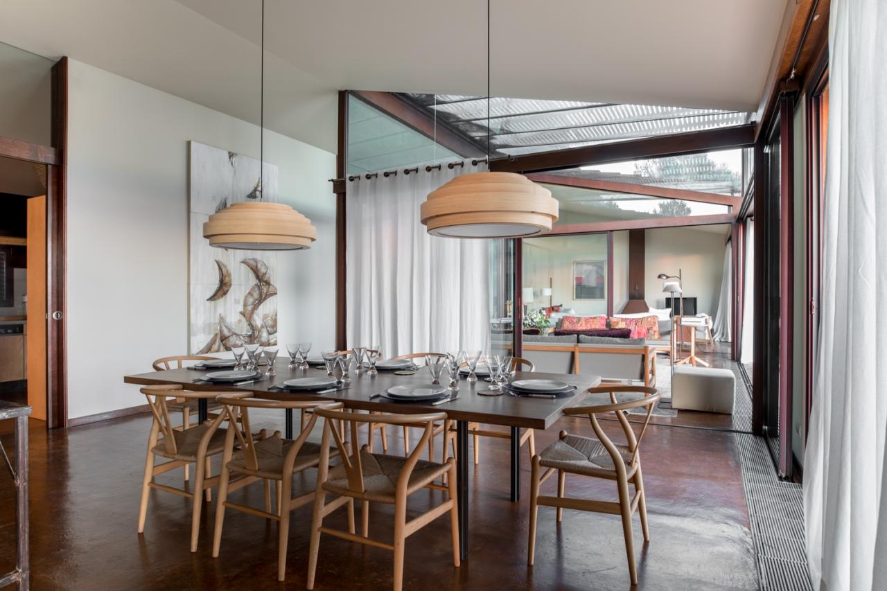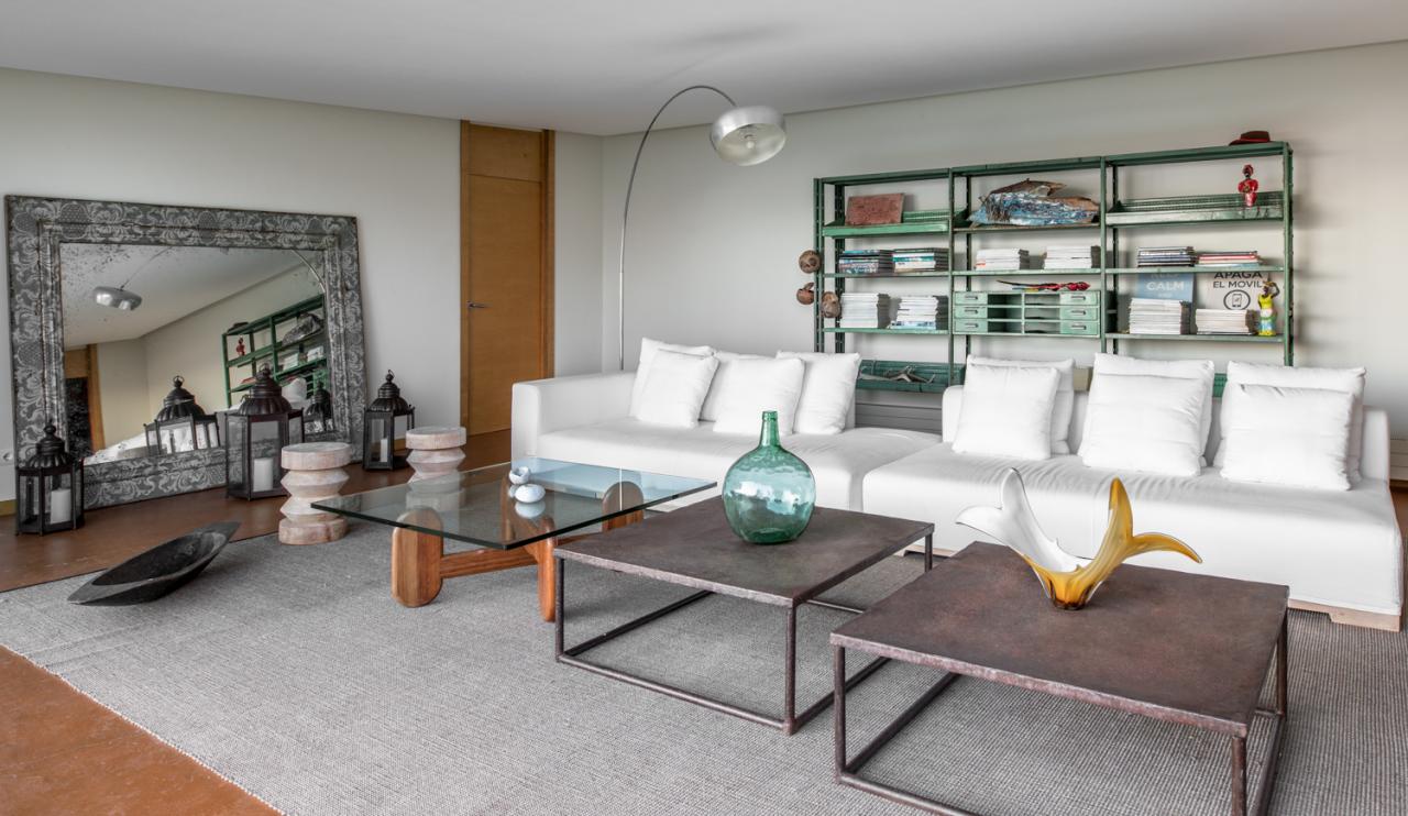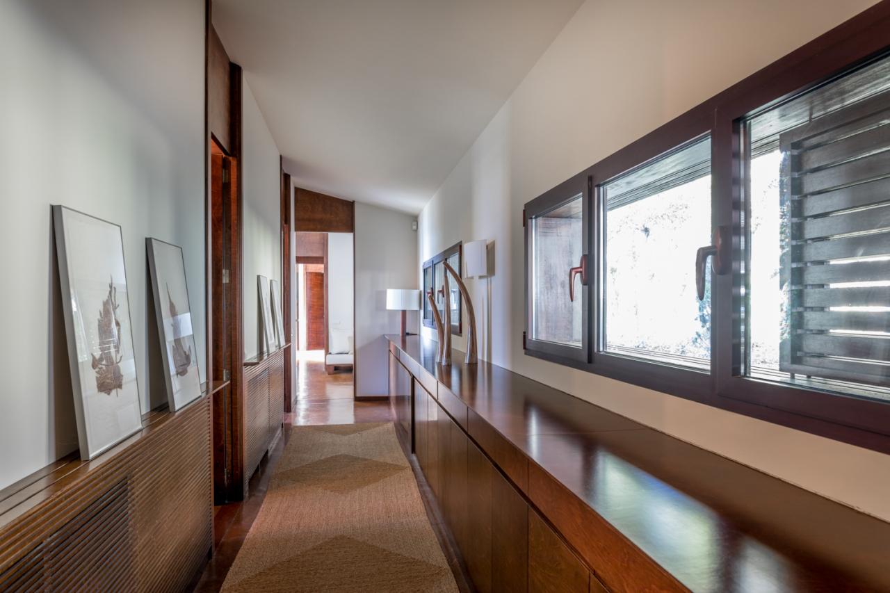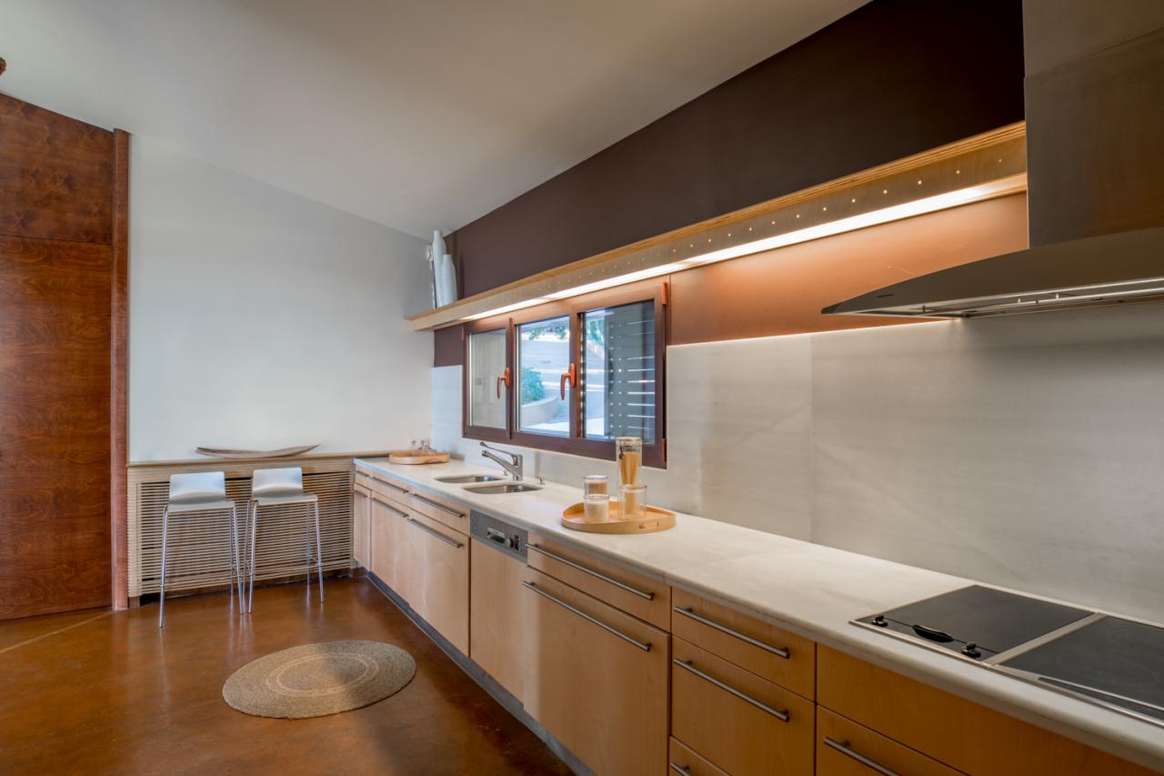 Upon entering into the home, a striking view of la Punta des Mut greets guests through the floor to vaulted ceiling windows of the living area. Flooded with light, the living room is perfectly symmetrical in its design with concrete floors and mirrored couches. Sitting adjacent to this space is a glass enclosed den with flat screen TV and wood burning fireplace, inviting guests to sink into an amazing book on the chaise, facing the endless blue sea horizon. Opposite this room, the dining room with seating for up to eight is served by the connected kitchen with stainless steel appliances, ample counter space and staff quarters for two maids.