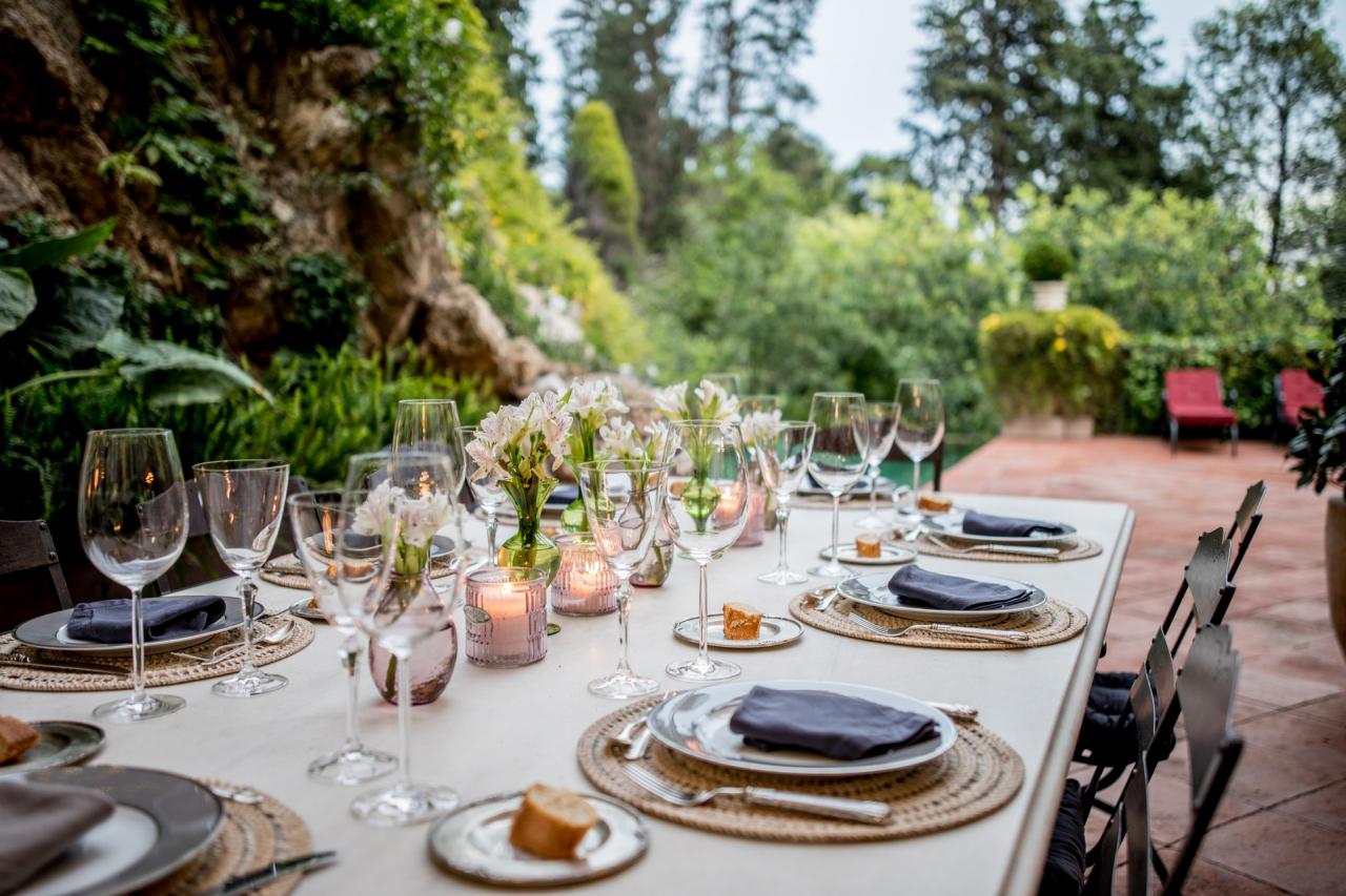 Villa 1904 is accessed via a prestigious, private road in middle of the city, where once you enter through the private gates you’ll arrive at the splendidly palatial entrance. On the home’s main floor, the grand living room was decorated by one of Spain’s top interior designers with a mix of antiques and modern furnishings. A cozy den opens up off the living area with TV, fireplace with ornate wooden mantle and intimate sitting area overlooking the gardens. The extravagant ceilings are 15 feet high, typical of the modernist era, with delicate crown molding, period trim and details that transport guests back to a more lavish and regal time. Opening off this room is an eclectic office which also functions as library with books shelved as high as the ceiling. The dining room boasts a red lacquer table for 12 which seamlessly unfolds into the outside patio and alfresco dining area for eight, sheltered by a floral entwined gazebo. The patio on this level is carved out of the mountain rock and surrounded by vegetation eventually opening up to a stunning natural shaped pool carved into the rocks. Relaxing on the terracotta tile patio with a plethora of lounge chairs and bistro seating, guests absorb the spectacular view of the city with beautiful sea beyond. The state of the art kitchen, informal dining room and cellar are also located in this level.