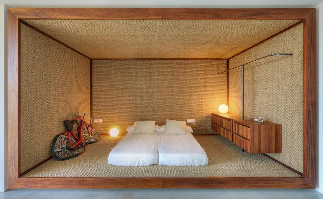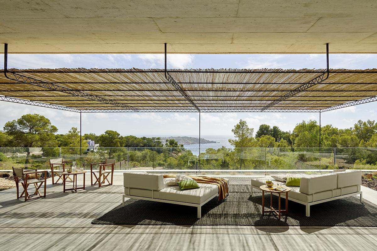 Upstairs, the open air concept continues into the family room with deep, sectional sofa, armchairs and unique fireplace which is suspended from the home’s ceiling. A second dining area serves for continued entertainment which carries onto the home’s top level patio. Also overlooking the pool and the sea, chaise lounge chairs and an al fresco dining table with four chairs create an ideal space from which to enjoy these incredible surroundings in the shade of the pergola.