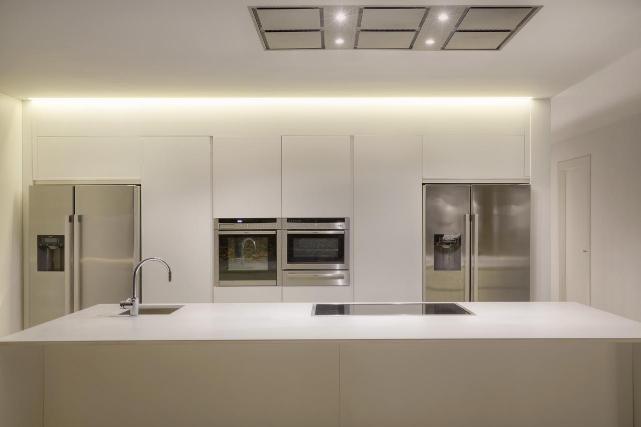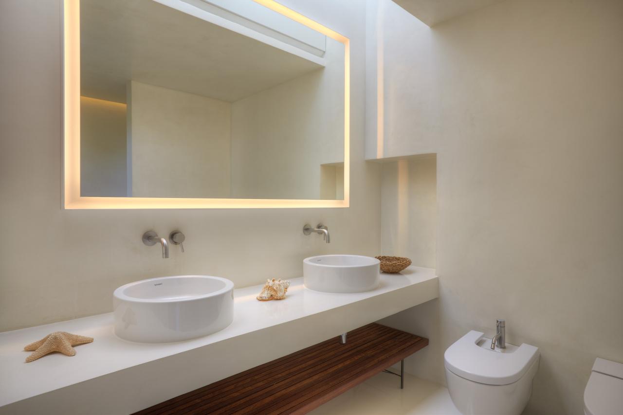 With stunning ocean views, the open air concept living space boasts comfortable, attractive furniture and Mediterranean views, while overlooking the crystal waters of the home’s incredible swimming pool, making this an ideal place from which to entertain friends. A long dining table with seating for more than 12 sits adjacent to the living area and is served by the gourmet kitchen with large island and stainless steel appliances, including dual refrigerators. Designer lounge chairs face the front of the home on this ground level and lead out to a private patio which serves as a serene and romantic escape.