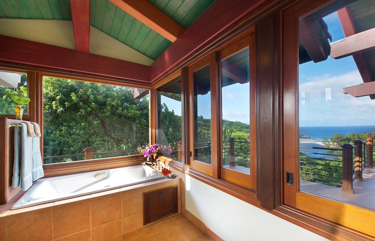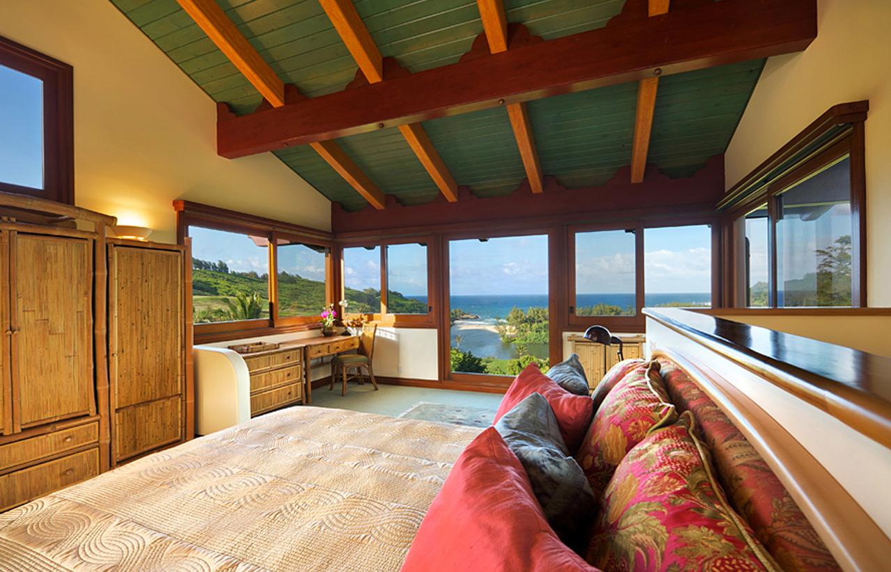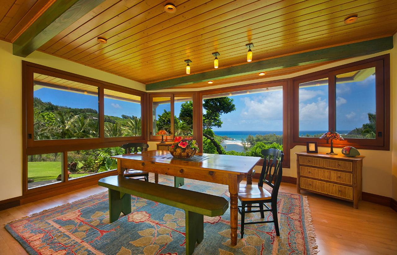 Great care was taken in the design and construction of this remarkable home built with the help of many of Kauai's finest craftsmen. Beautiful materials, fine woods, stone and tiles are highlighted by a unique blend of tropical colors; nature's "garden palette" is truly reflected inside and out. The dramatic colors of the Great Room's high-beamed ceiling coupled with the custom-made Teak sliding doors perfectly frame our inspiring ocean and river panorama. In fact, every room in the Main Residence affords guests stunning ocean views.