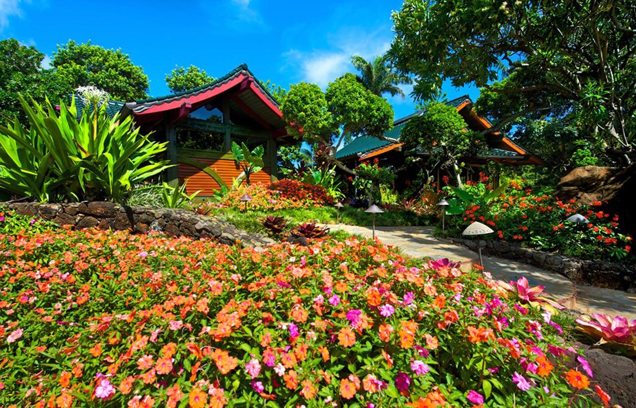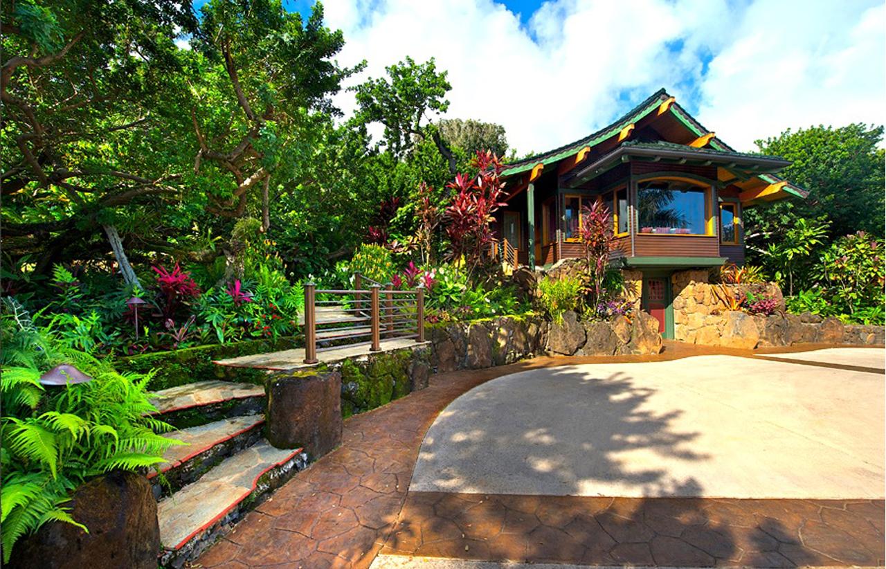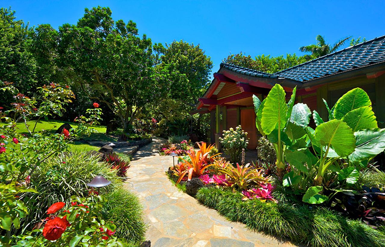 The Main Residence and charming Garden Studio and Library Bungalow are joined by meandering stone paths surrounded by exotic orchids, gingers, heliconias, and other colorful ornamentals. Dramatic tropical trees provide a swaying canopy of light and color and are home to many of Kauai's delightful songbirds. Unwind on the spacious ocean and garden lanais or take a leisurely stroll through the lovely gardens.
