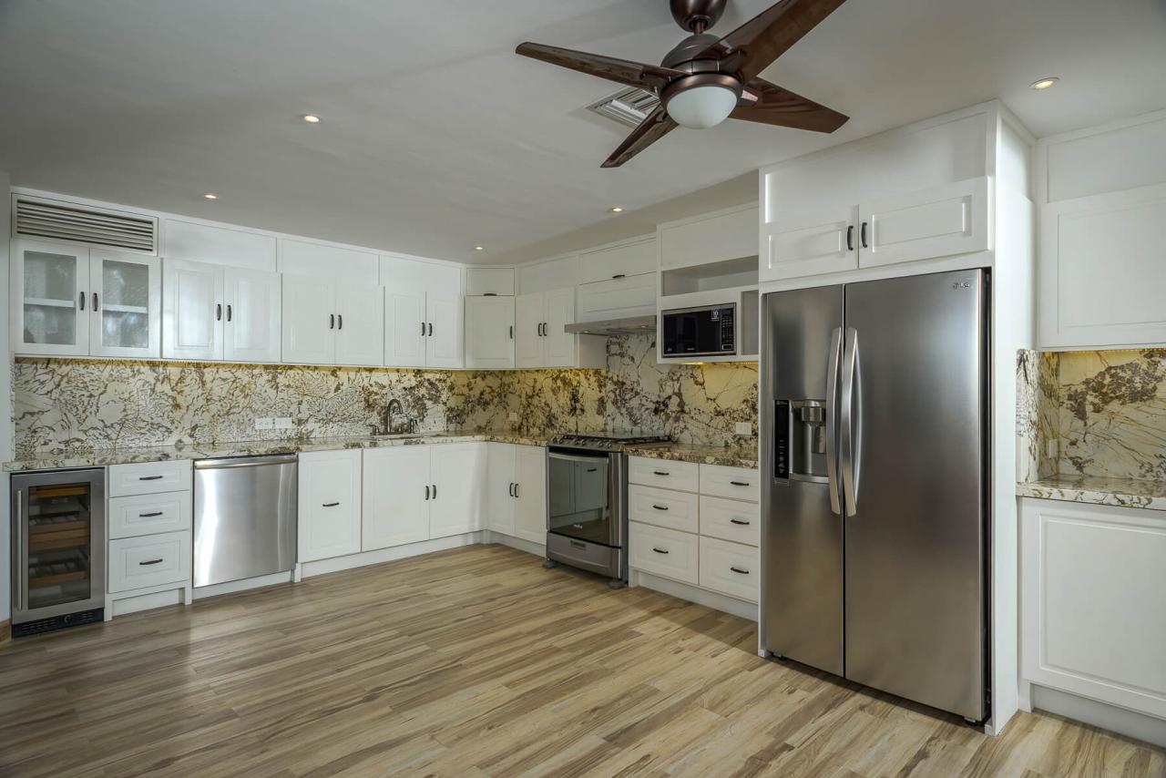 The villa's kitchen is filled with rustic, rich wood along with plenty of counterspace for prepping meals and stainless steel appliances to help you make it. There is a formal dining room that can seat eight guests. The living room includes plush sofas where guests can relax while looking a the views through the large terrace windows.