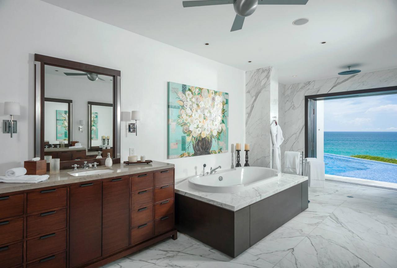 This luxury villa follows an open concept design. The gourmet kitchen, living room and 14-seat dining area provide the perfect space for entertaining. The six suites and guest apartment provide ample sleeping space for a family reunion or vacation. Two rooms have a king bed and all other rooms have queen beds, all with en suite bathrooms.