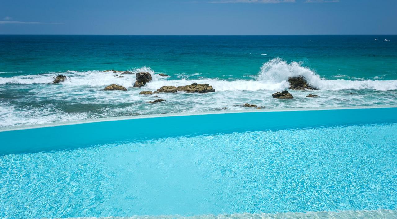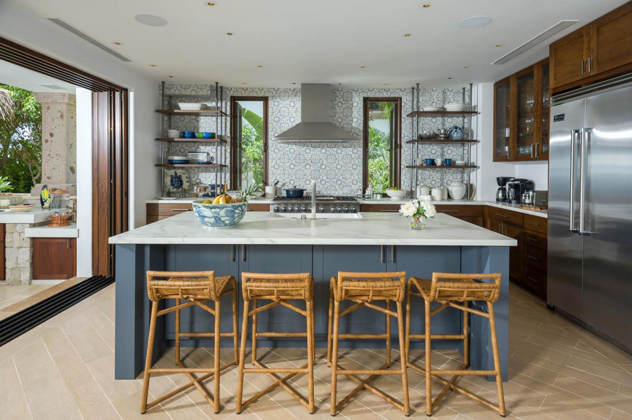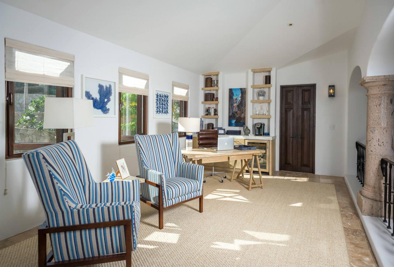 Inside, the Los Cabos rental combines comfort and style with a neutral color palette accented by touches of blue to reflect the nearby sea. Each of the four bedrooms opens to outdoor space and breathtaking views, while additional features include a gourmet kitchen, an office, exercise equipment, and a spacious living room with large windows. Smart home technology and daily maid service add to the ease and luxury of staying at Casa Roca de Pajaro.