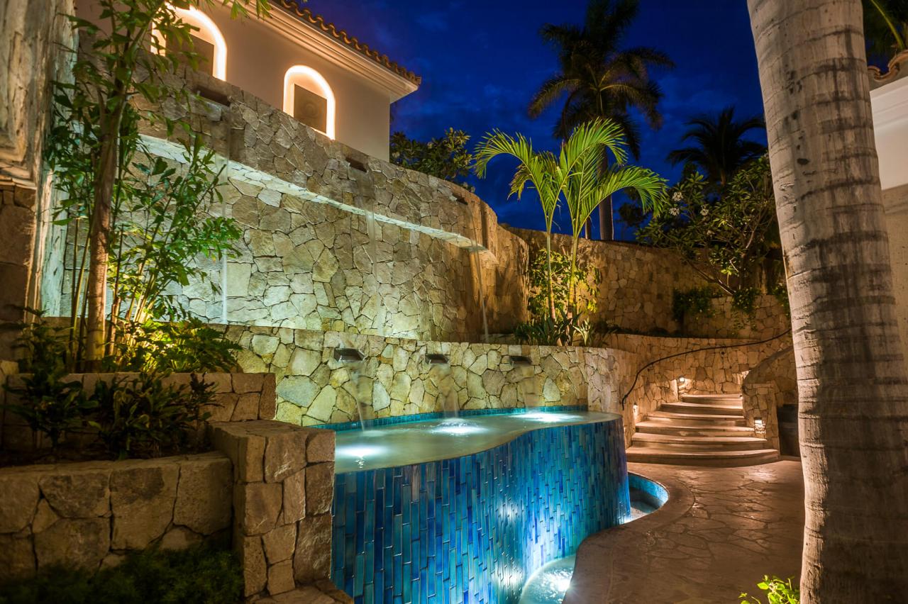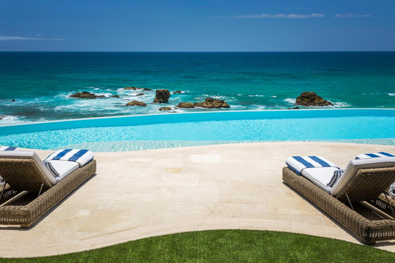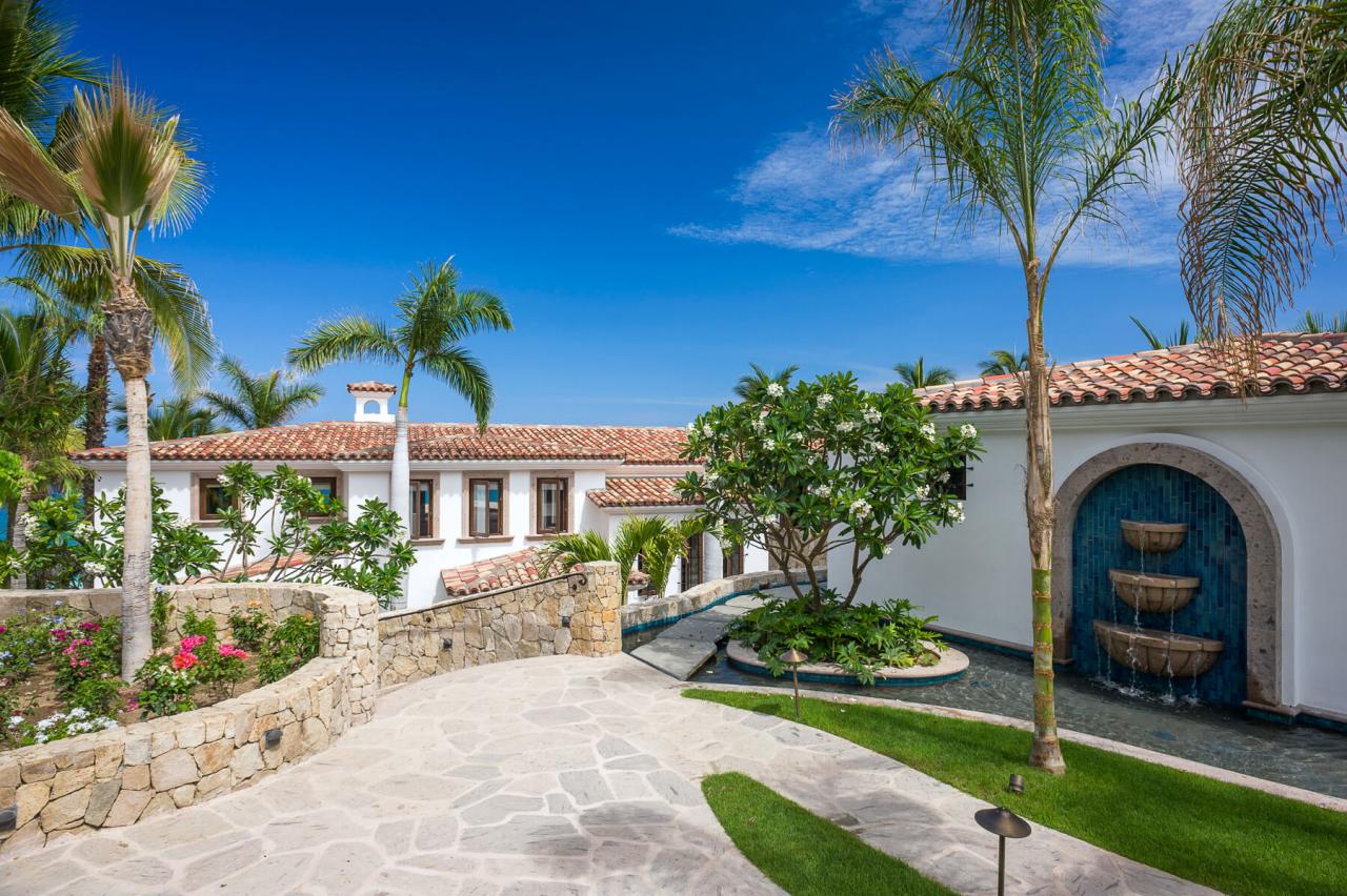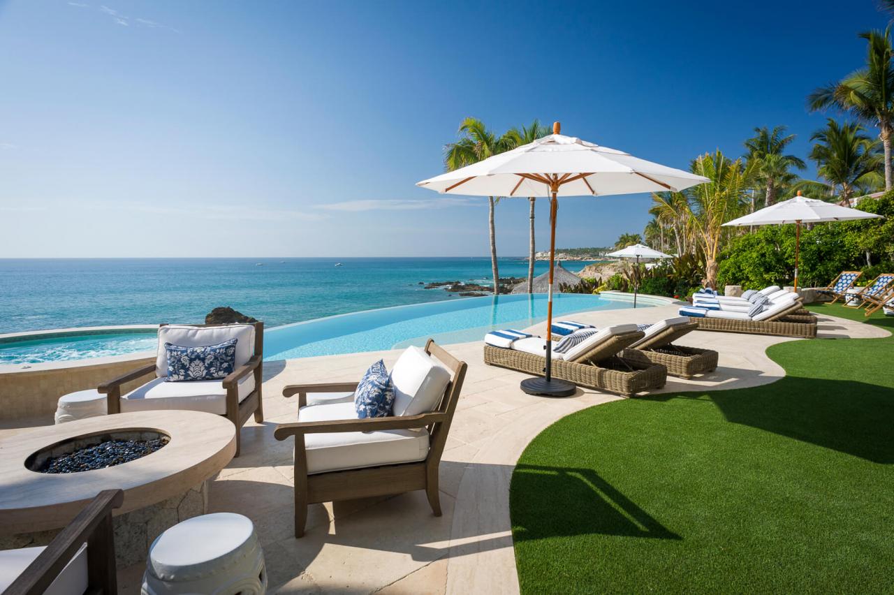 The outdoor amenities of Casa Roca de Pajaro are designed to enhance the experience of oceanfront Los Cabos vacation. Surrounded by tropical landscaping and towering palm trees, guests can relax on one of the eight deck loungers, swim in the pool with a child-friendly section, or unwind in the Jacuzzi. The villa also features a fire pit, outdoor fireplace, waterfall, barbecue area, and a shaded palapa for outdoor dining. With uninterrupted views of the sea and direct access to the beach below, the property offers a serene and visually stunning retreat.