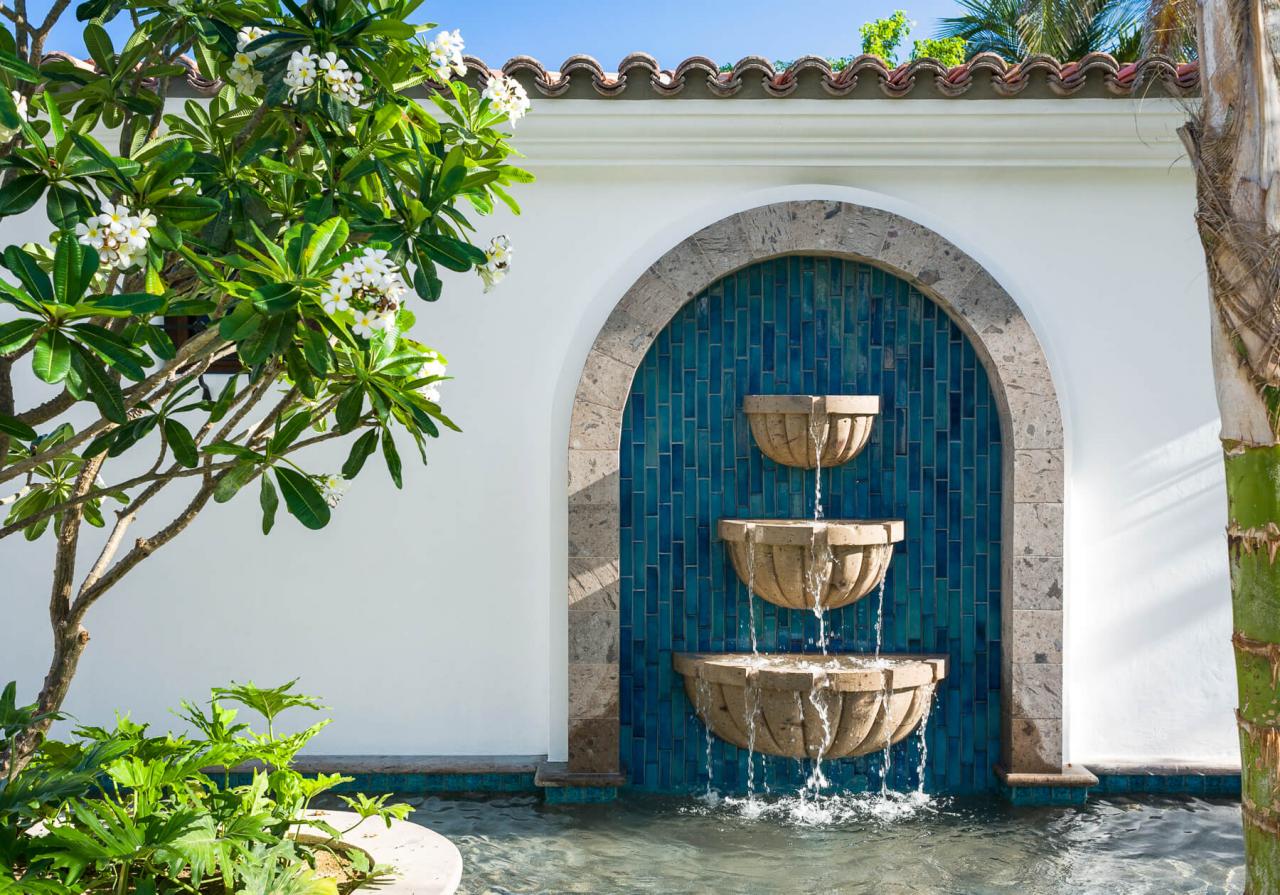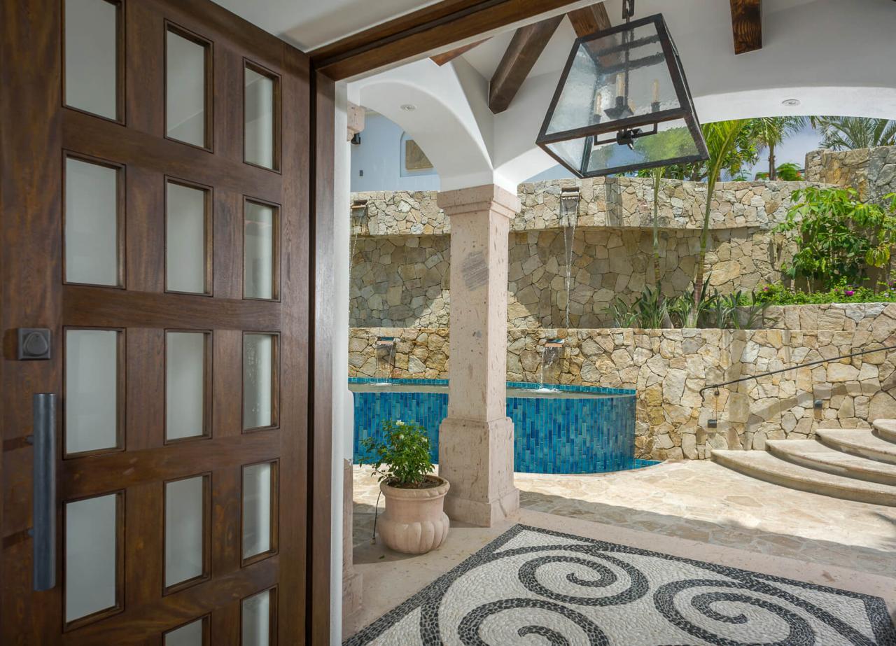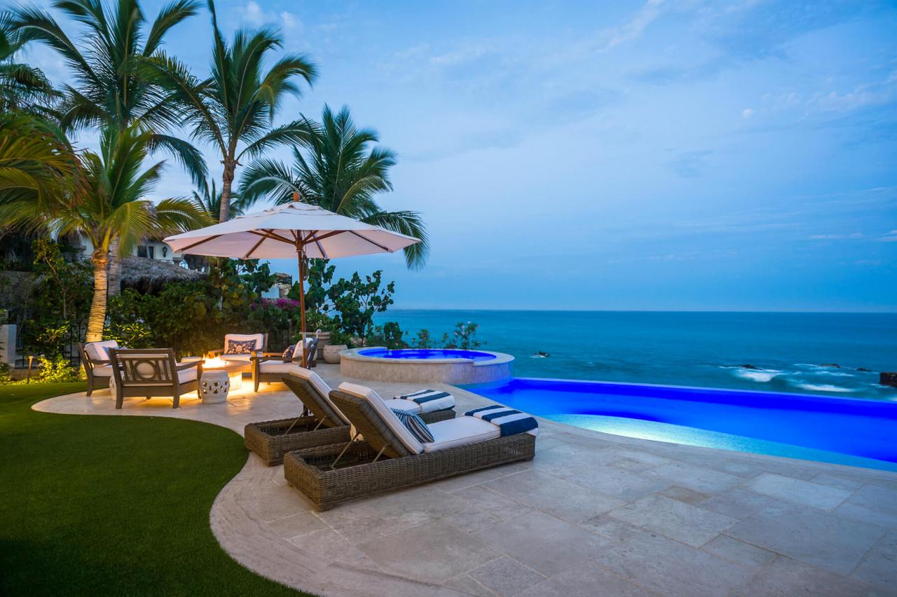 The outdoor amenities of Casa Roca de Pajaro are designed to enhance the experience of oceanfront Los Cabos vacation. Surrounded by tropical landscaping and towering palm trees, guests can relax on one of the eight deck loungers, swim in the pool with a child-friendly section, or unwind in the Jacuzzi. The villa also features a fire pit, outdoor fireplace, waterfall, barbecue area, and a shaded palapa for outdoor dining. With uninterrupted views of the sea and direct access to the beach below, the property offers a serene and visually stunning retreat.