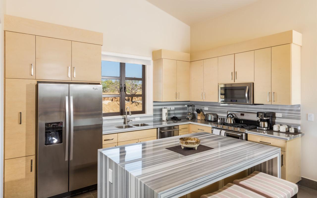 Casita’s spacious living room has a social, open-concept layout. It’s a great place to relax with friends after a long day on the golf course. There’s comfortable seating for the whole group positioned around the flat screen television. In the kitchen, high-end appliances and a gorgeous countertop/backsplash set an elegant tone. Overall, this casita has an inviting, island-breezy atmosphere, perfect for a relaxing golf vacation.