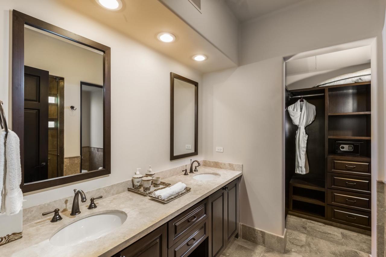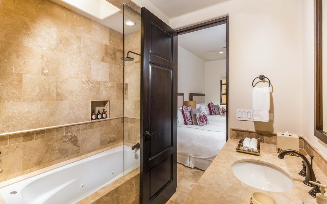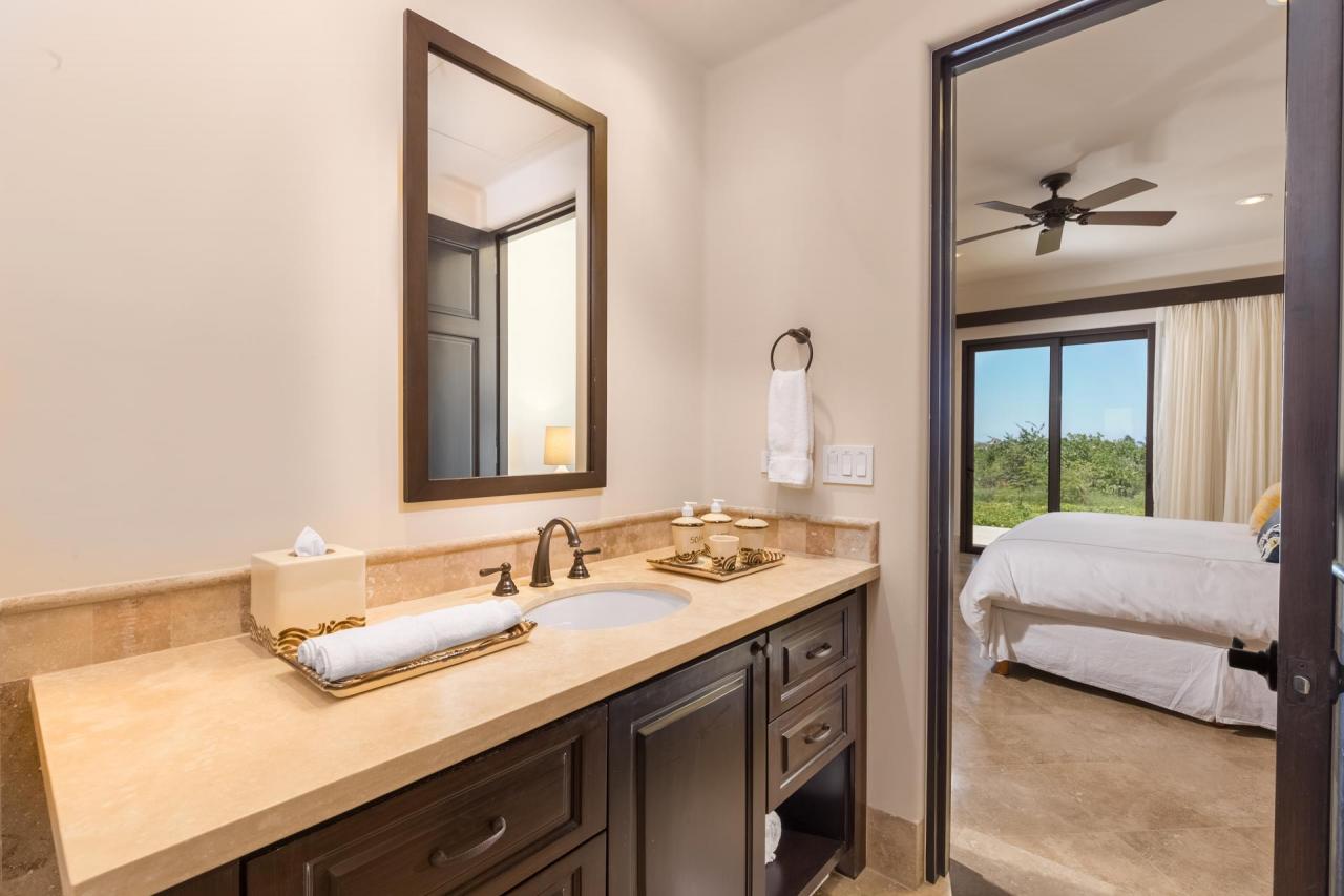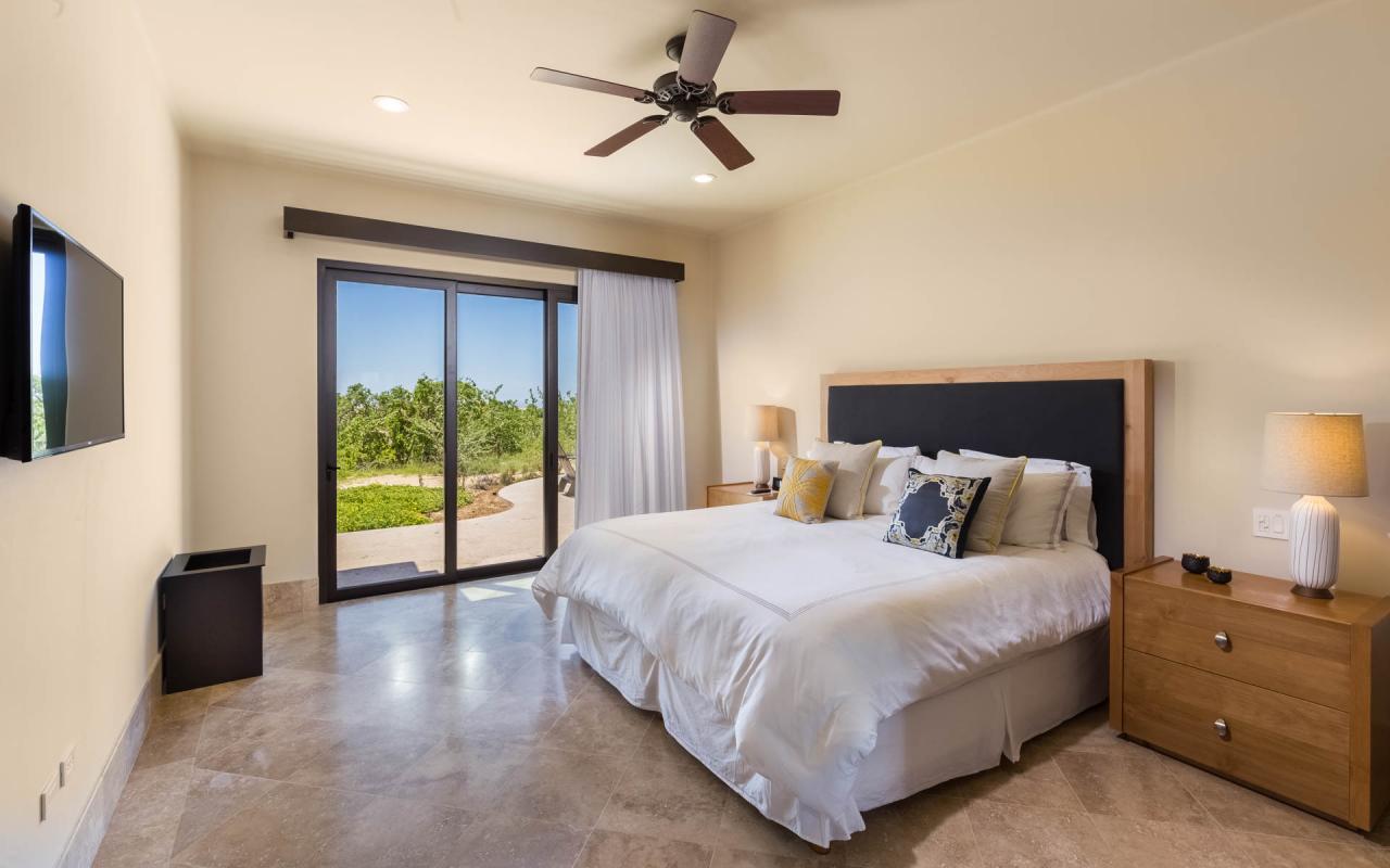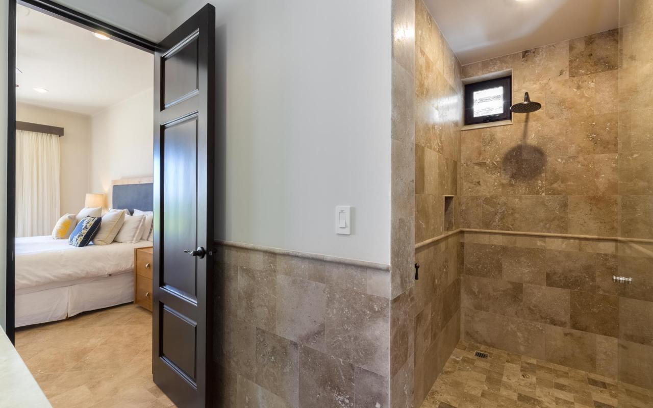 The bedrooms provide lovely settings for afternoon siestas and tranquil nights. There are two suites with king beds and one with two queens, accommodating eights guests. Each king bedrooms feature doors to the terrace and an ensuite bathroom with stand-alone shower. The queen room is adjacent to a deluxe bathroom with stand-alone shower and tub. Each room includes a safe, ceiling fan, television, and walk-in closet.