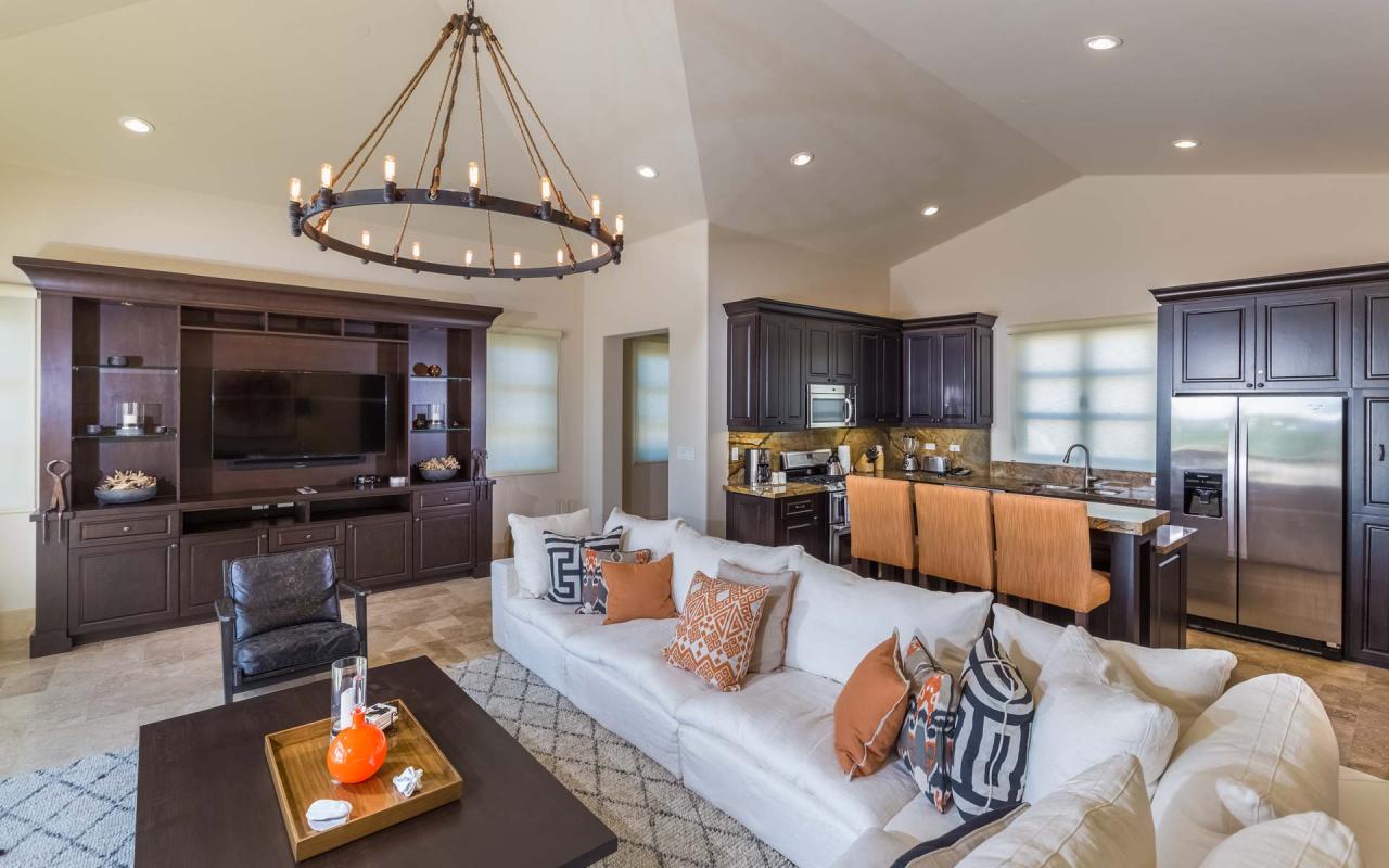 Glass doors join the main terrace and open-plan living area, creating an expansive space for relaxation and entertainment. Prepare delicious meals in the fully equipped kitchen, and gather at the beautiful dining table. Sip wine on the sumptuous sectional, facing the terrace or the flat-screen TV. At night, cuddle up in the comfy media room.