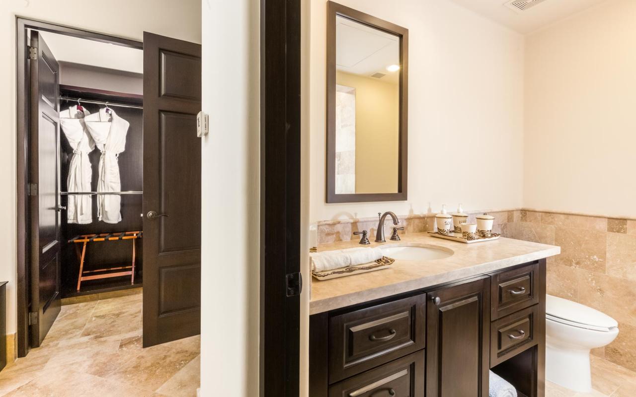 - Bedroom 1: King bed, en suite bathroom with shower, dual vanity, walk-in closet, TV, safe, ceiling fan, terrace
