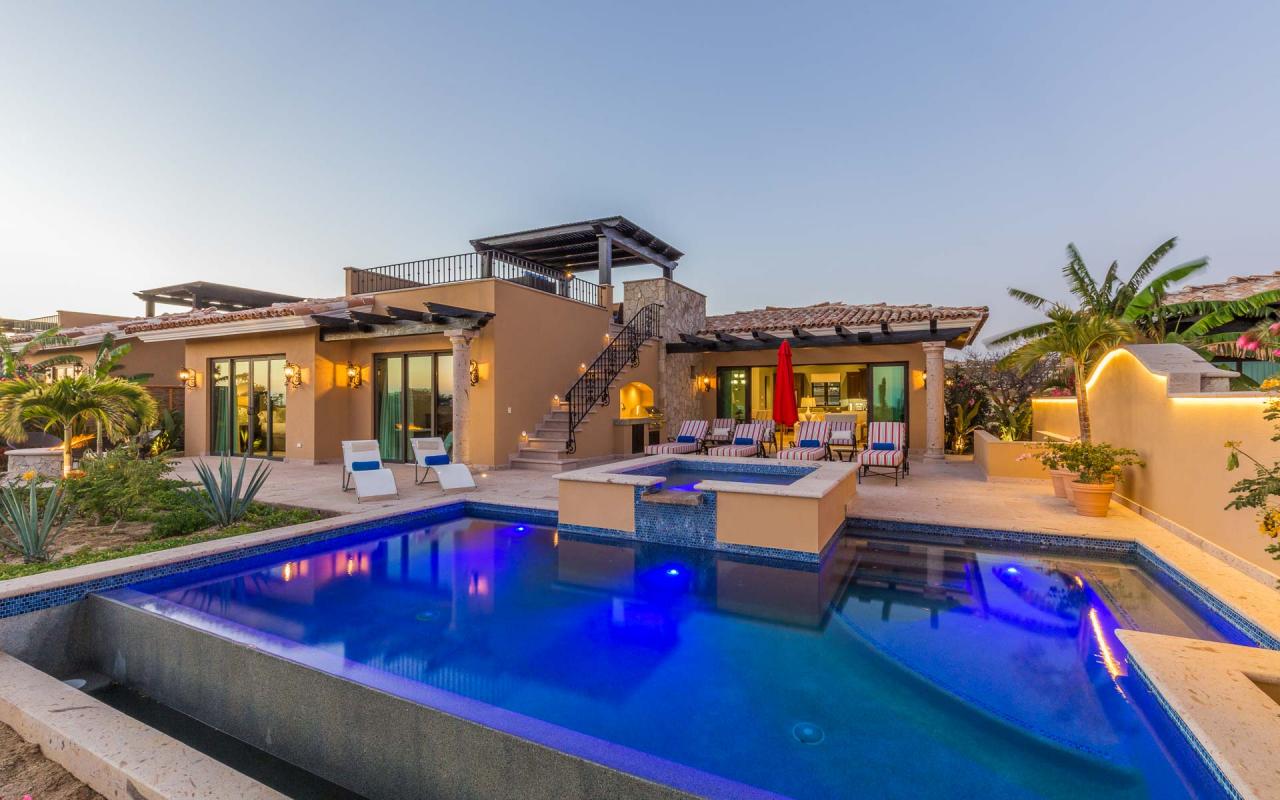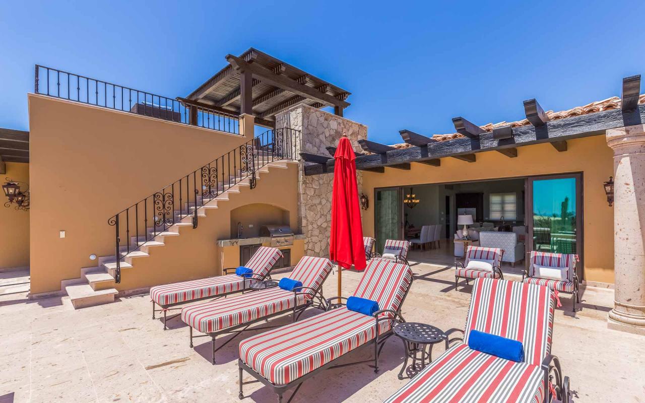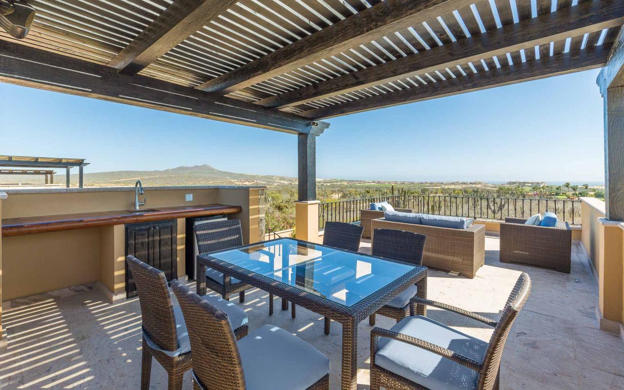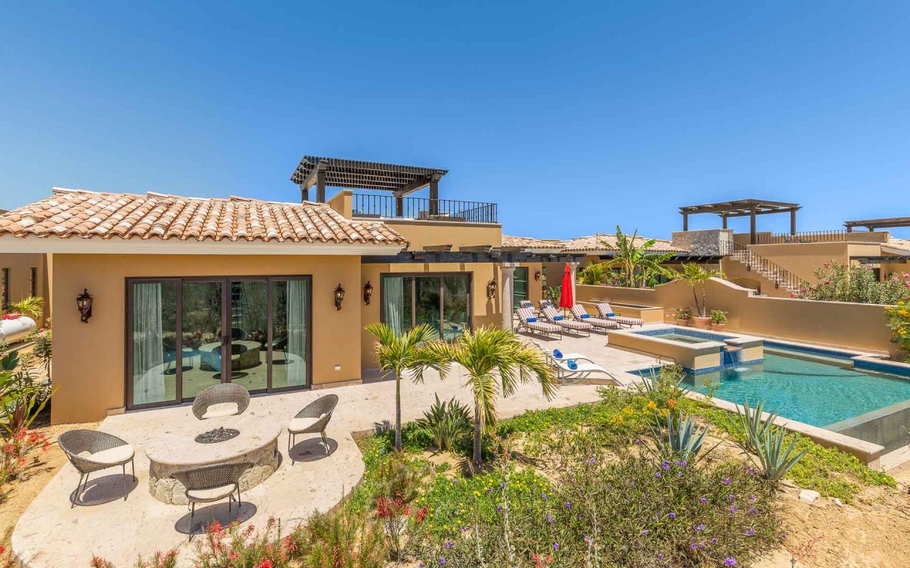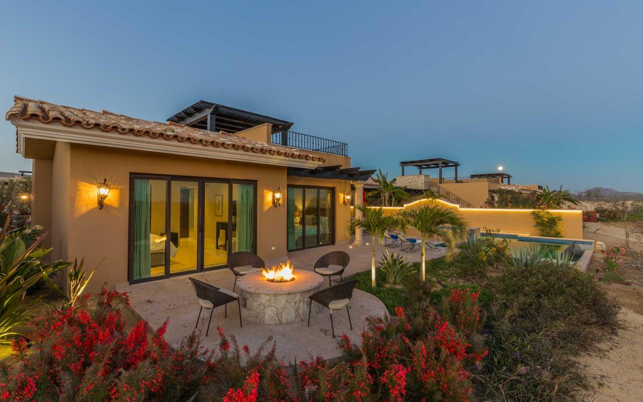 The villa's exterior features a ground-floor terrace cloistered within elegant walls, and a rooftop terrace with beautiful golf course views. On the ground floor, a hot tub cascades into an ample swimming pool. Elegant loungers invite you to enchanting hours in the Los Cabos sun, while the firepit keeps you toasty under the stars. In the afternoon, repair to the rooftop terrace for an alfresco lunch beneath the pergola, and linger there at sunset to savor the panoramic vistas.