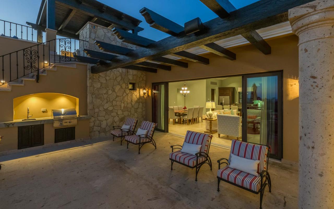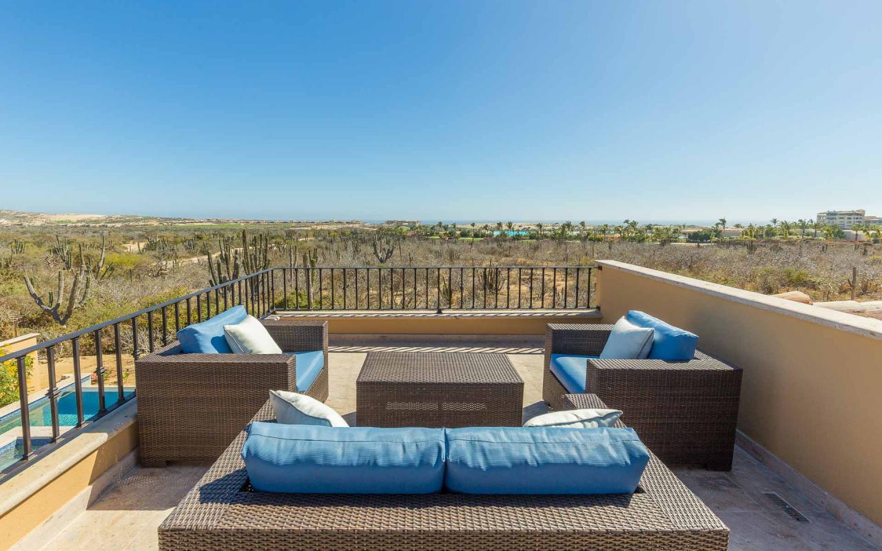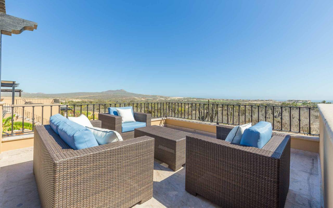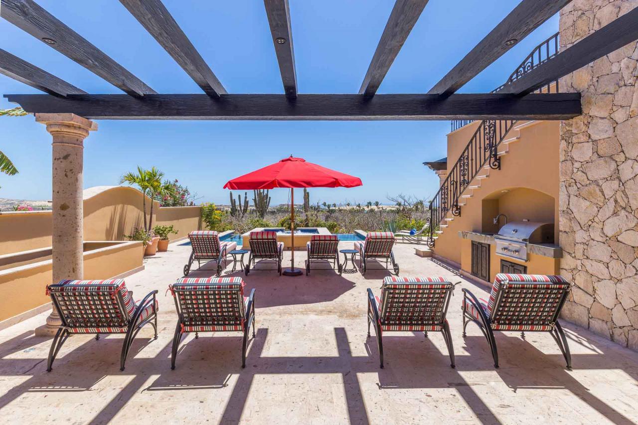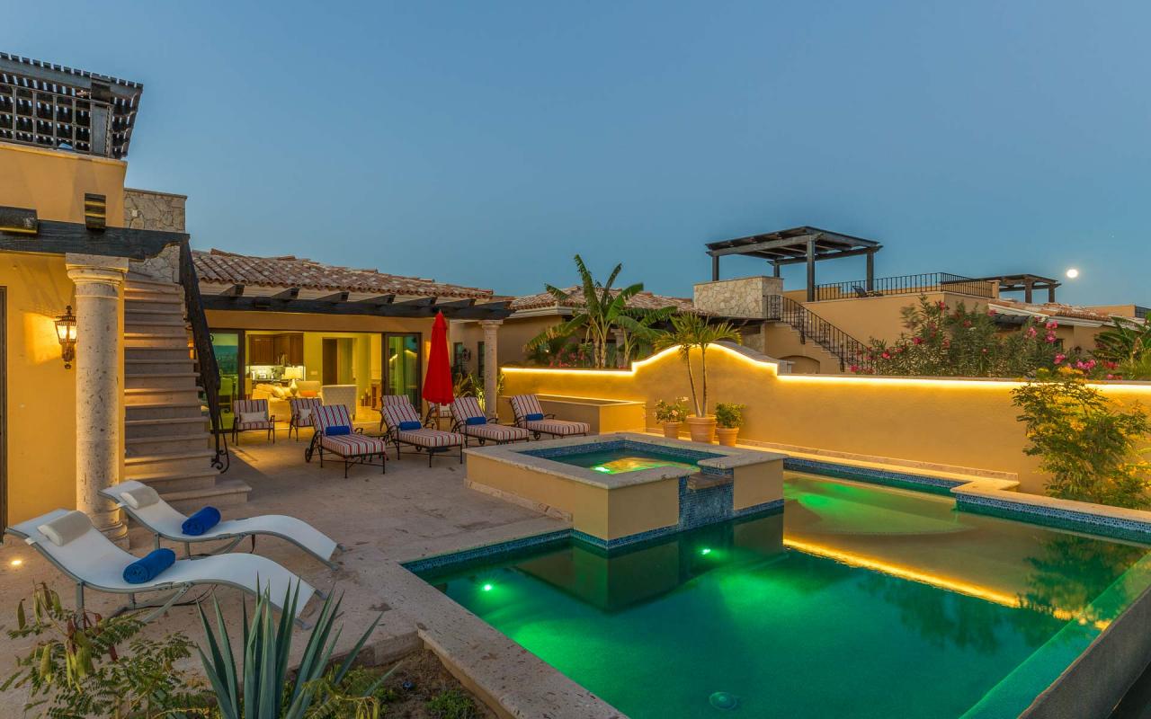 The villa's exterior features a ground-floor terrace cloistered within elegant walls, and a rooftop terrace with beautiful golf course views. On the ground floor, a hot tub cascades into an ample swimming pool. Elegant loungers invite you to enchanting hours in the Los Cabos sun, while the firepit keeps you toasty under the stars. In the afternoon, repair to the rooftop terrace for an alfresco lunch beneath the pergola, and linger there at sunset to savor the panoramic vistas.