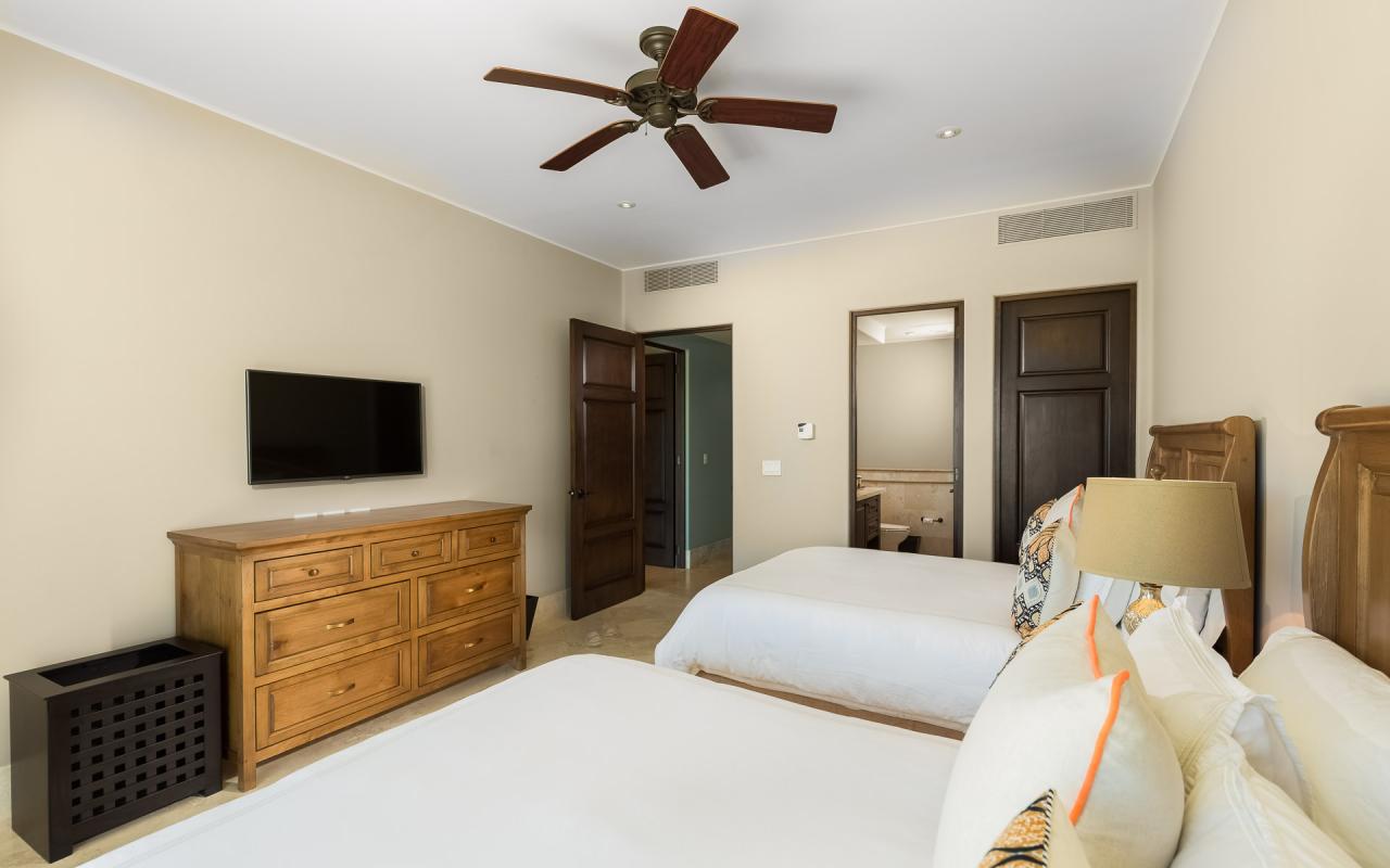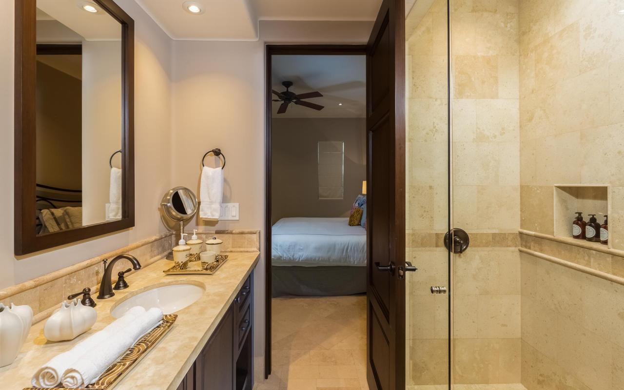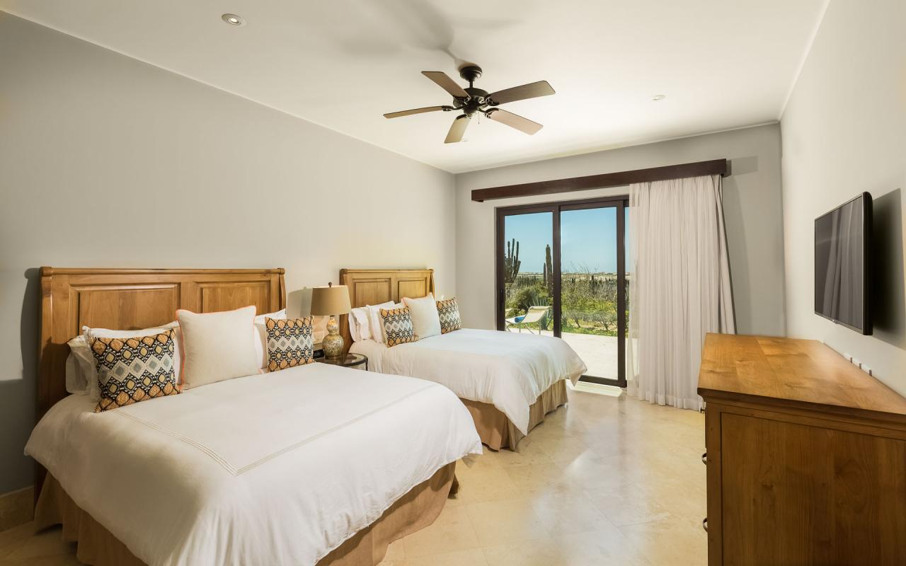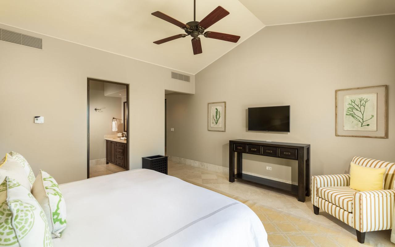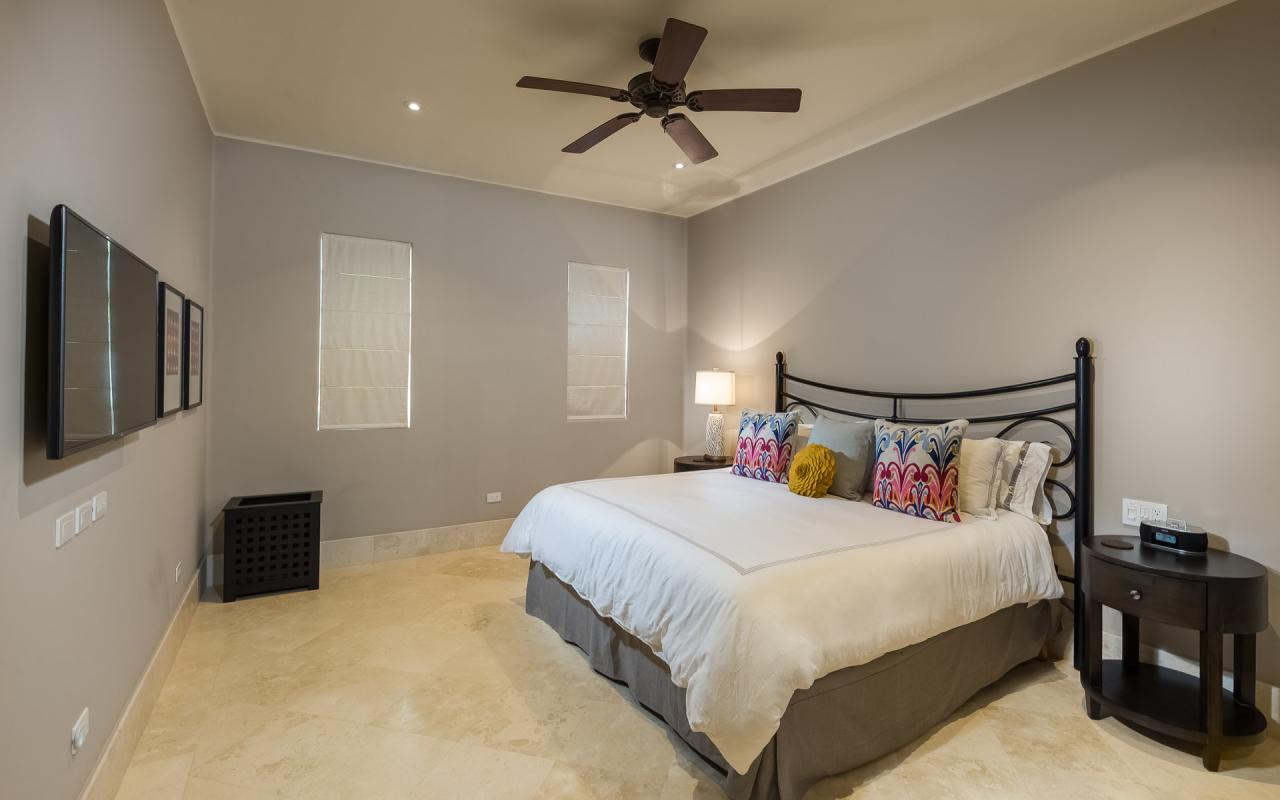 There are two bedroom suites with king beds and one with two queens. The king suites include ensuite bathrooms, and one of the suites to the pool terrace. The queen bedroom also opens to the terrace. All of the suites include safes, televisions, and ceiling fans. With accommodations for eight, Casita 5 is an excellent vacation rental for families and destination wedding guests.
