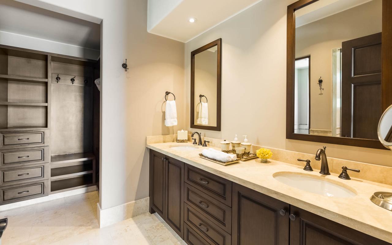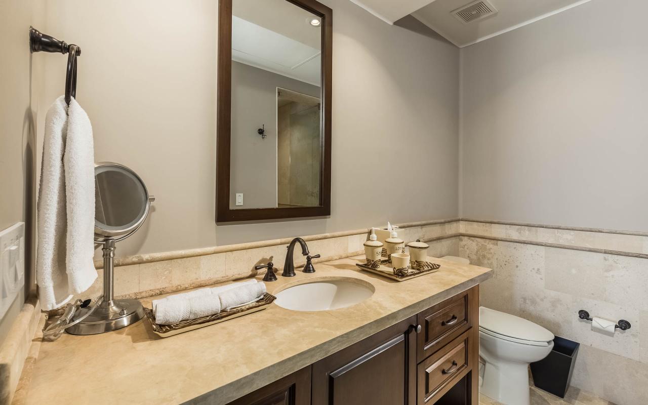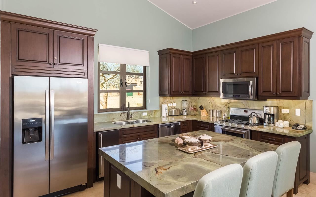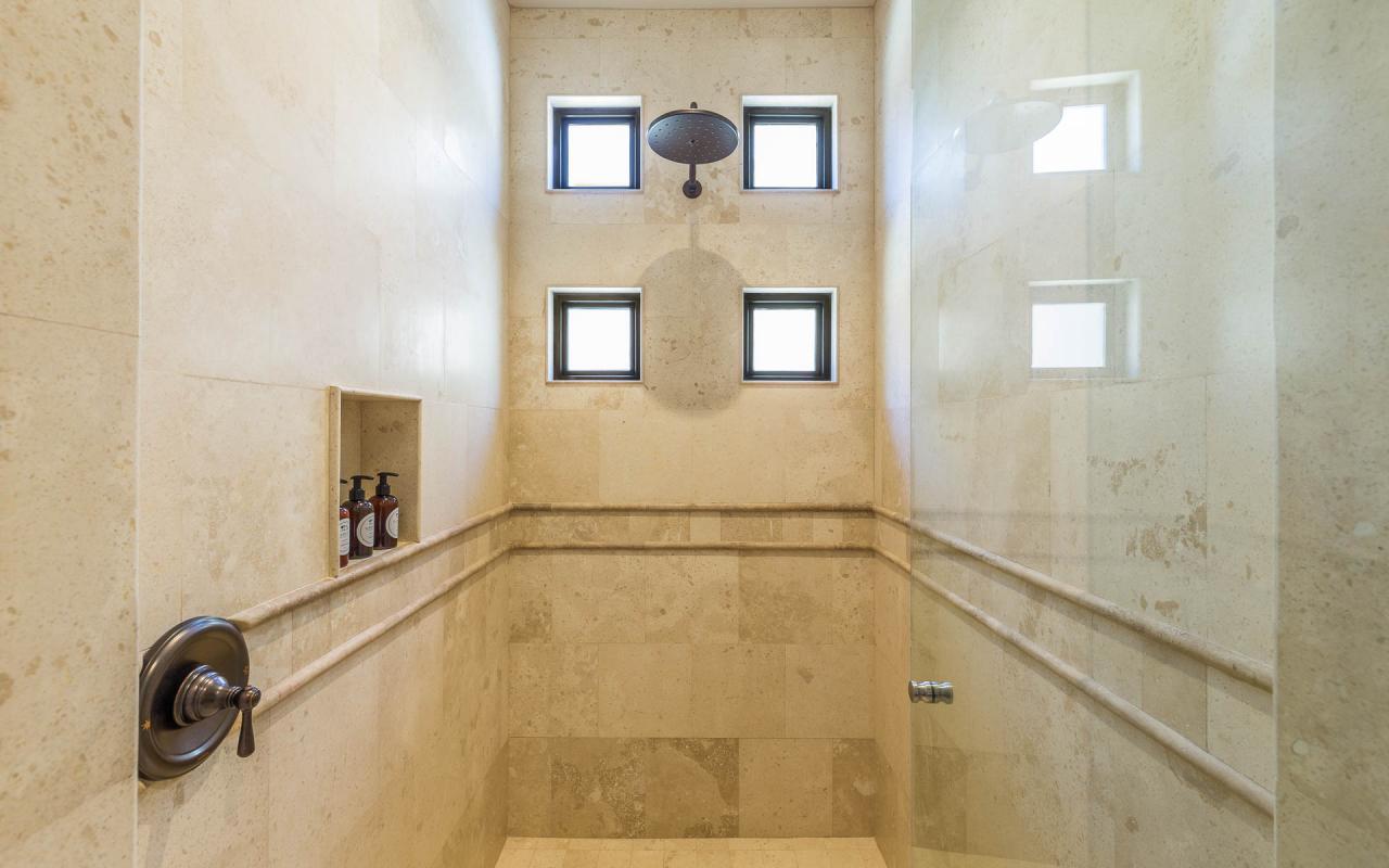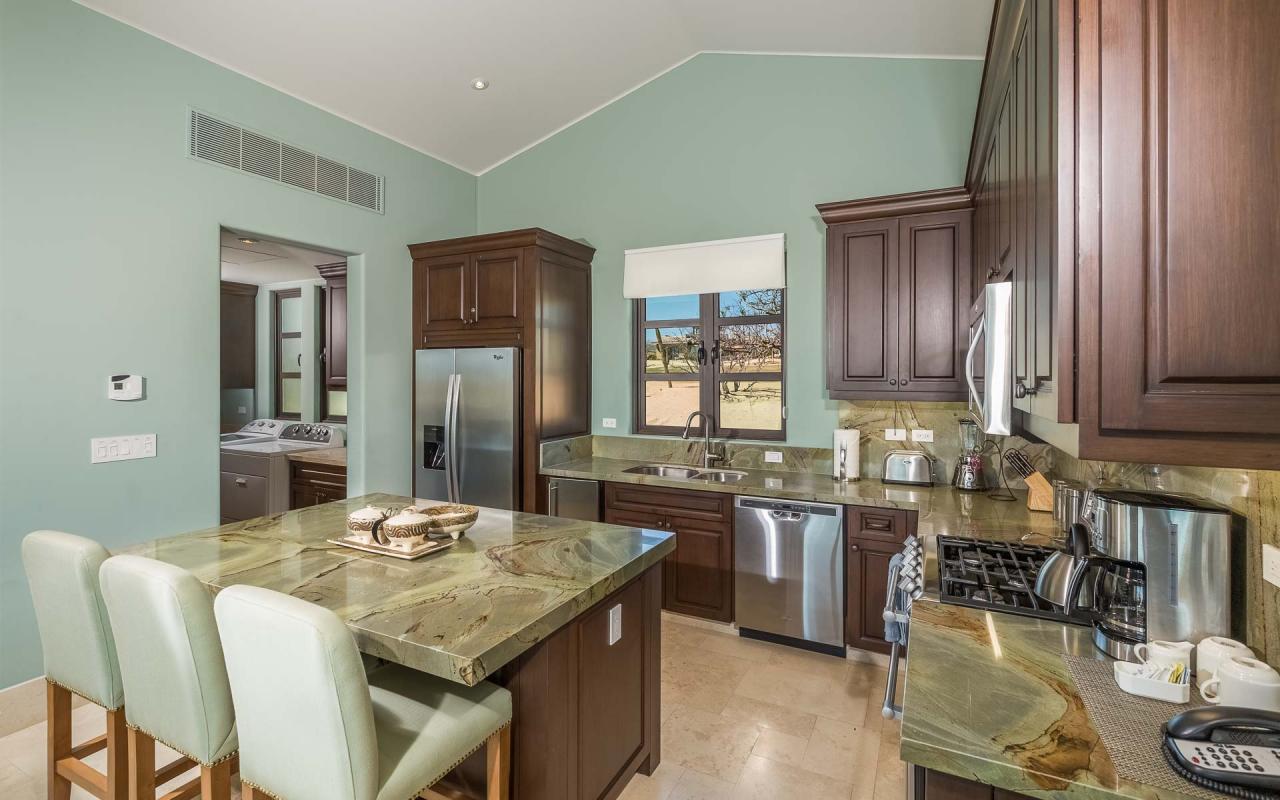 There are two bedroom suites with king beds and one with two queens. The king suites include ensuite bathrooms, and one of the suites to the pool terrace. The queen bedroom also opens to the terrace. All of the suites include safes, televisions, and ceiling fans. With accommodations for eight, Casita 5 is an excellent vacation rental for families and destination wedding guests.