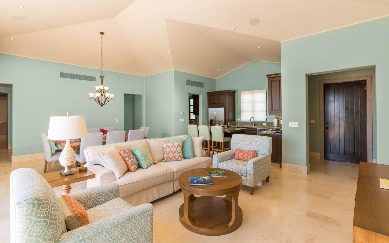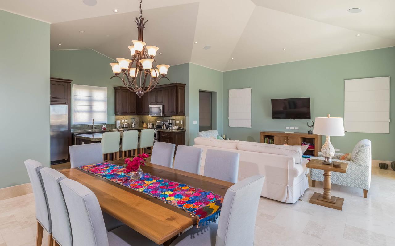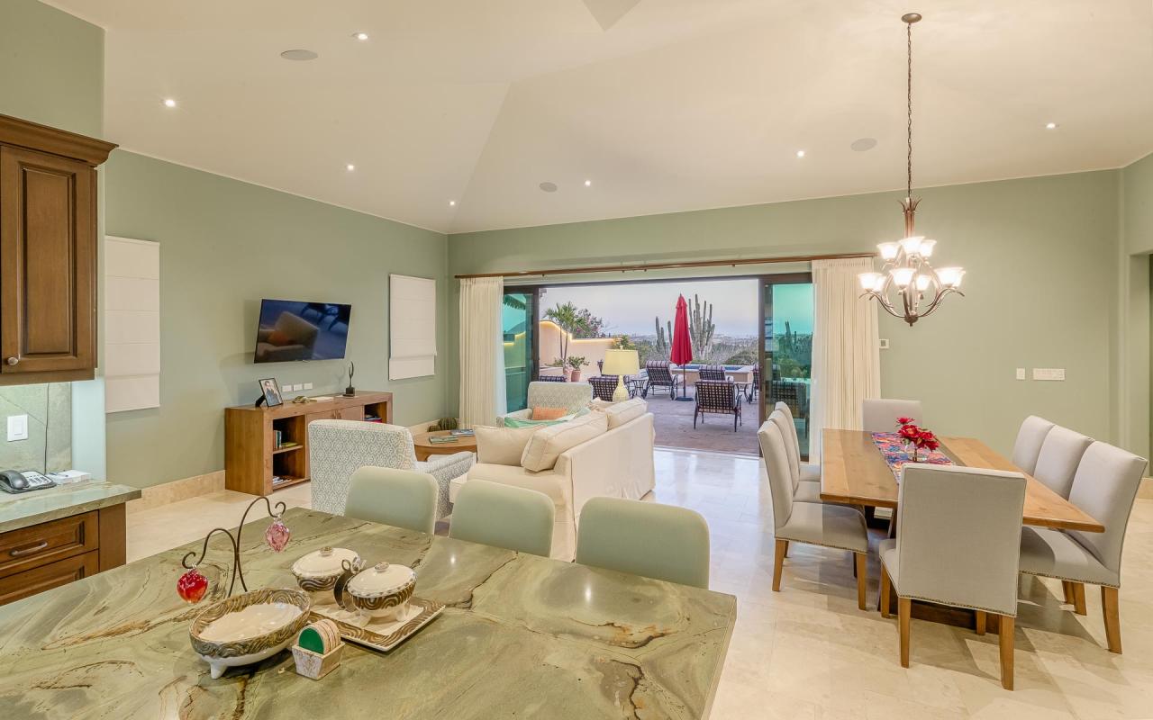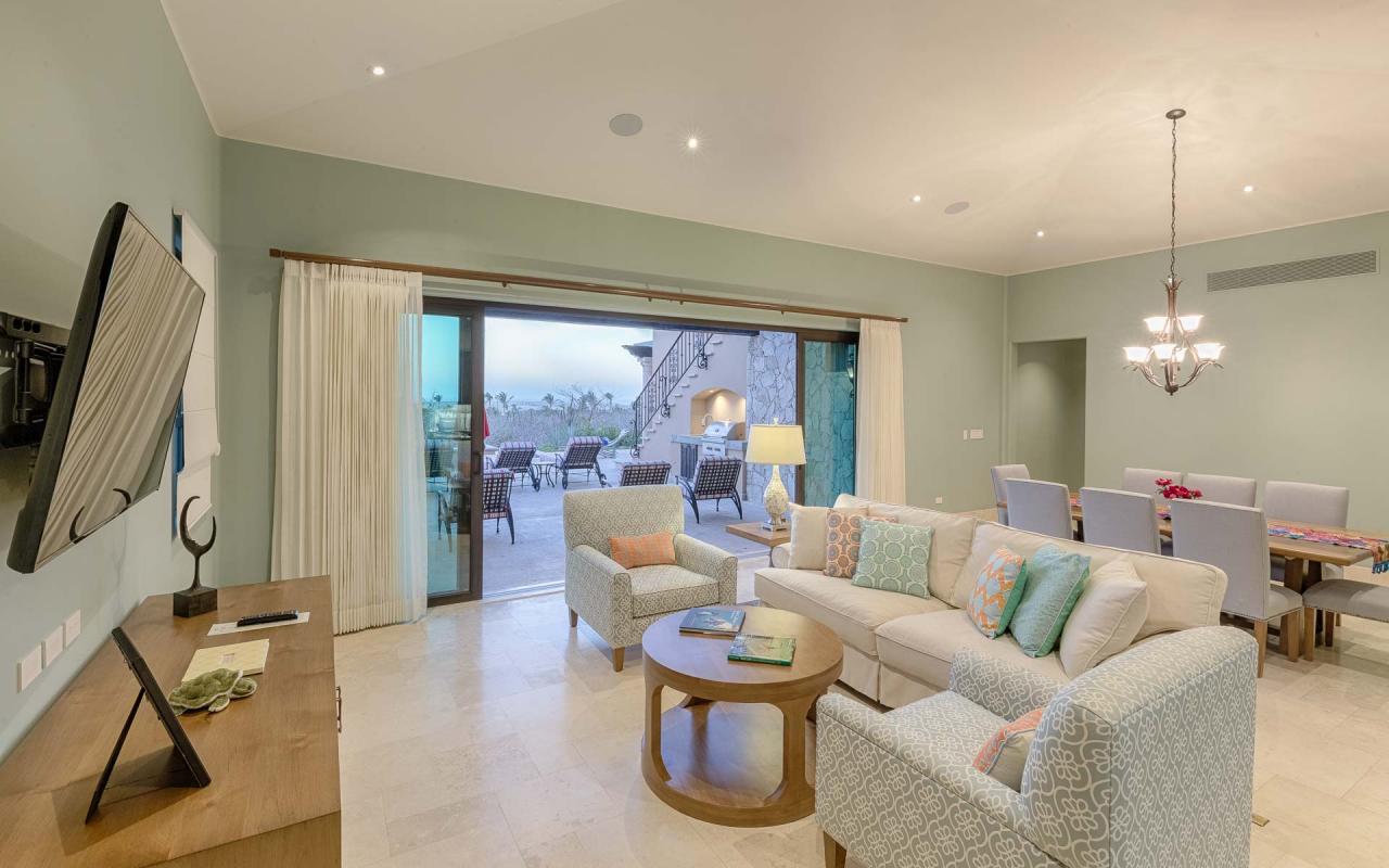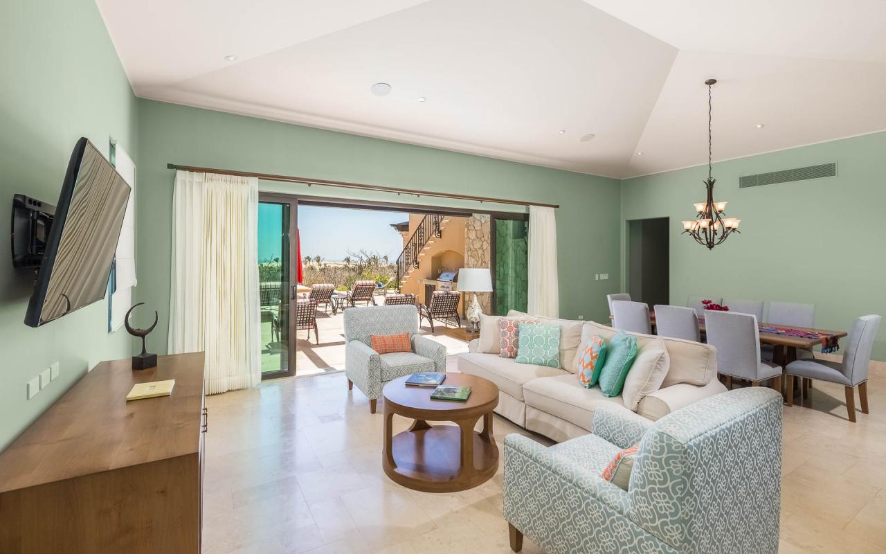 Glass doors join the pool terrace and living room, creating a seamless space for dining and relaxation. Enjoy evenings in the lounge, watching your favorite shows on TV. Cook delicious meals in the fully equipped kitchen, and gather at the dining table for eight. Exquisite furnishings and a cool palette of pastels and whites, enlivened by touches of vibrant tropical color, provide an ambiance at once traditional and freshly contemporary, accentuating the natural beauty of the enchanting Pacific coastline of Baja California.