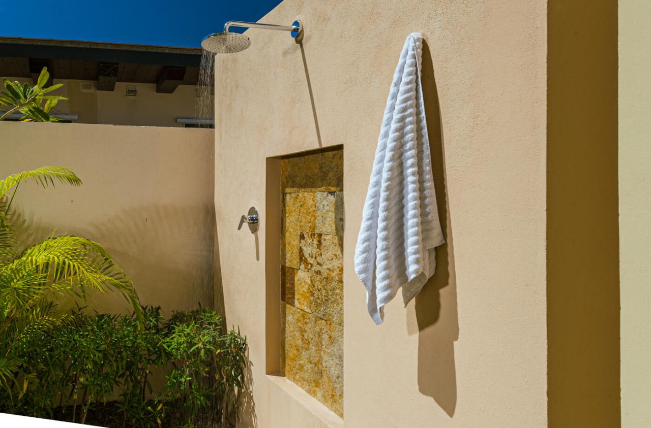 Walls of glass open the home to its luxurious outdoor space, with multiple opportunities for lounging and outdoor dining. Guests can relax on one of the five loungers surrounding the sun-soaked swimming pool and jacuzzi, dine al fresco with the built in grill, curl up by the outdoor fireplace, or relax in the garden with the fire pit and listen to the waves hit the shore. Other unique features of Enclave West Villa #26 inlcude the home's open-air courtyard, complete with a fire feature, plus an outdoor hammock and refreshing inclusions as outdoor showers and private massage gardens off some of the bedroom suites.
