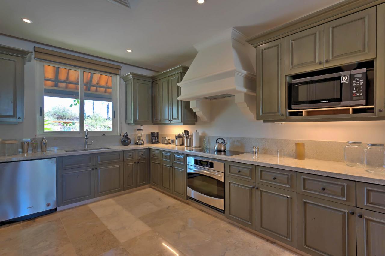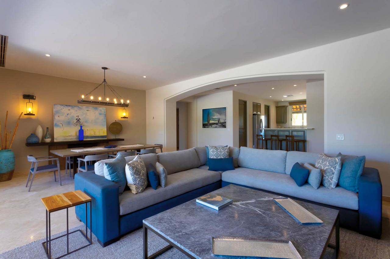 Esperanza Villa 2601 has a gourmet kitchen equipped with professional stainless steel appliances and all the toys needed to create 5-star meals. Guests can either eat their meals at the breakfast bar in the kitchen or at the formal dining table that seats eight guests. The dining area flows into the living area with an open concept. In the living room, there is a plush L-shaped sofa and a large TV. In the living and dining area, there are floor-to-ceiling windows that can be opened out to a patio that faces the Esperanza gardens. On the patio, there is a table that can seat six guests.
