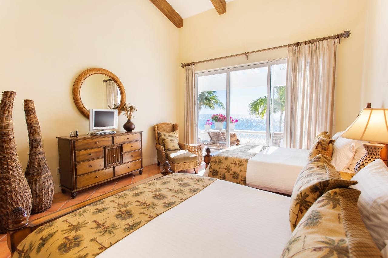 - Bedroom 2: Two queen beds, en suite bathroom, ceiling fan, TV, ocean view
