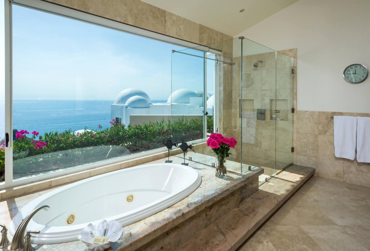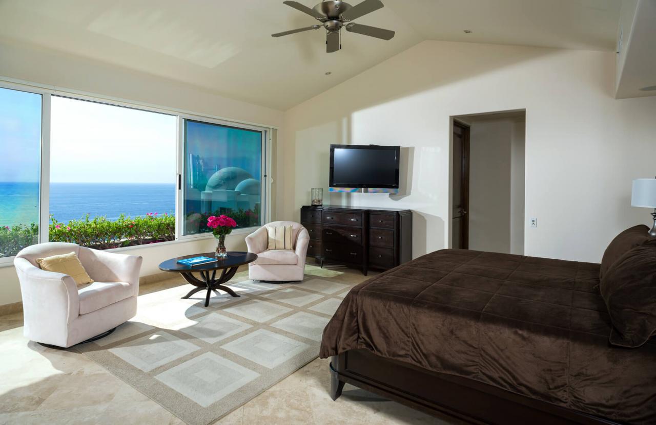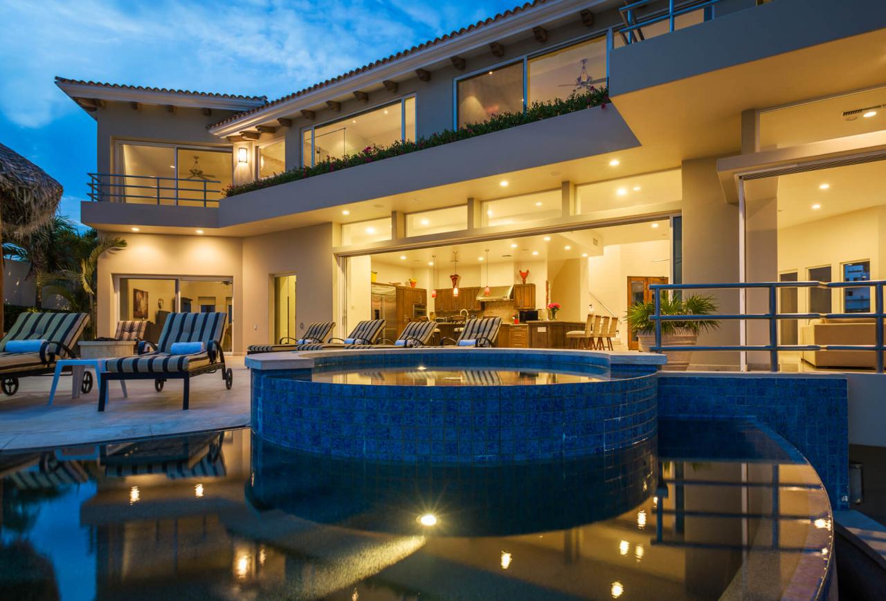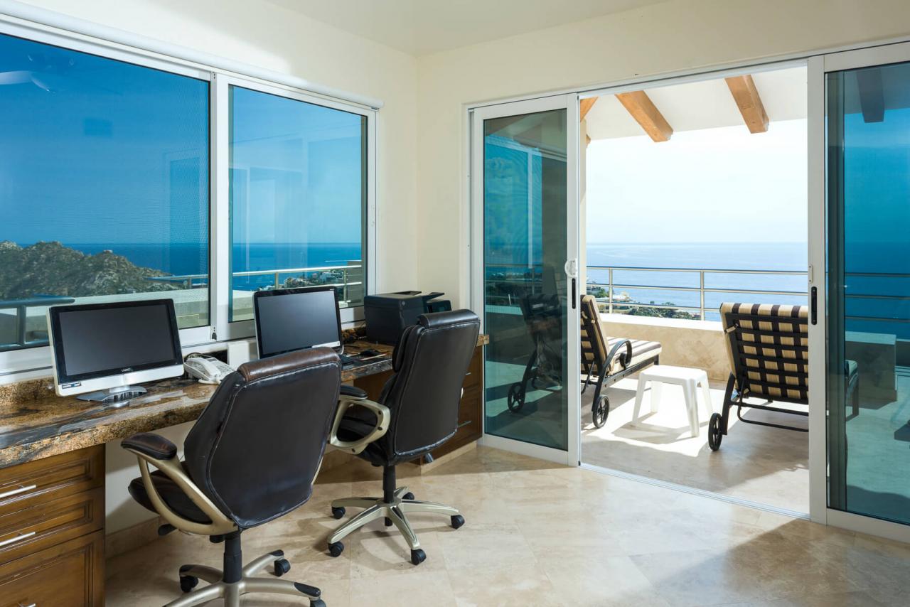 Villa del Mar has many other amenities. There is an office with all necessities such as internet, computer, phone, and fax. This Cabo villa rental also has an entertainment room with a big-screen TV, surround sound, and deluxe loungers, a fitness suite with top-of-the-line exercise equipment, a beautiful cedar sauna, and a separate commercial elevator.