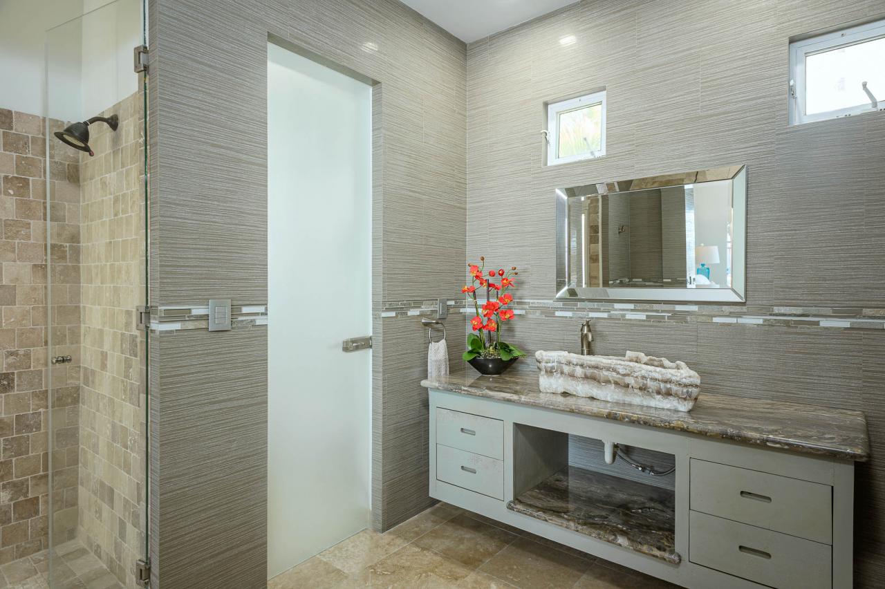 The outside of Villa Devine exudes a sense of sophistication, as double doors lead guests through a private landscaped courtyard, before extending out to the blue water and sand beyond. Villa Devine offers different opportunities to enjoy its outdoor space, with six deck loungers, a built-in firepit with seating, a shaded outdoor living and dining space, and sweeping views of the waterfront. Villa Devine also opens to a comfortable living room and dining room with a fashionable kitchen and professional appliances.