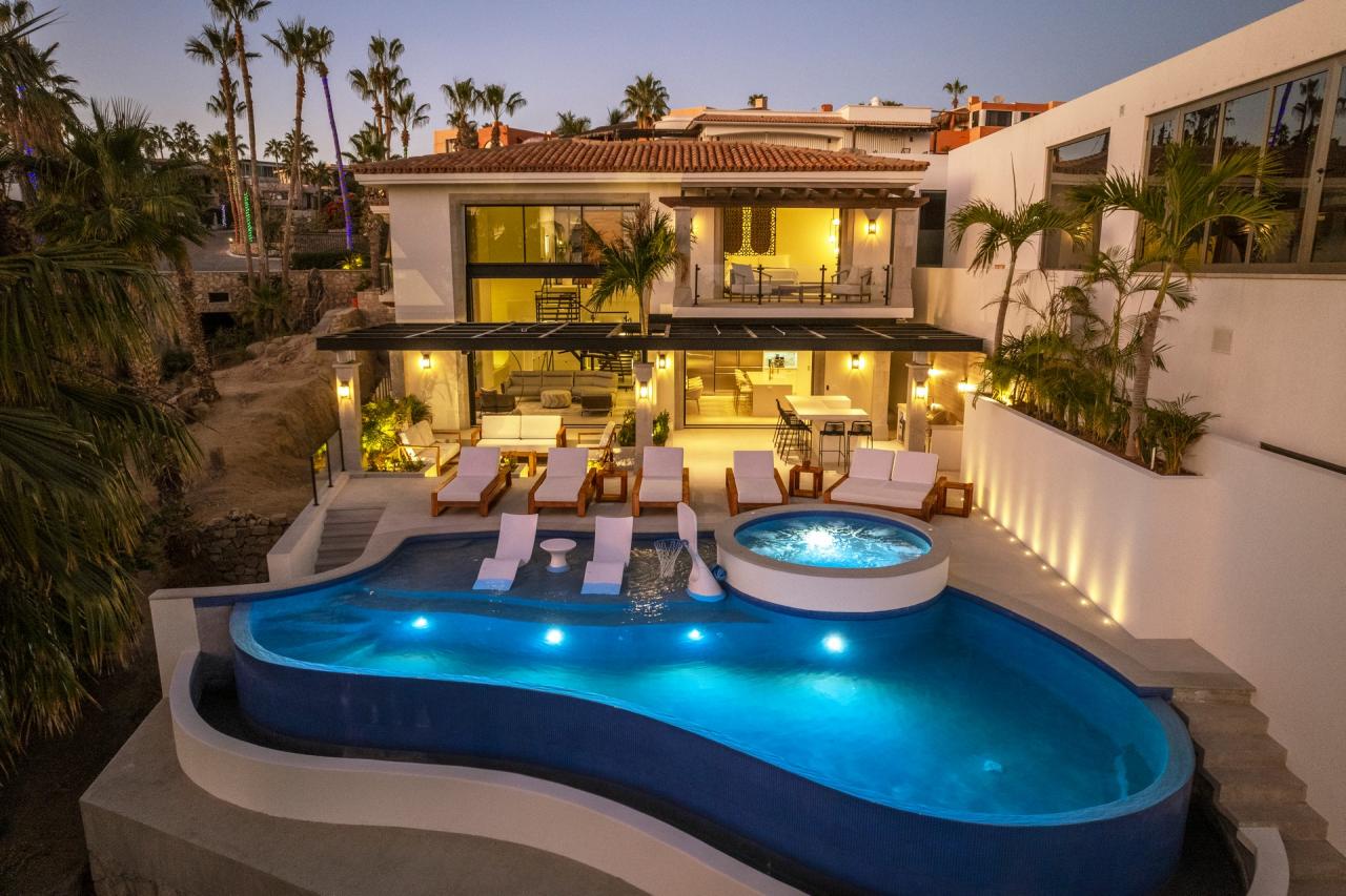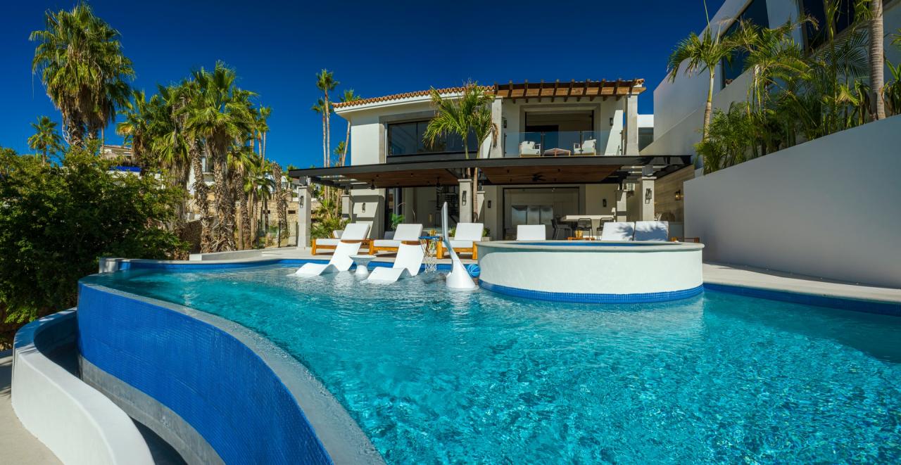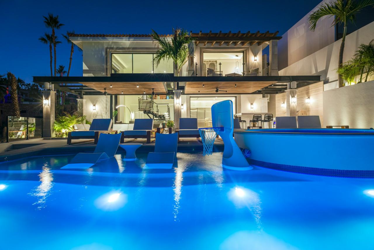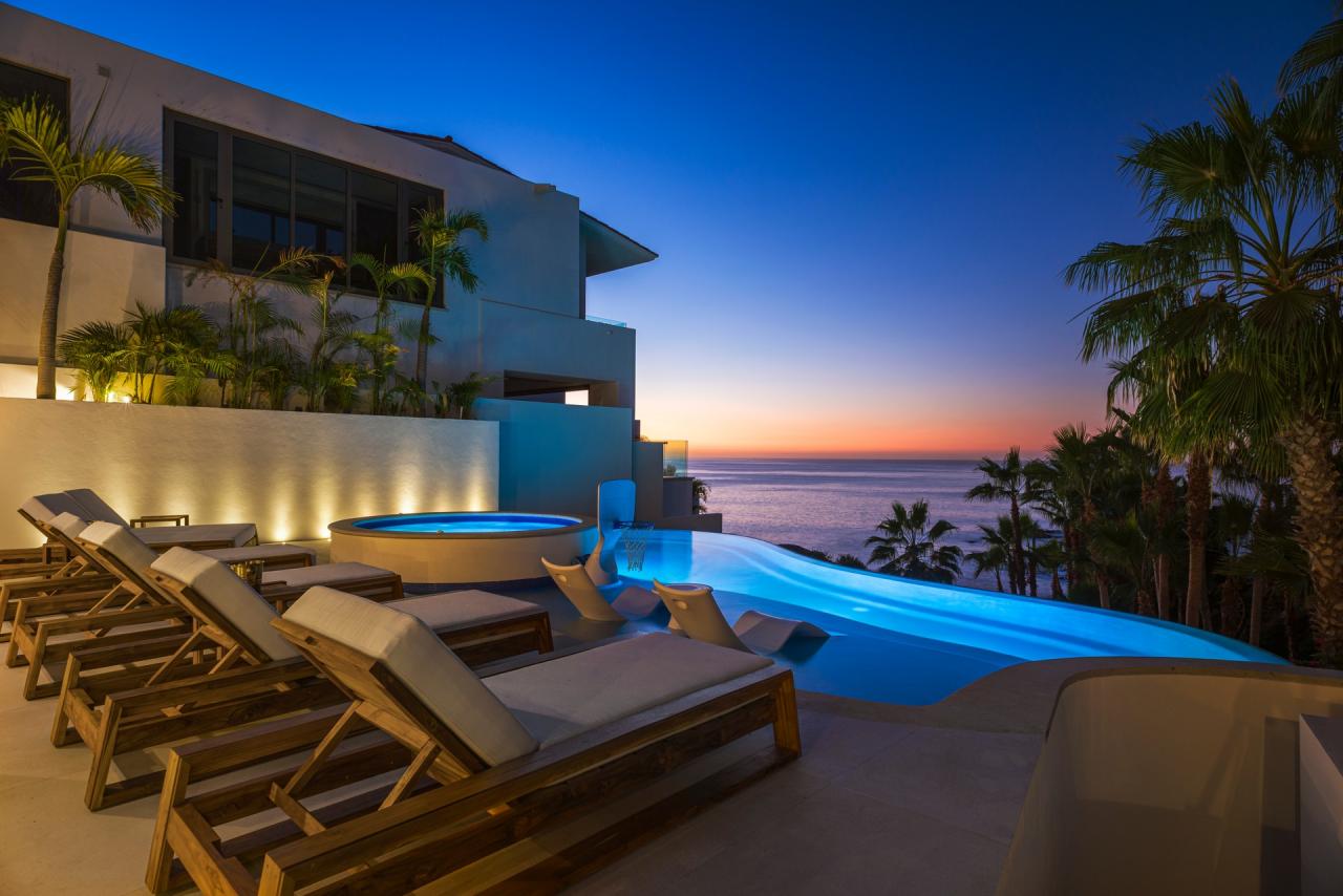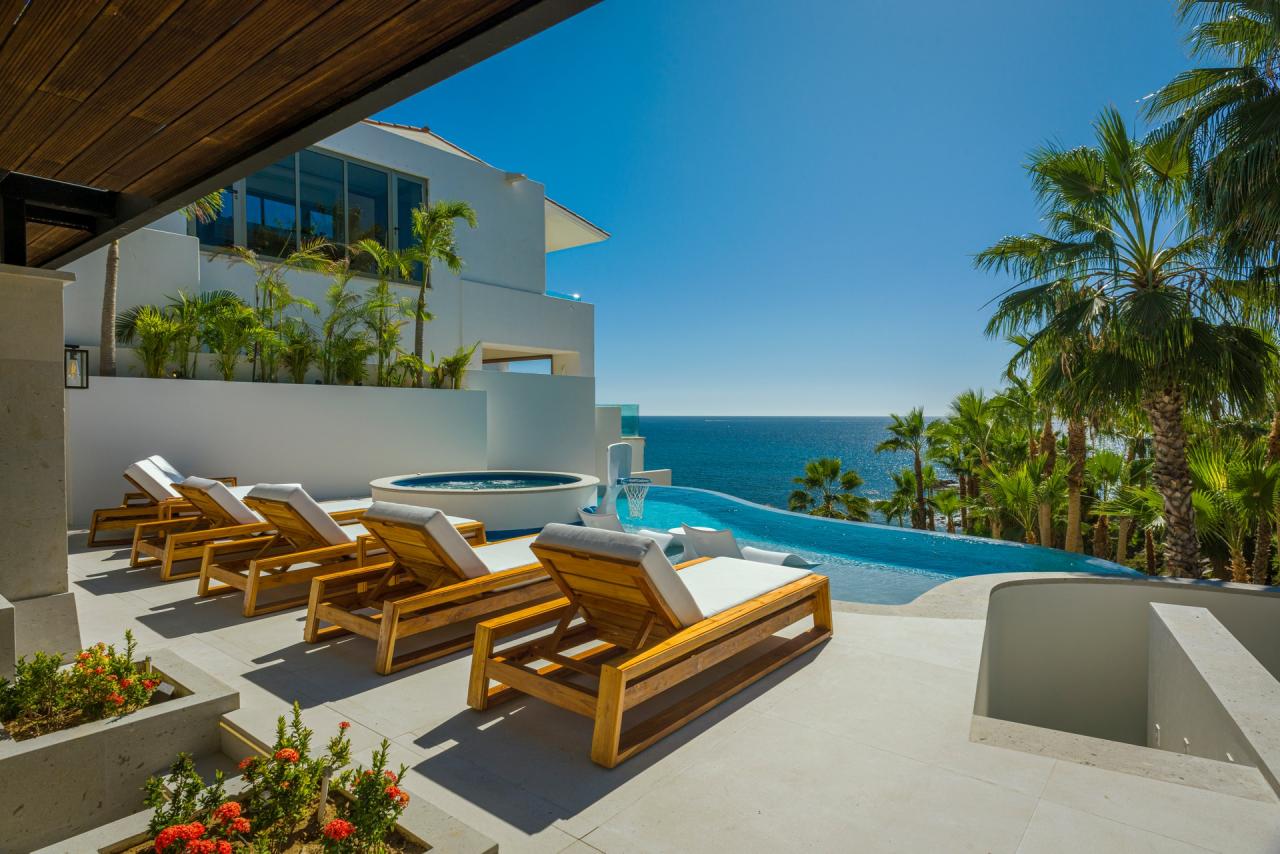 Villa Mareas is a luxurious five-bedroom villa retreat designed for sun-soaked fun and relaxation in Cabo San Lucas. This Los Cabo villa offers private, spa-like ambiance with opulent features such as a double-height sunken living room, gourmet kitchen, and walls of glass that blend indoor elegance with stunning outdoor views. Accommodating up to 10 guests, the villa boasts a partially shaded main pool deck, complete with a sunning pool, Jacuzzi, outdoor grilling area, and a conversation space. Guests can enjoy cocktails at the outdoor bar or dine inside, surrounded by sophisticated touches like a marble dining table, a sleek kitchen island, and chef-caliber appliances. Family-friendly amenities include a stereo system, pool basketball, and palm-framed vistas of the ocean and sunset.