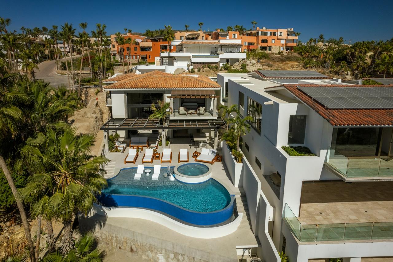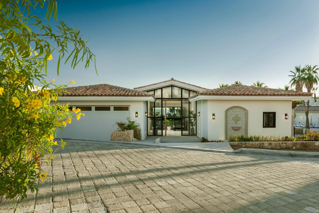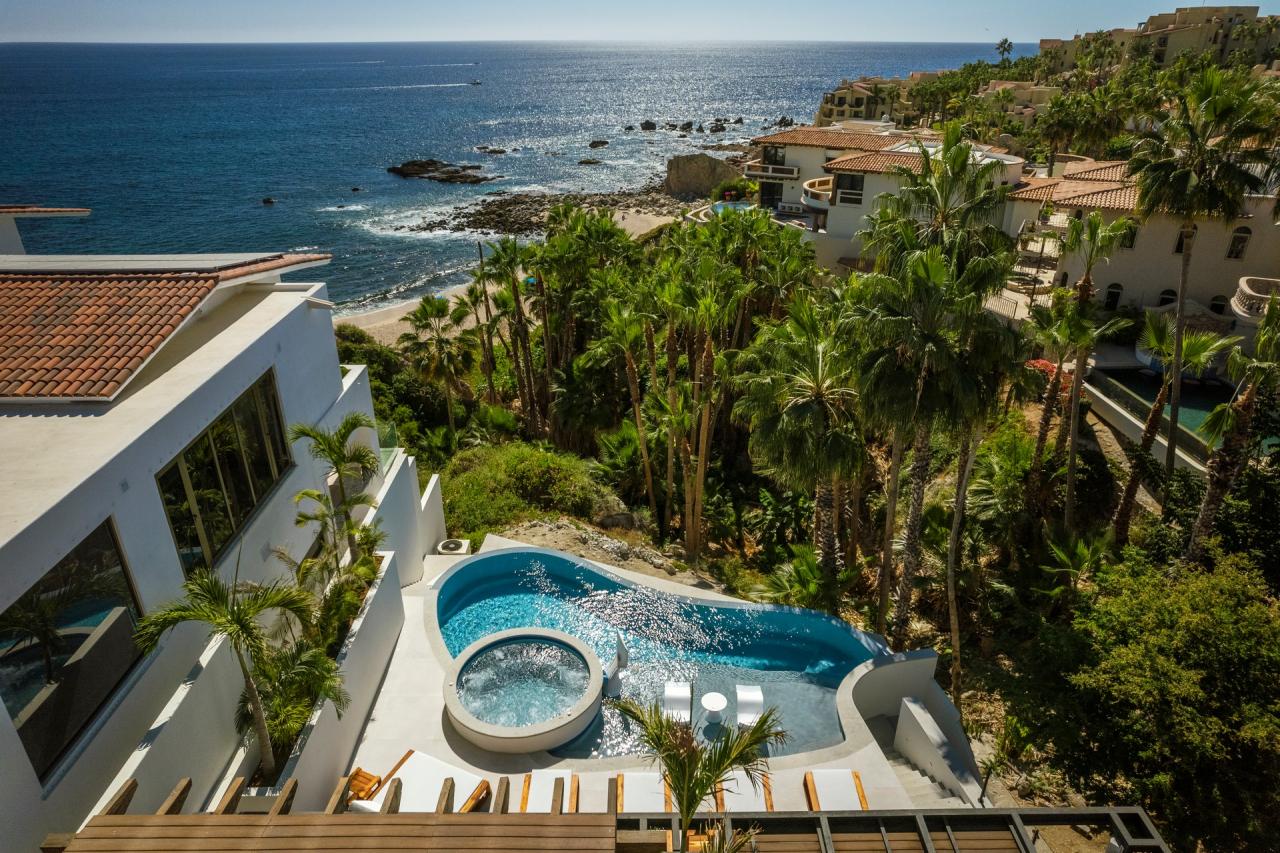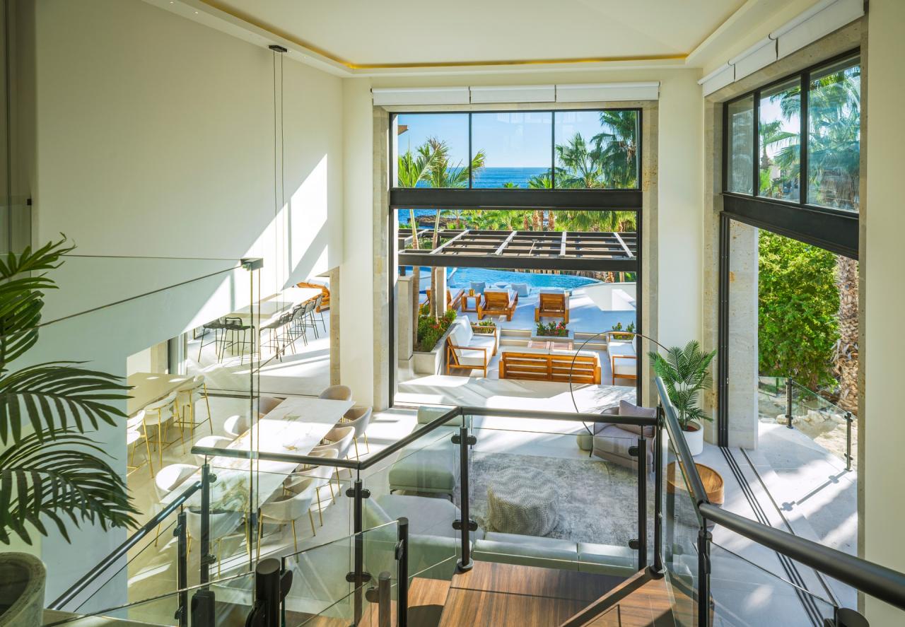 Villa Mareas is a luxurious five-bedroom villa retreat designed for sun-soaked fun and relaxation in Cabo San Lucas. This Los Cabo villa offers private, spa-like ambiance with opulent features such as a double-height sunken living room, gourmet kitchen, and walls of glass that blend indoor elegance with stunning outdoor views. Accommodating up to 10 guests, the villa boasts a partially shaded main pool deck, complete with a sunning pool, Jacuzzi, outdoor grilling area, and a conversation space. Guests can enjoy cocktails at the outdoor bar or dine inside, surrounded by sophisticated touches like a marble dining table, a sleek kitchen island, and chef-caliber appliances. Family-friendly amenities include a stereo system, pool basketball, and palm-framed vistas of the ocean and sunset.