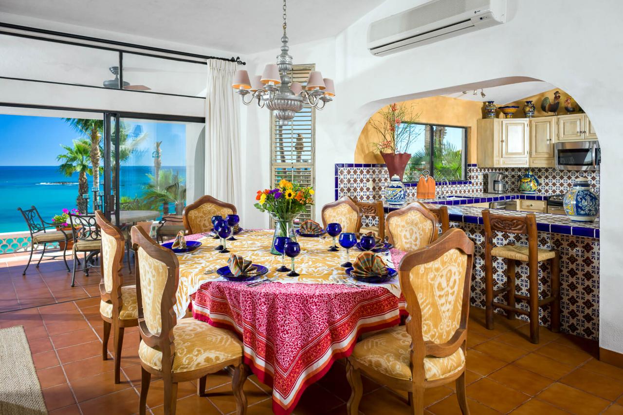 Next to the living and dining areas there is a fully equipped kitchen. The room’s beautiful Mexican tiles are complimented by warm woods.