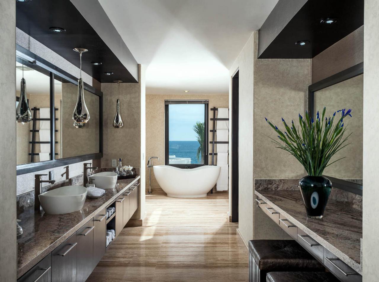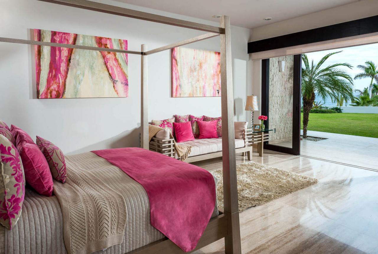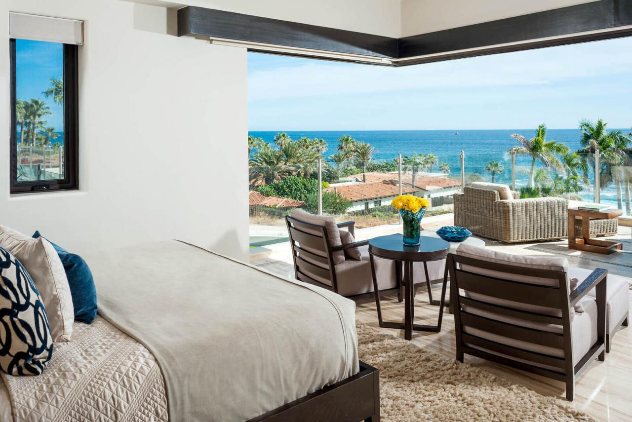 This Los Cabos villa boasts seven beautifully decorated bedroom suites, each offering a serene atmosphere with plush bedding, soft tones, and luxurious linens. The master suite, a true showpiece, features a king-sized bed, a private lounge area, and panoramic ocean views. Its spa-like ensuite bath includes floating sinks, teardrop glass fixtures, and a freestanding tub positioned to take in the stunning seascape. For the ultimate relaxation, guests can enjoy the villa’s private spa suite, complete with a sauna, steam room, massage bed, and salon-style amenities. Villa Renata also features a chic media room, an elegant study, and an open-concept living area with designer décor, a wet bar, and floor-to-ceiling pocket doors that invite in the ocean breeze.