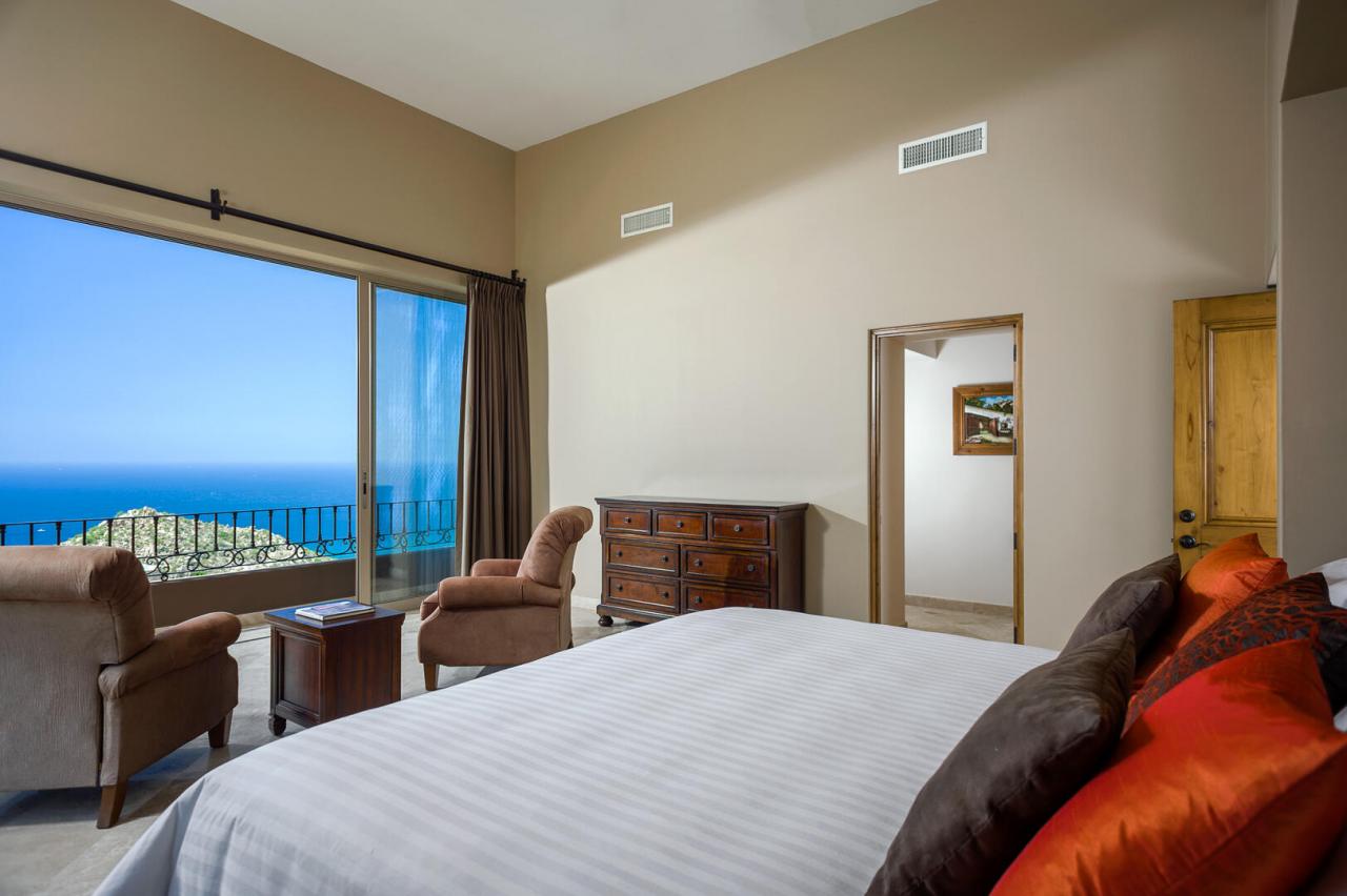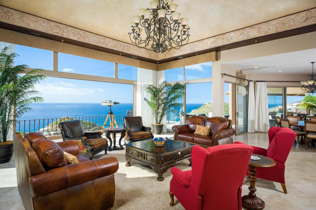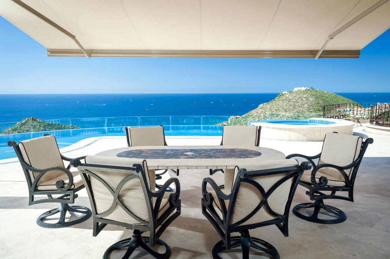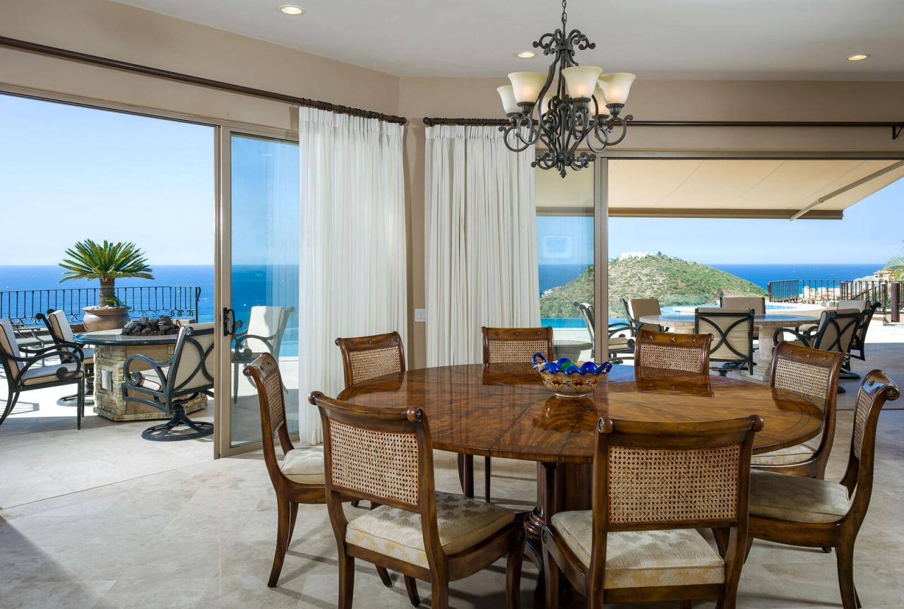 Upscale rich leather and wood furnishings adorn this Los Cabos villa, from the private bedrooms to the grand living areas and the gourmet kitchen. For added convenience, the home also features a smaller kitchenette and extra living space, enhanced by the stunning views from the numerous windows and glass doors throughout. The villa includes a formal dining area with seating for up to 10 guests, overlooking the expansive outdoor space.